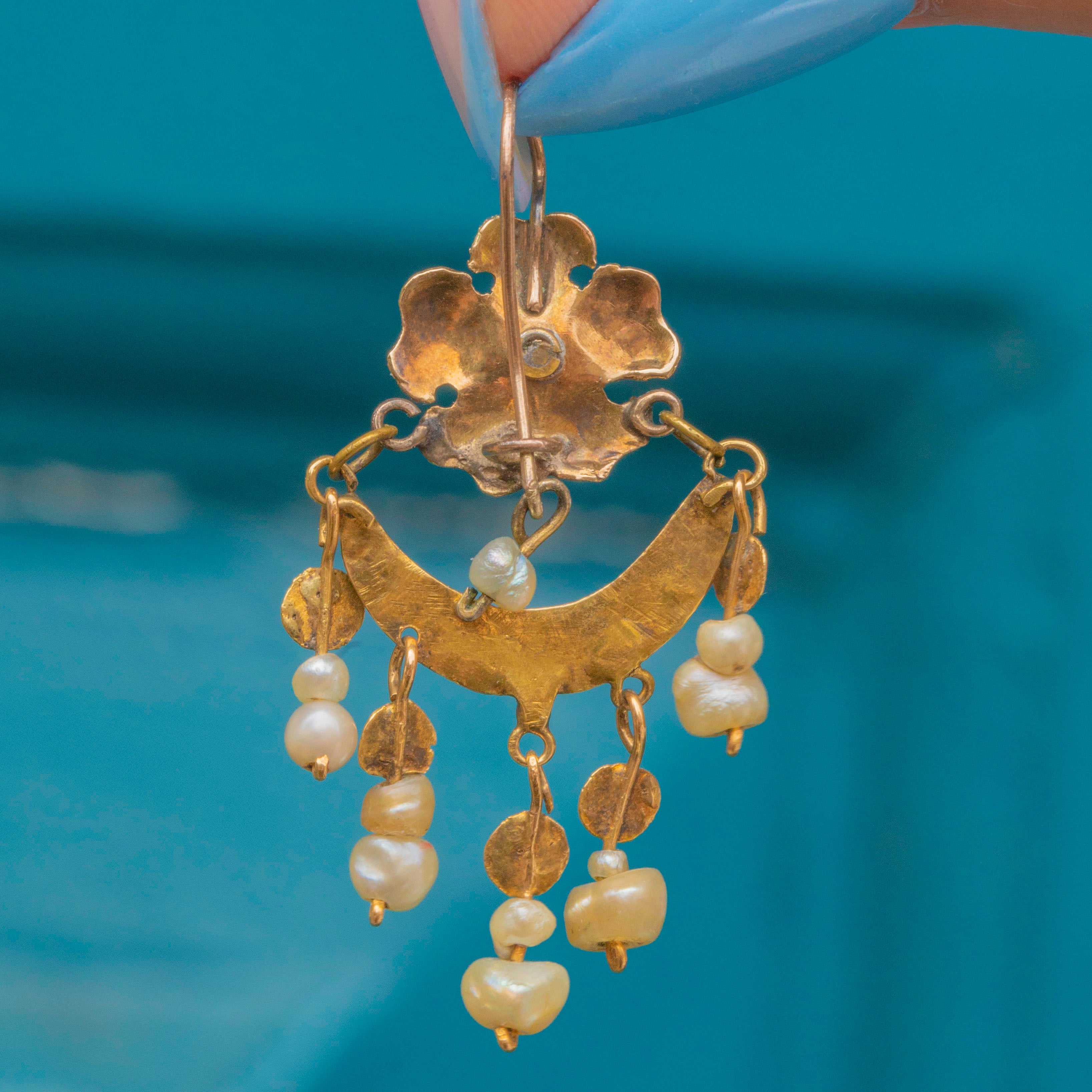 Each earring features seven iridescent Baroque Pearls which display a magnificent creamy sheen, complemented effortlessly by the warmth of the Gold. Complete with floral motifs for added Georgian charm, these antique drop earrings are a delightful pair.