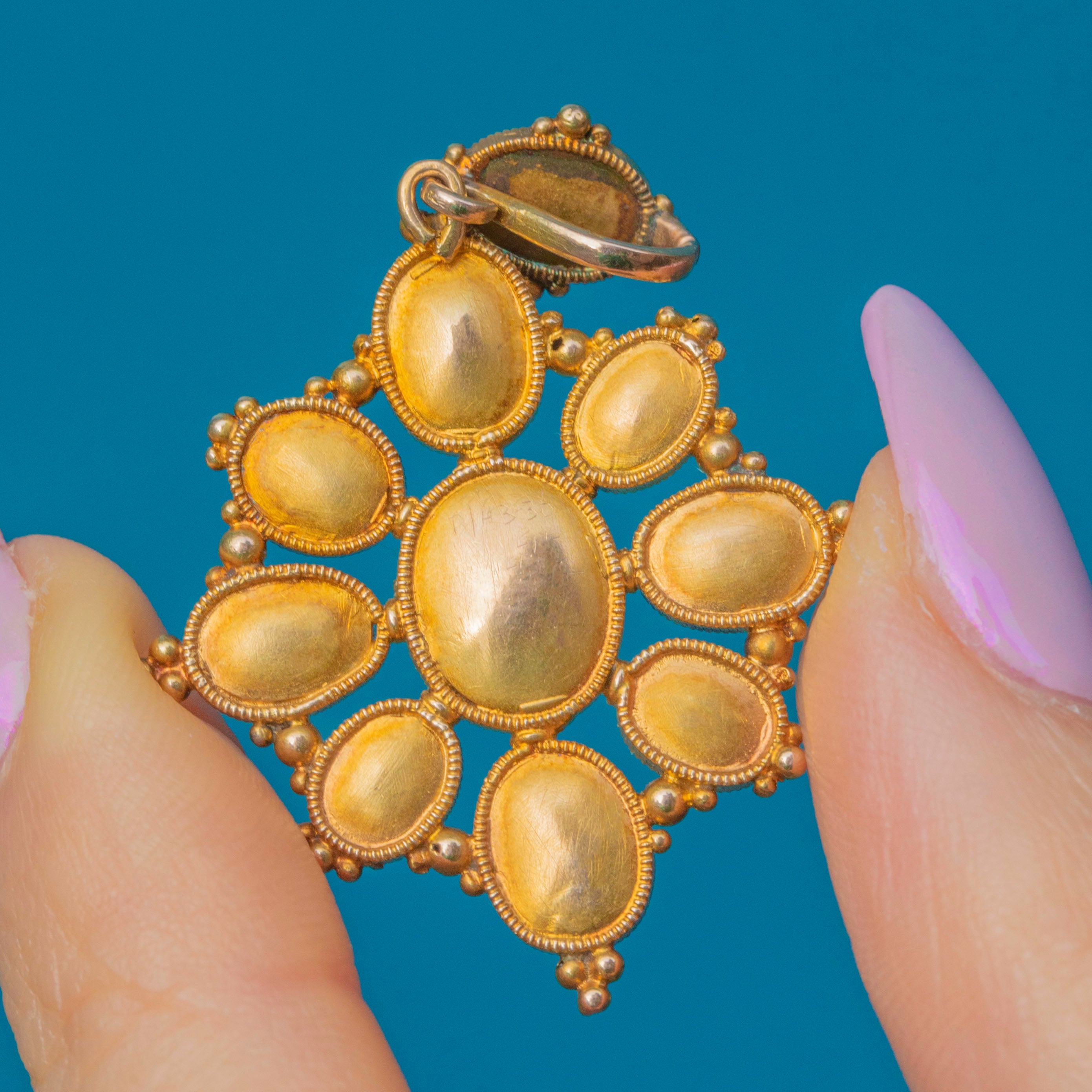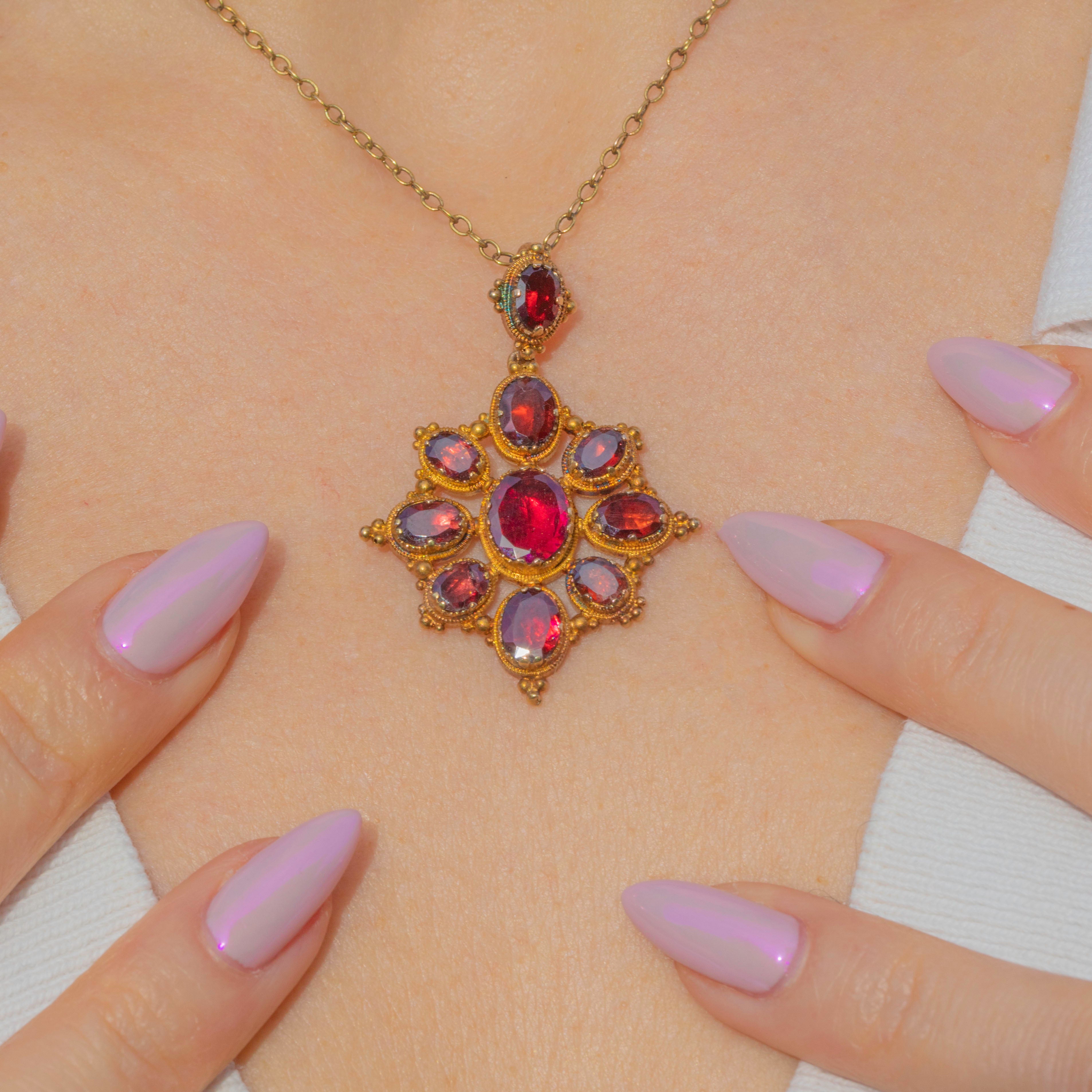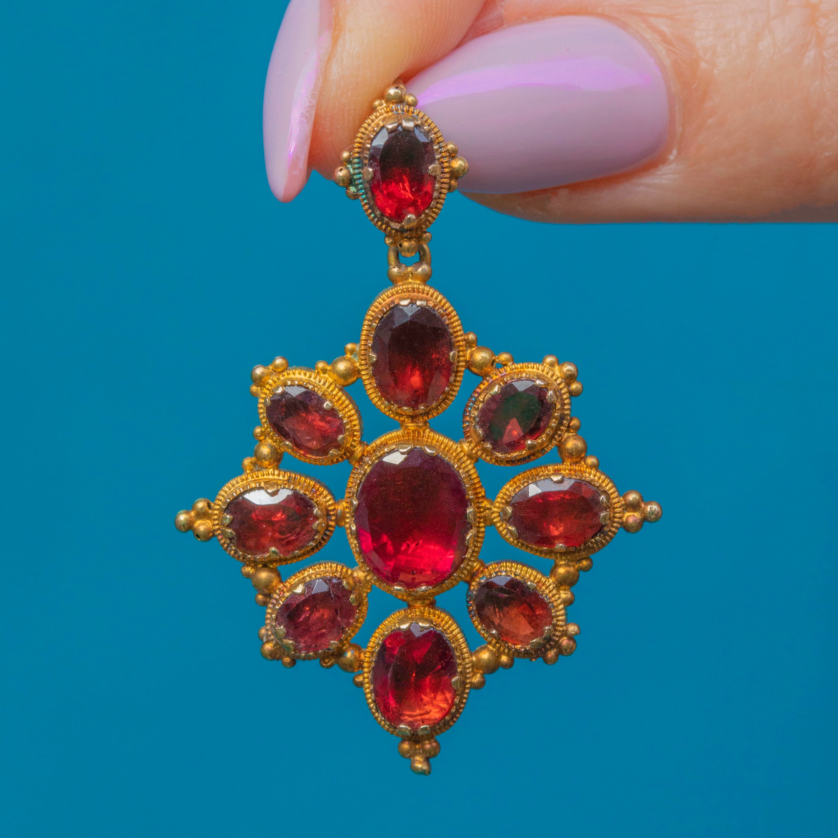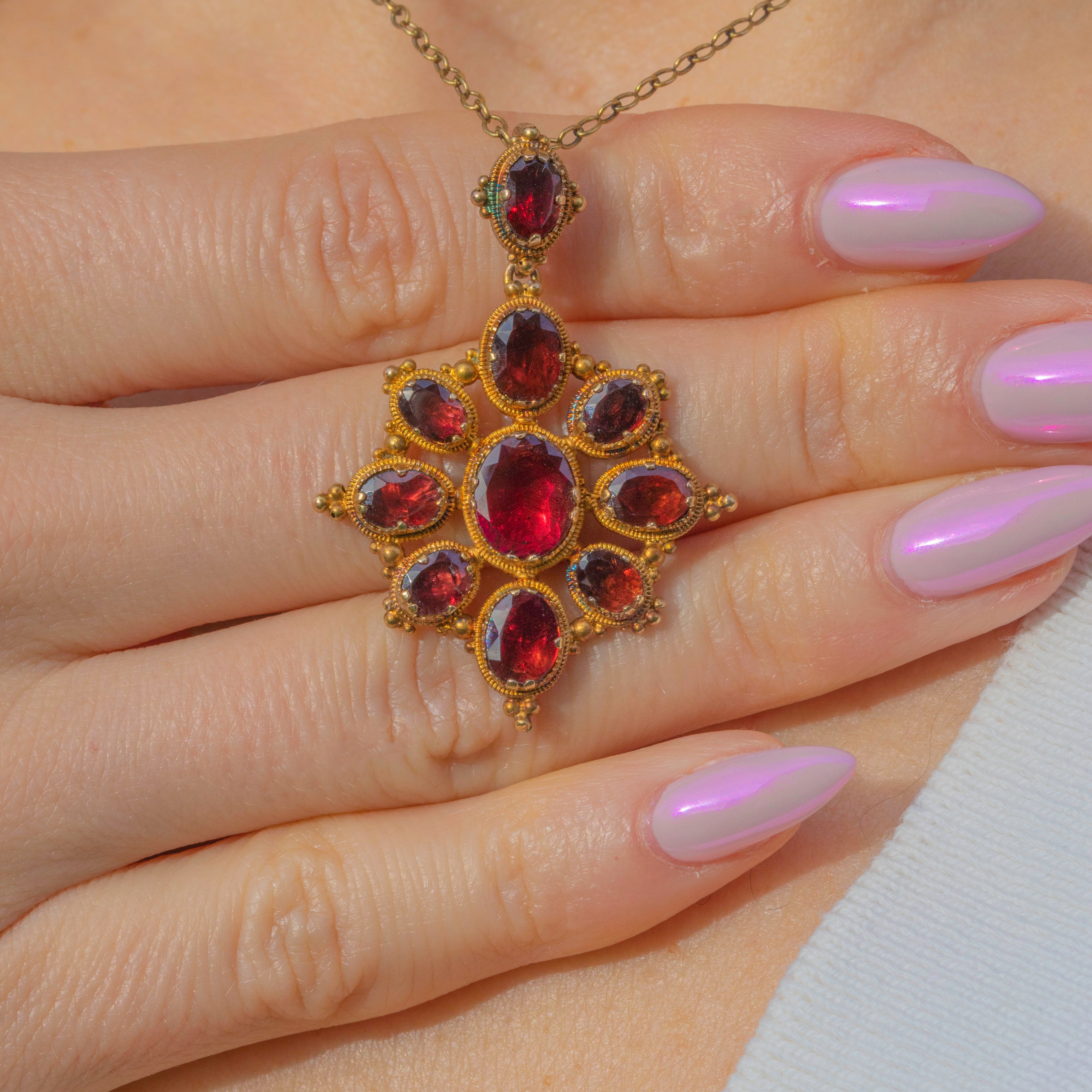This impeccable Georgian pendant, c.1820, is designed in a striking cruciform cluster set with rich red Garnets. Each stone is framed by fine cannetille and granulation details, demonstrating the skilled craftsmanship of the early 19th century.