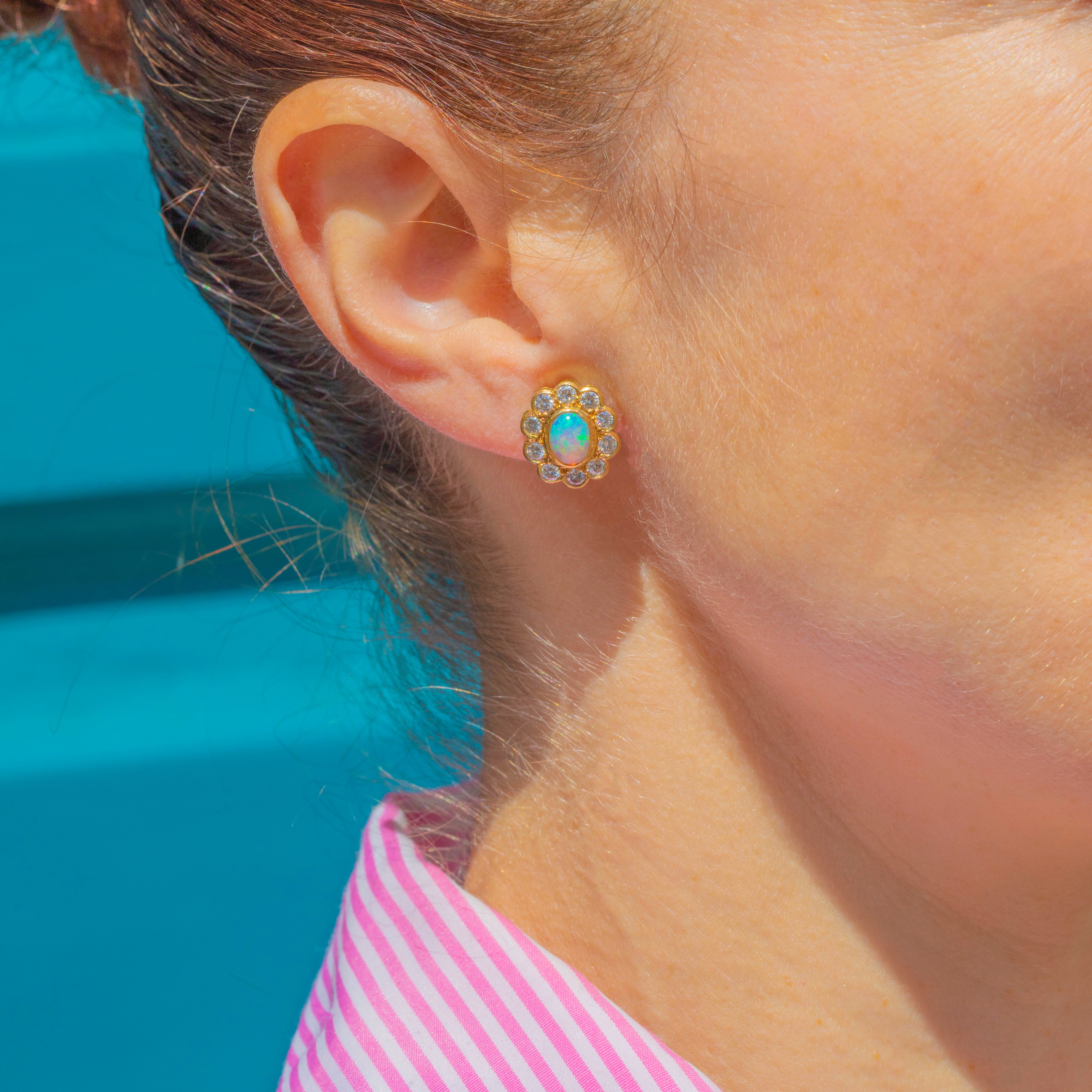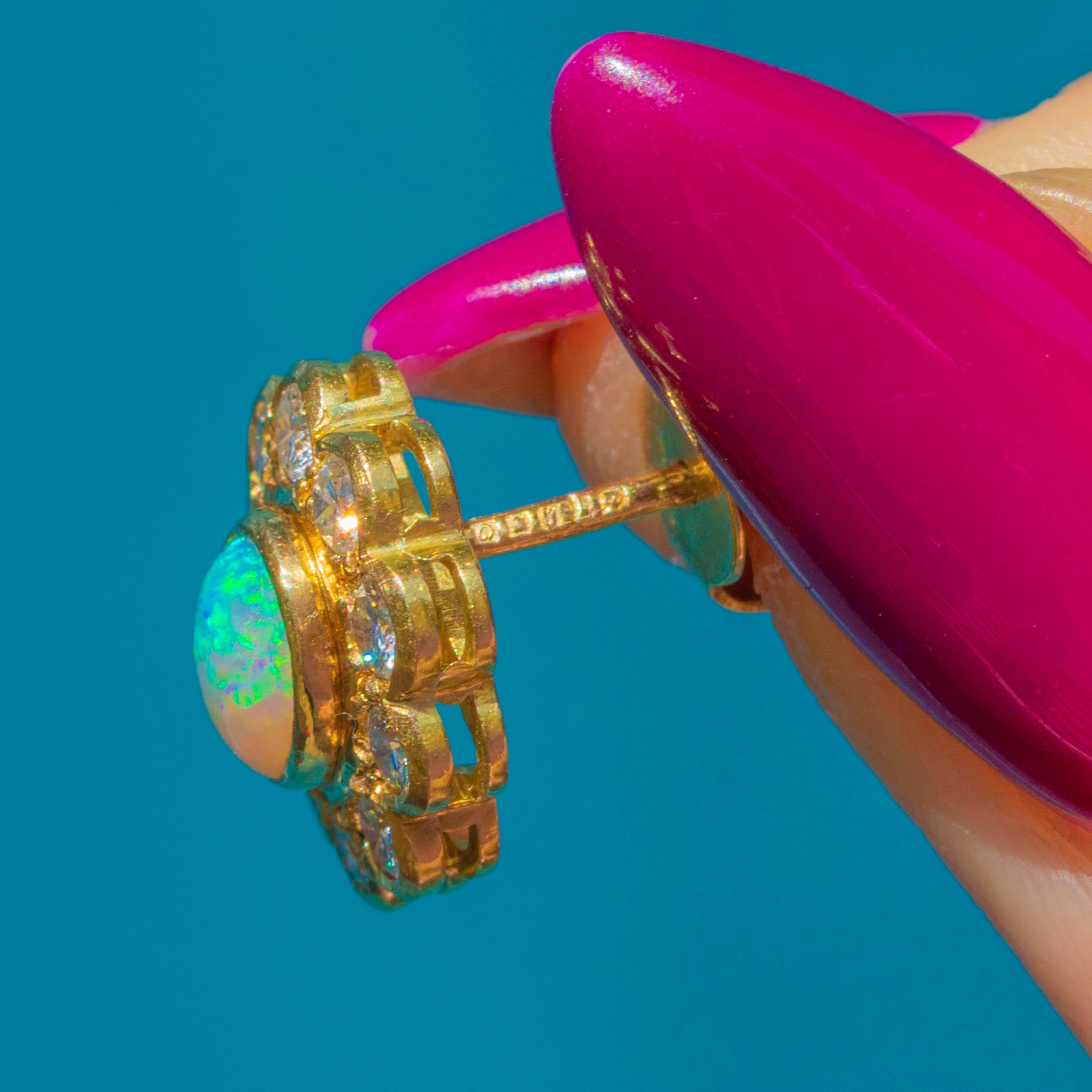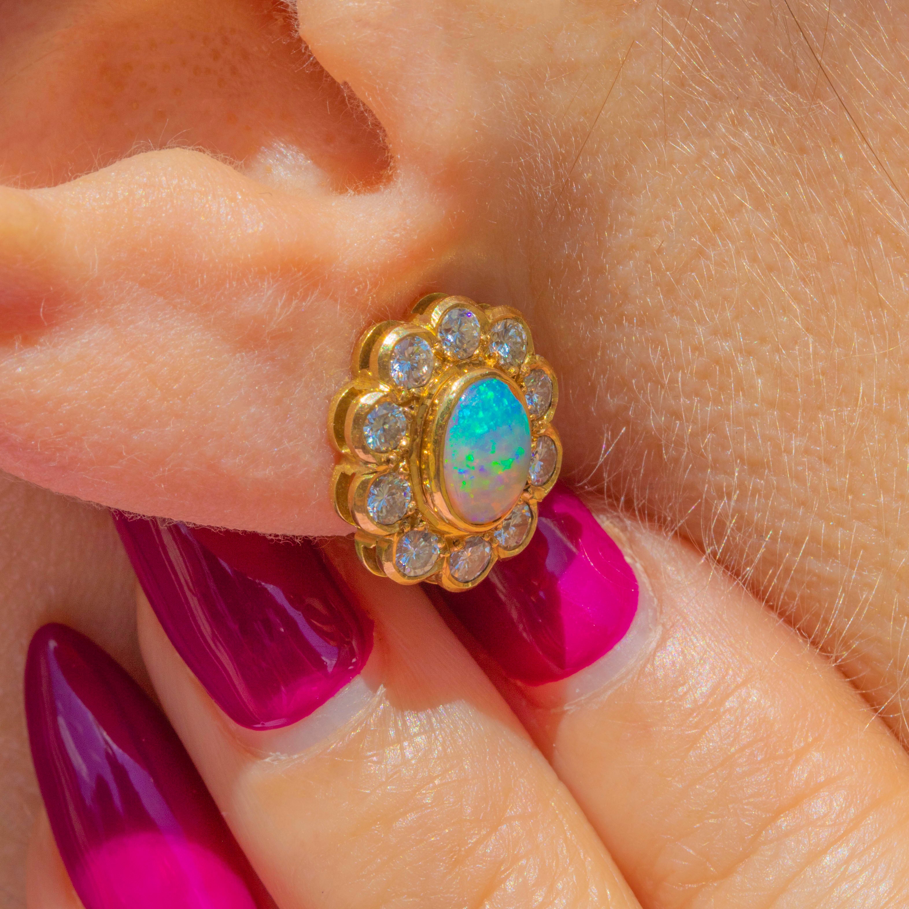 These vintage floral earrings each feature an iridescent Opal in their centre, radiating a kaleidoscope of blues, greens and striking orange hues as they catch the light. Each Opal is encircled by a halo of scintillating Diamonds, boasting 1.00ct combined and dazzling from every angle.