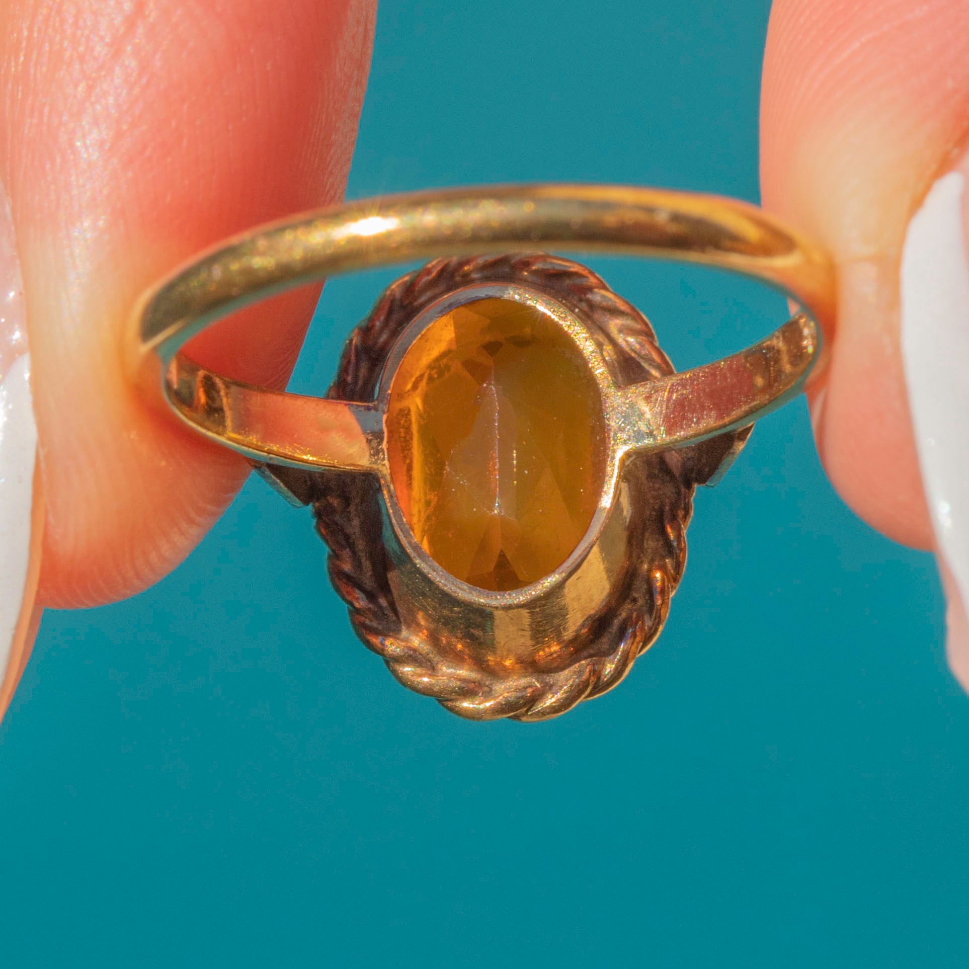 VERY GOOD-EXCELLENT: With a securely set fire Opal, a sturdy Gold band, and all claws present, this 9ct Gold Fire Opal dress ring is in lovely condition! Although there is a tad of discolouration on the Gold, she is still glamorous and ready to be worn and enjoyed!