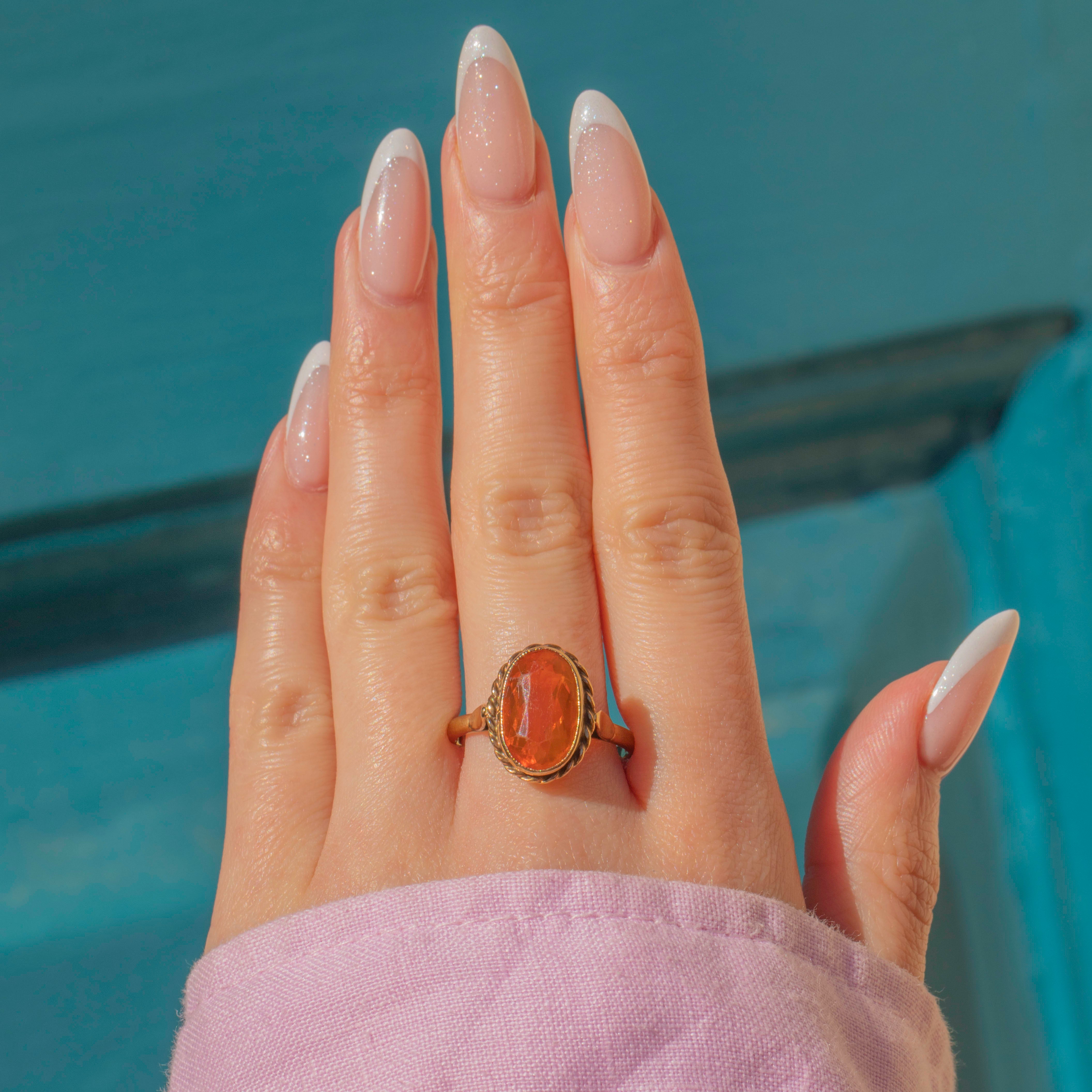 This impressive 9ct Gold Fire Opal dress ring is a feast for the eyes! A tangerine dream, her vivid fire Opal sits poised in a decorative rope border, with the light dancing across her facets.