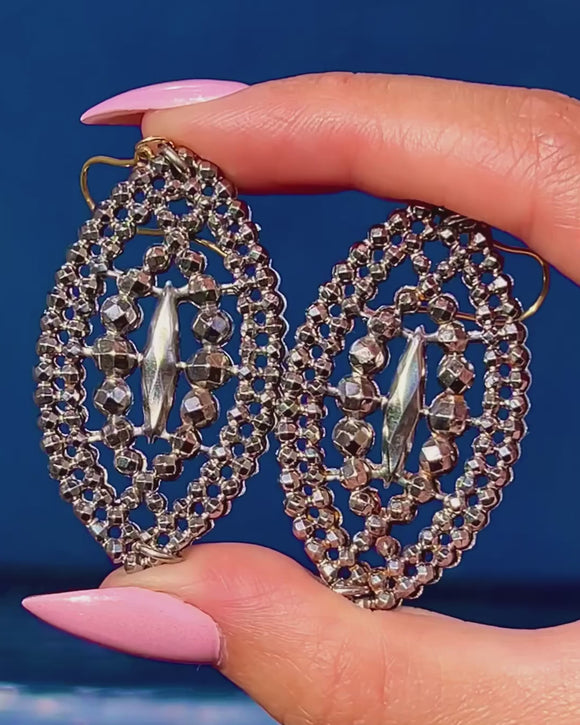These impressive Georgian cut steel drop earrings shimmer with a signature constellation of faceted studs, arranged in elegant concentric rows around an elongated navette silhouette. The openwork design gives a lace-like lightness, while the densely faceted cut steel catches and scatters the light with a captivating, mirror-bright sparkle.