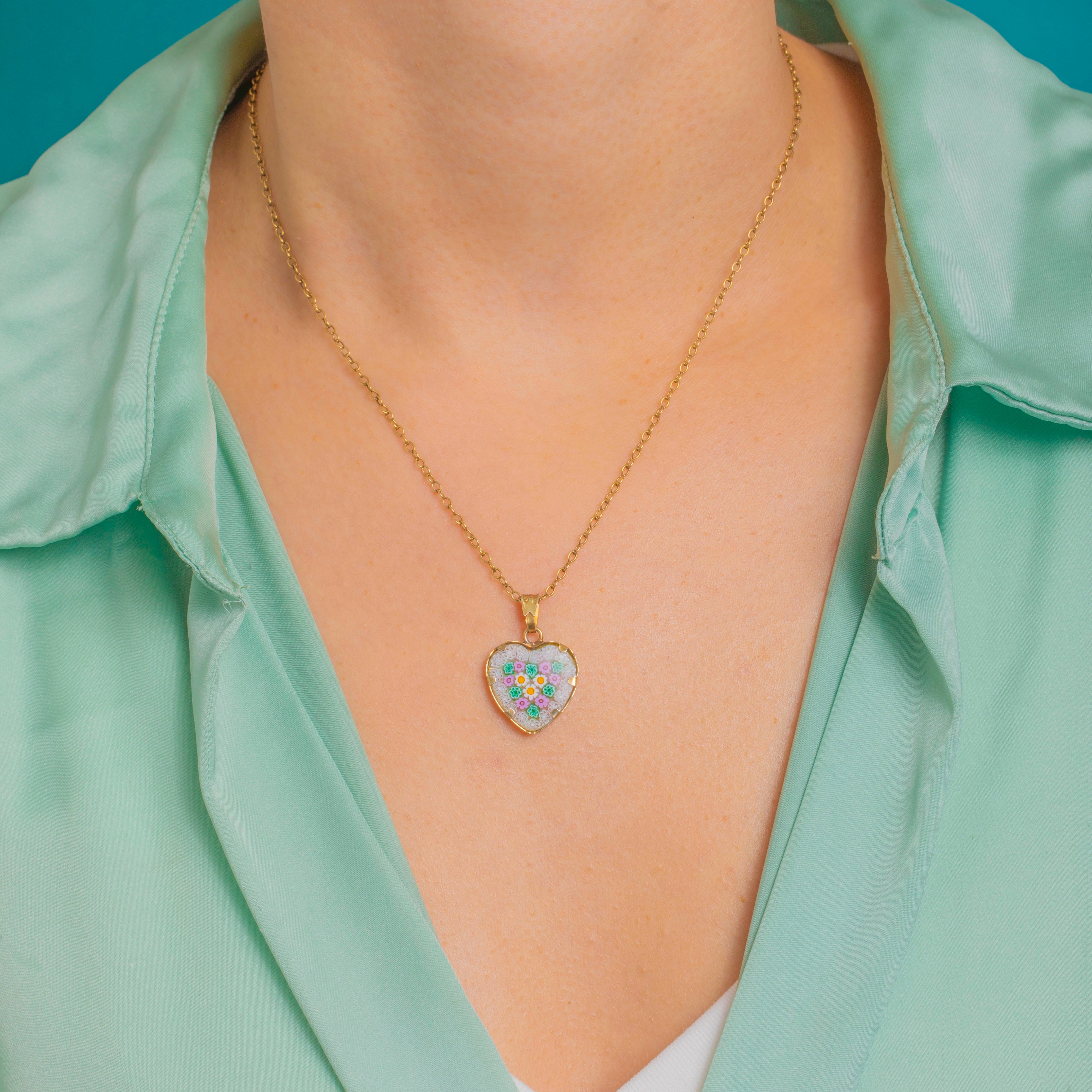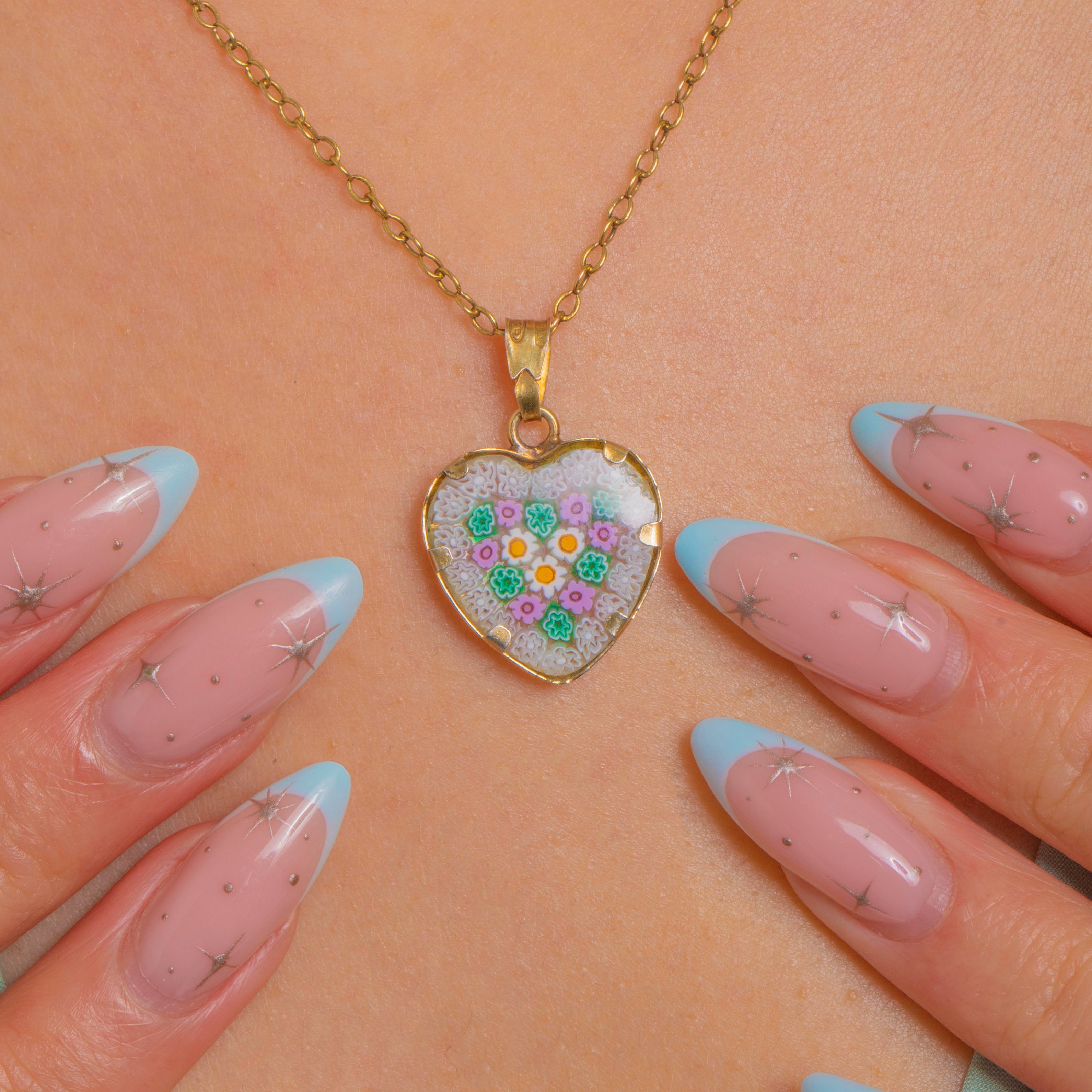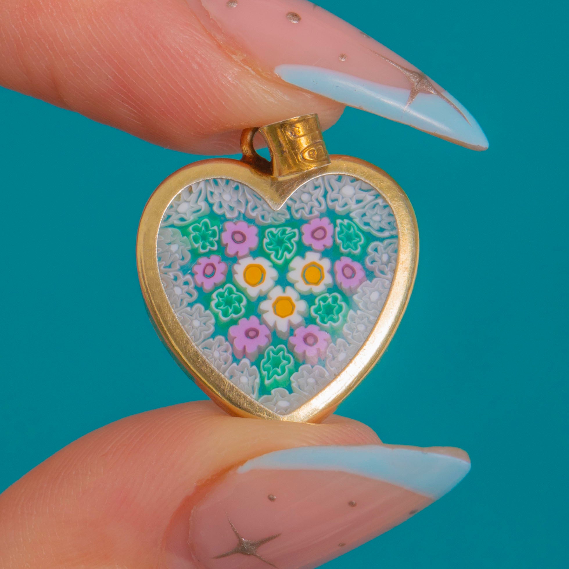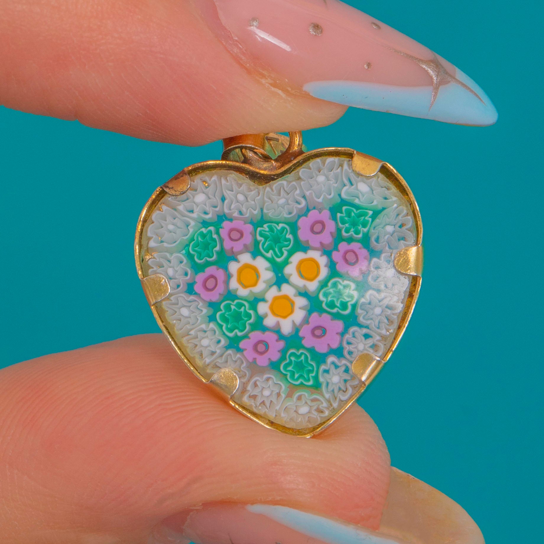 A darling Vintage heart charm showcasing a domed panel of Murano millefiori glass, brimming with tightly packed rosettes in teal and green, lilac-pink, sunshine yellow and white on a pale ground. The effect is joyful and romantic, with each tiny cane slice forming a delicate floral mosaic.