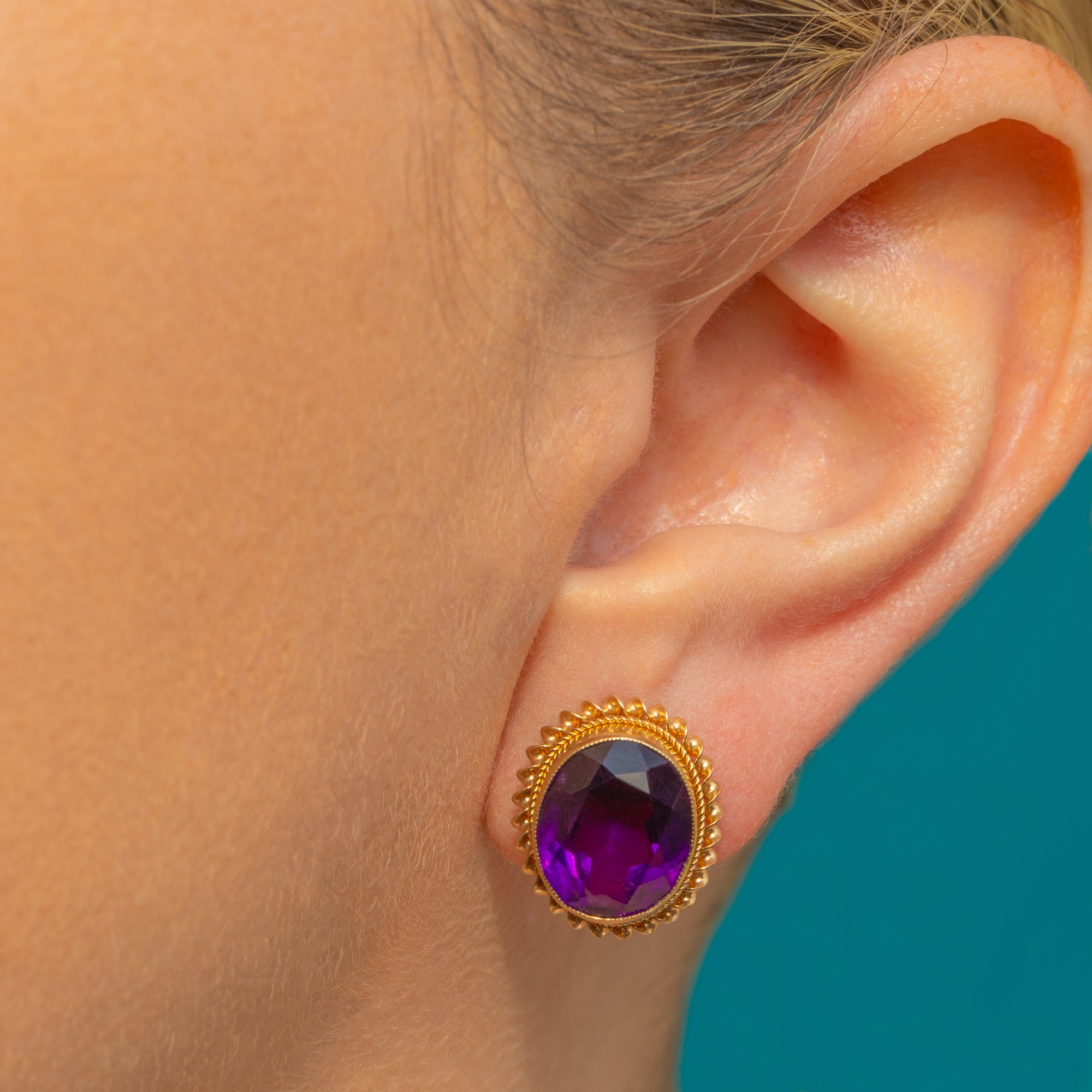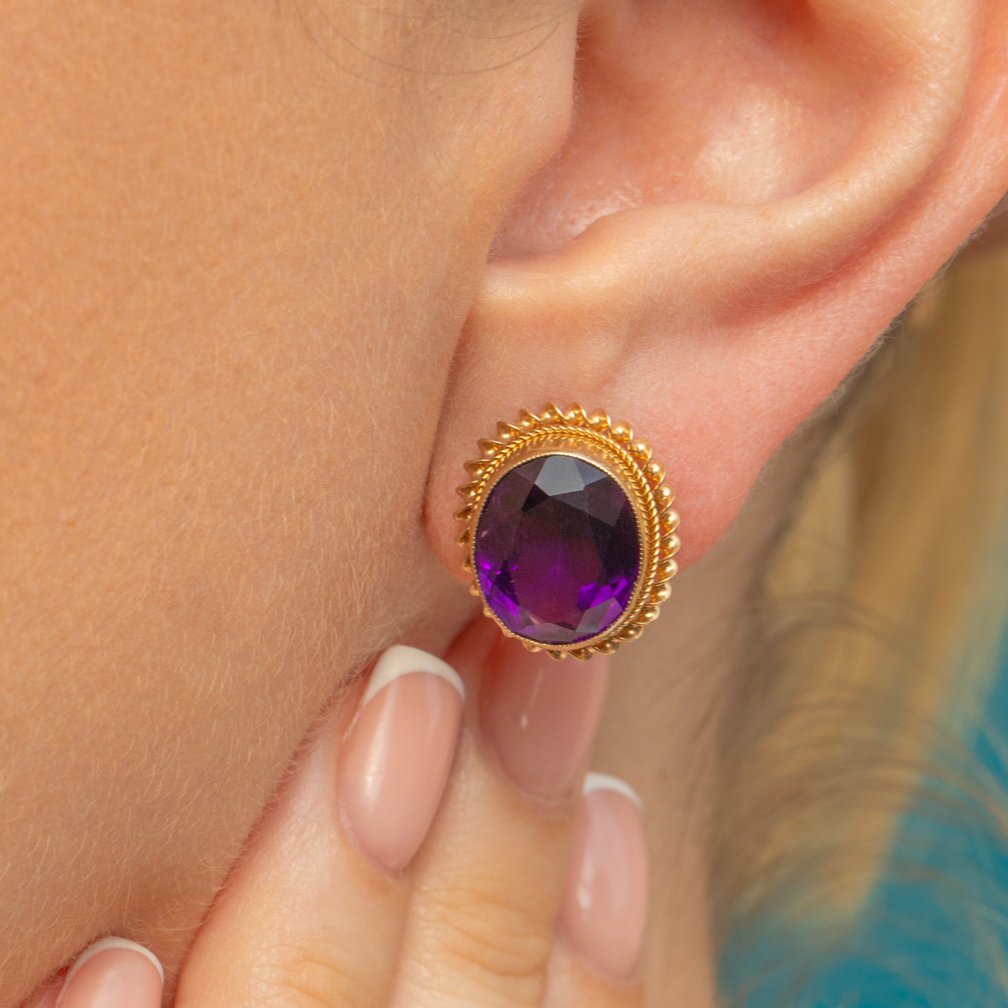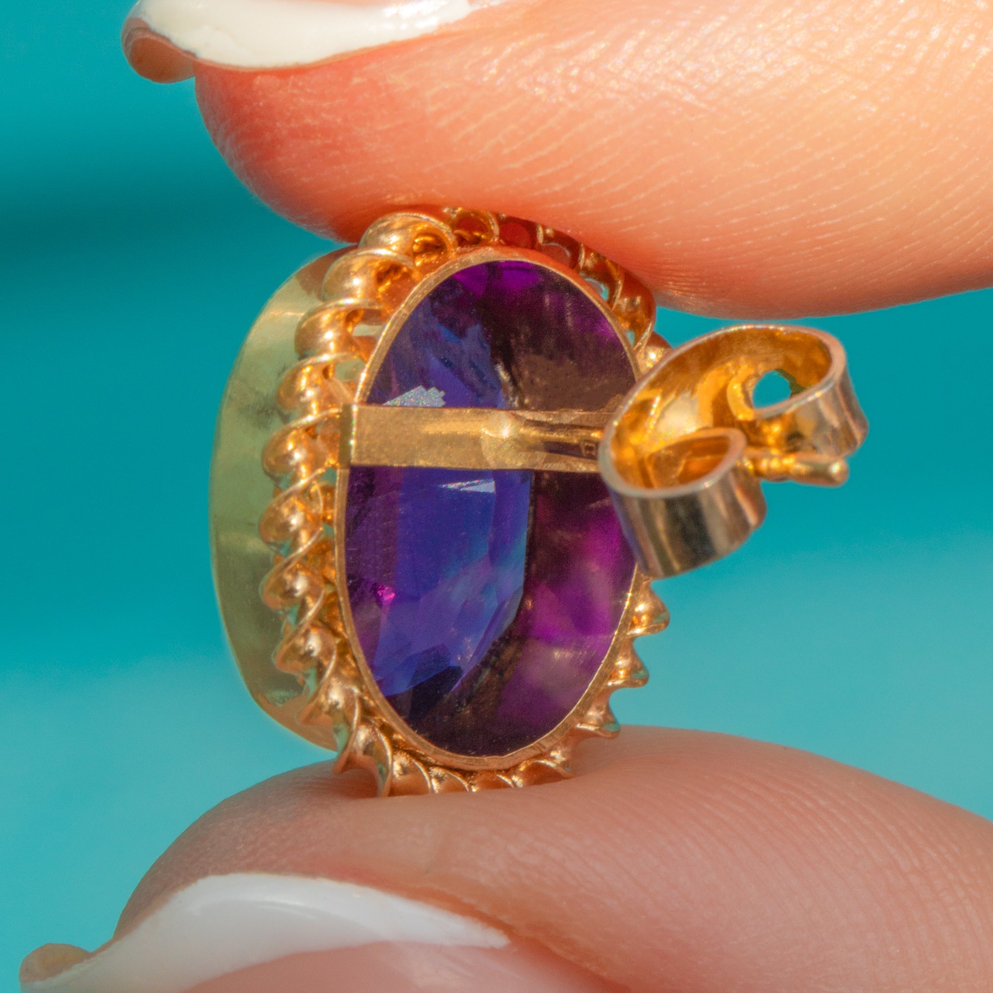 Each Amethyst is framed by intricate twisted rope detailing, crafted from some of the most saturated 9ct Gold we have seen. These light-dancing gemstones aren't just beautiful on the outside, spiritually they symbolise divine purity and are said to enhance enlightenment. These factors make them the perfect vintage Gold stud earrings to keep snug in your ear lobes day to day, and keep close contact with your skin at all times!