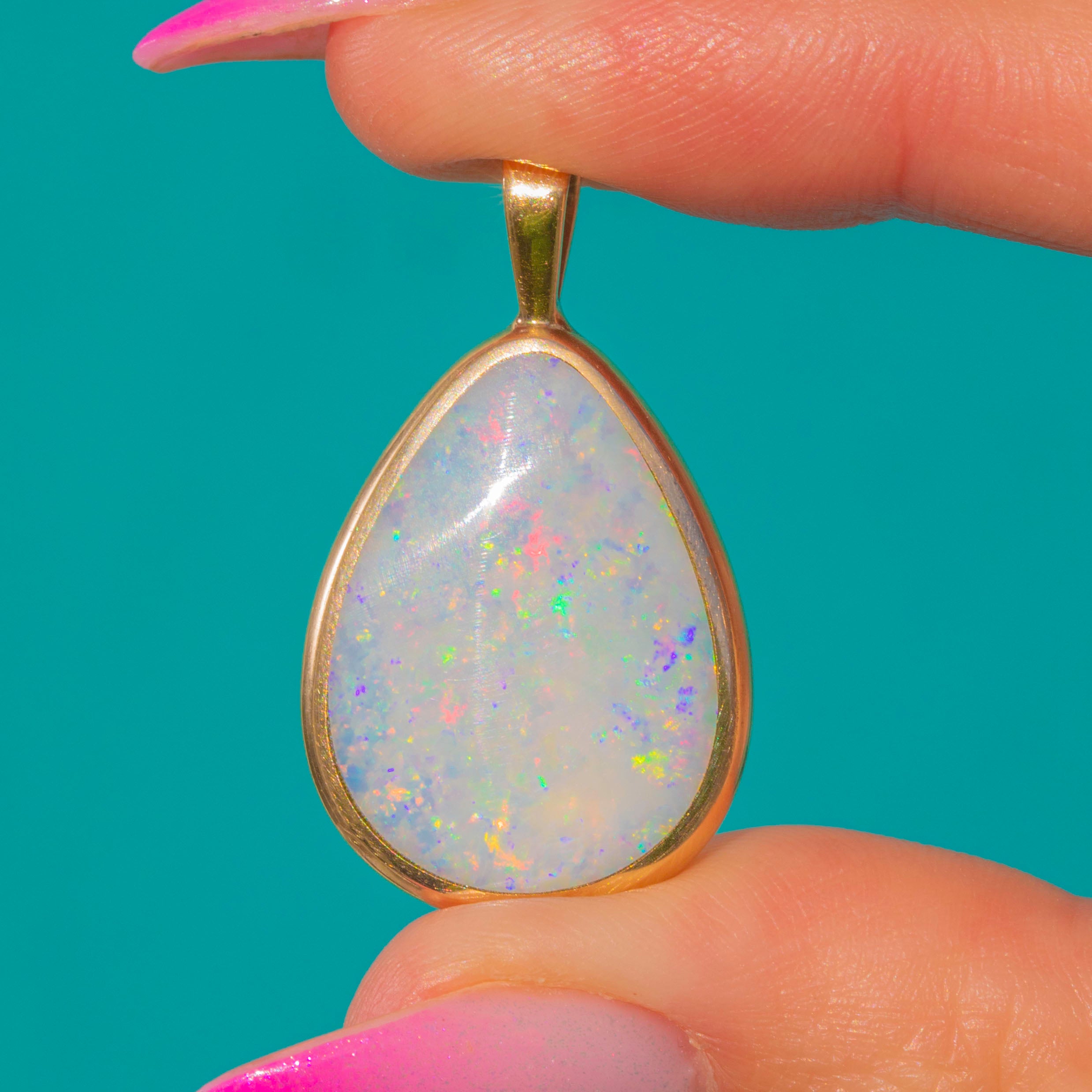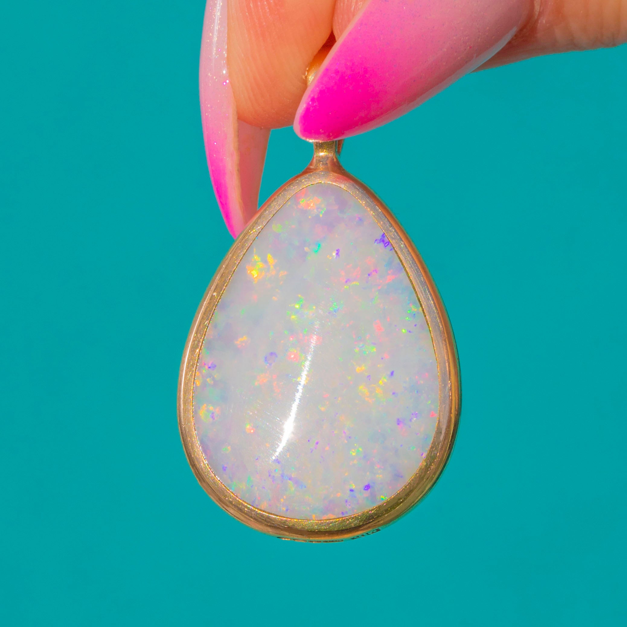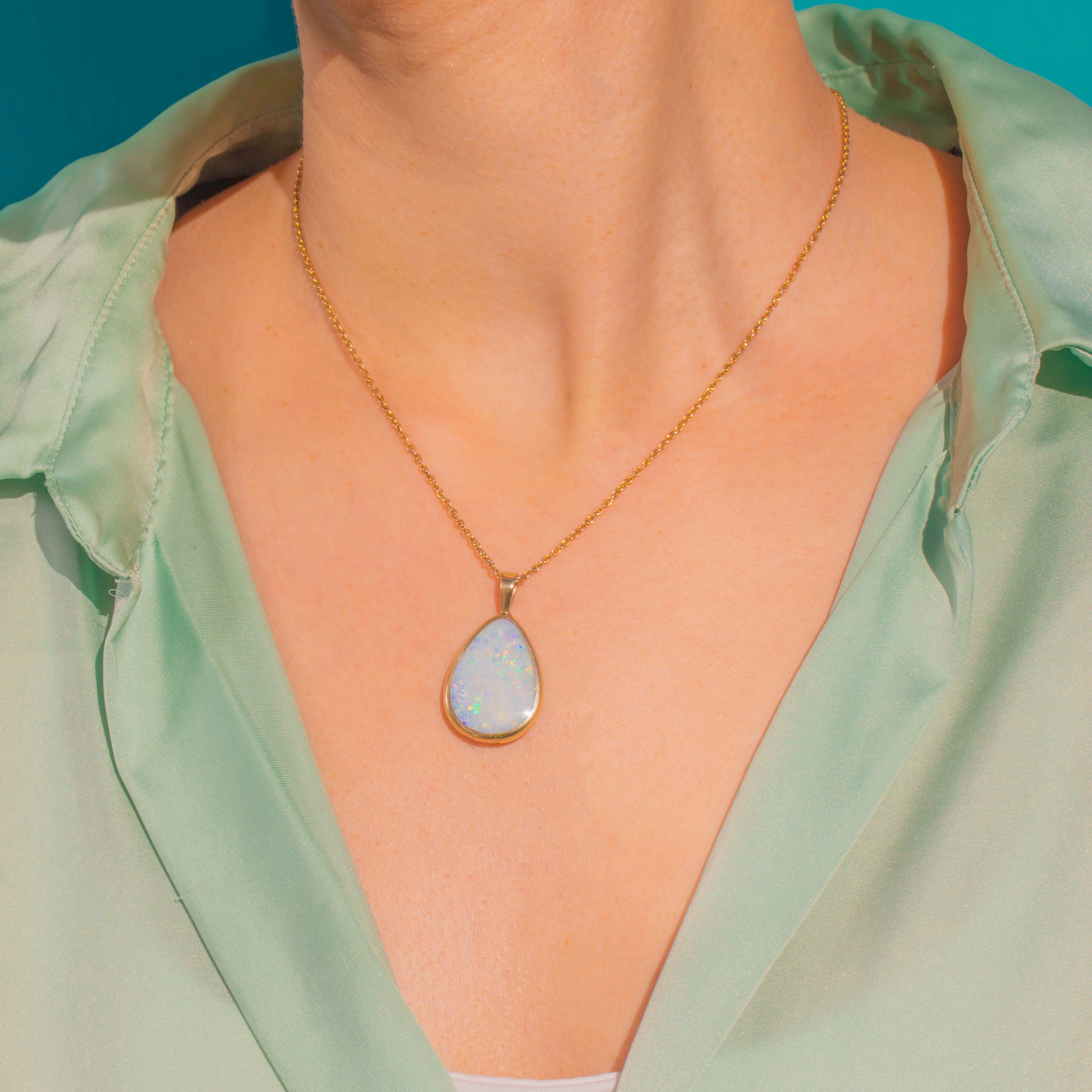A luminous 5.25ct Opal takes centre stage in this elegant teardrop pendant, its milky body alive with vivid flashes of blue, green and orange, with occasional flickers of red and purple. Cut as a smooth domed cabochon, the gemstone is framed by a sleek bezel that traces its curves to perfection.