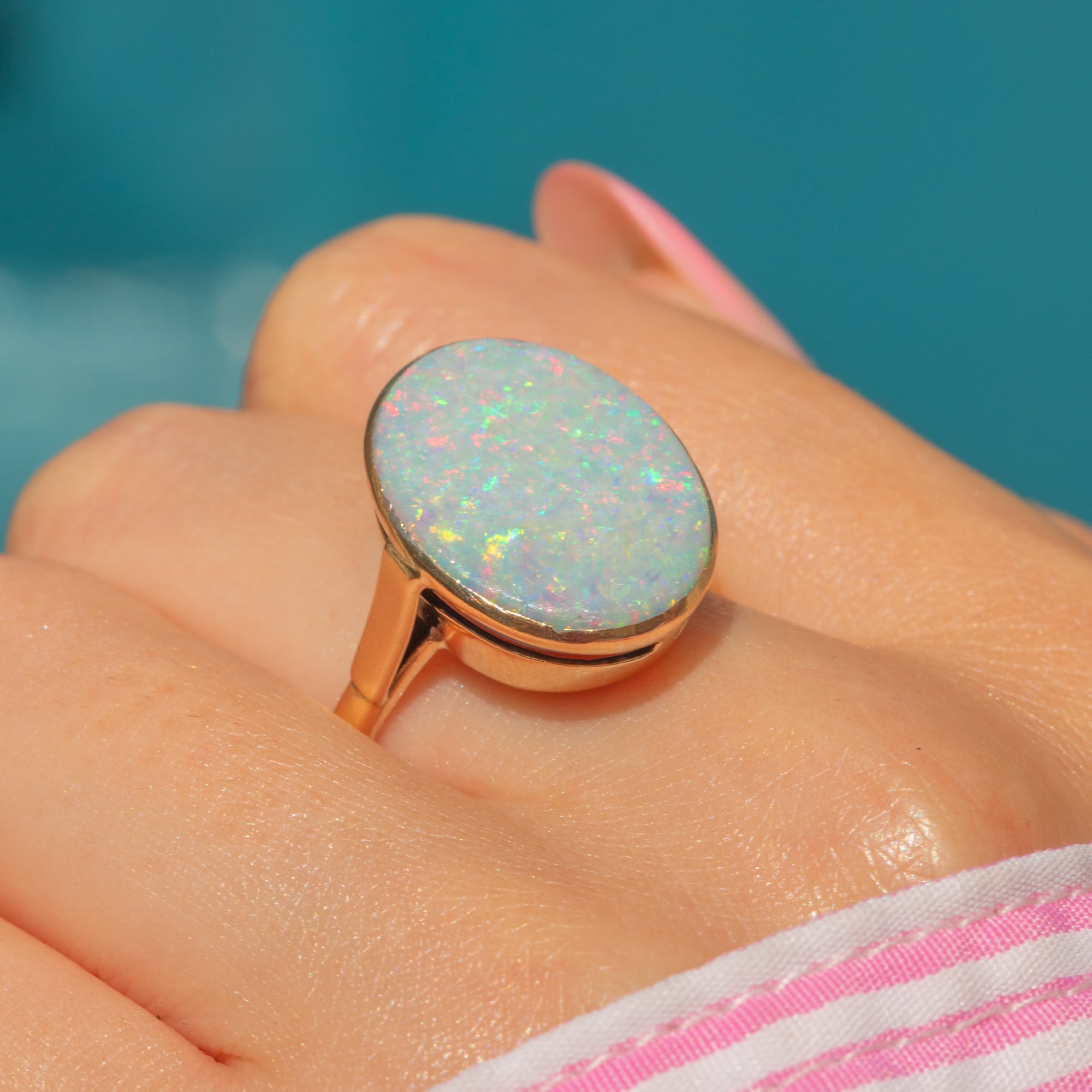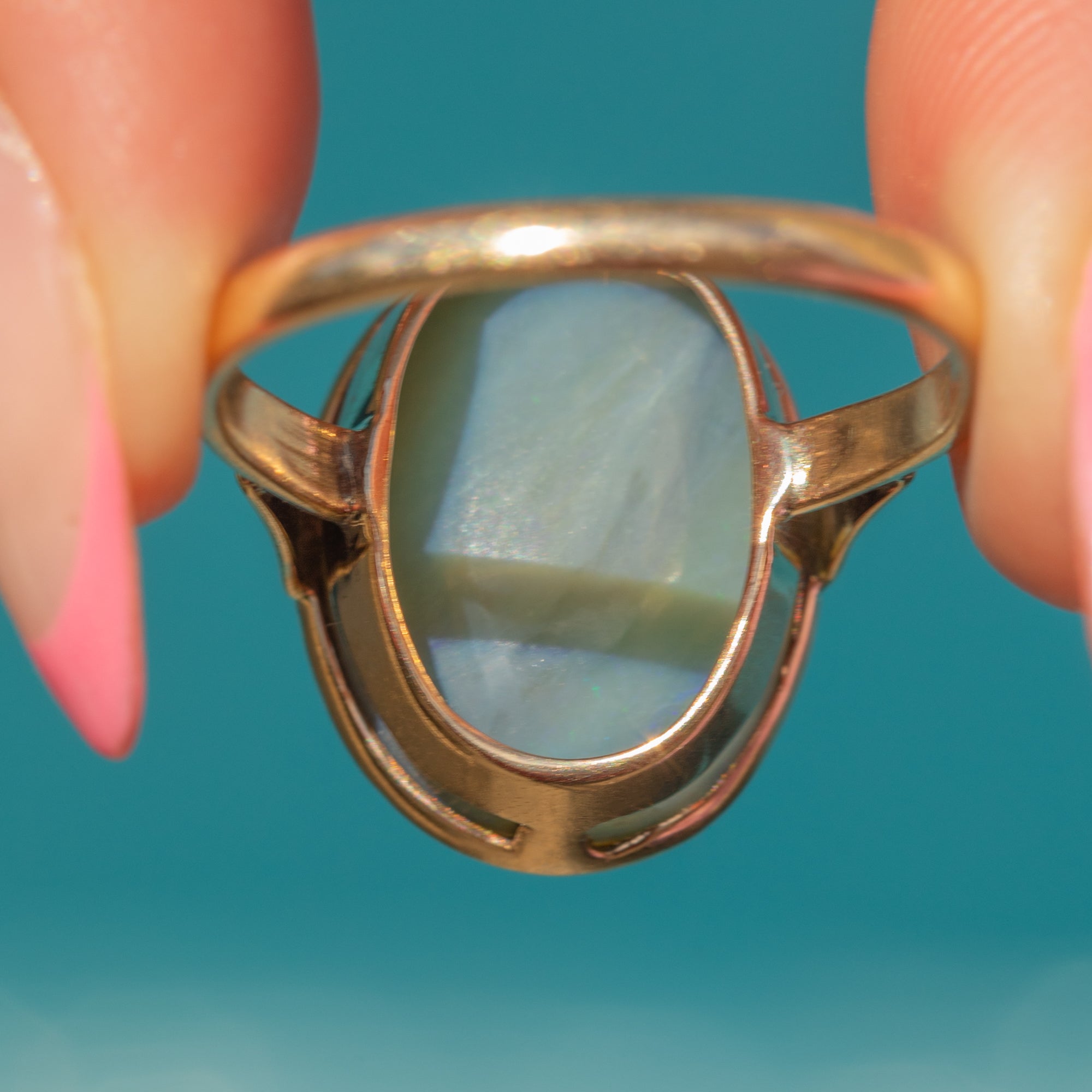 Boasting a large 3.00ct pastel Opal, this antique ring is a perfect statement piece. With undertones of lavender and azure blue, this natural solid Opal radiates a contrasting kaleidoscope of vibrant greens and pinks as she catches the light. Her Opal is hugged by a 9ct Gold bezel, the warmth of the Gold adding a refined finish.