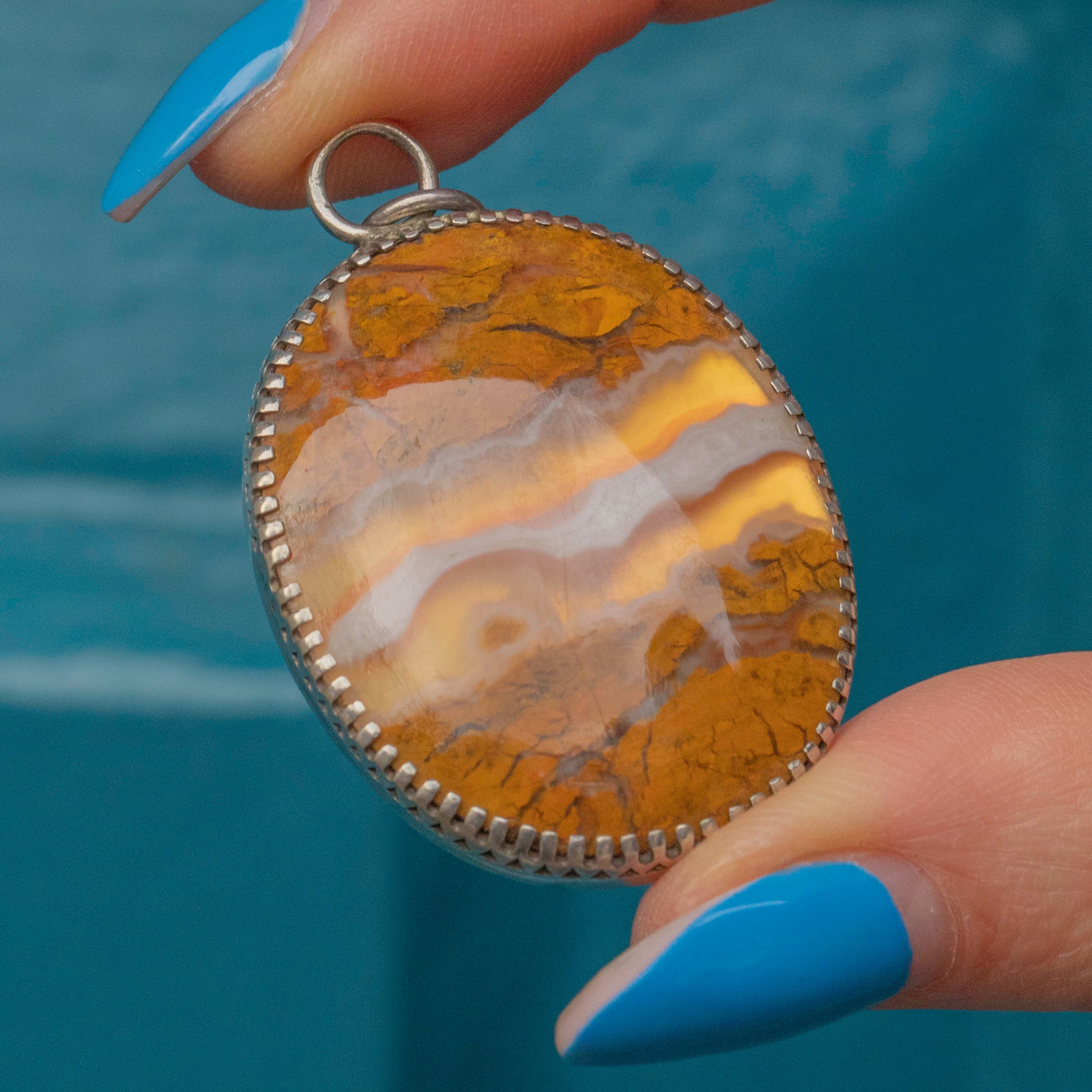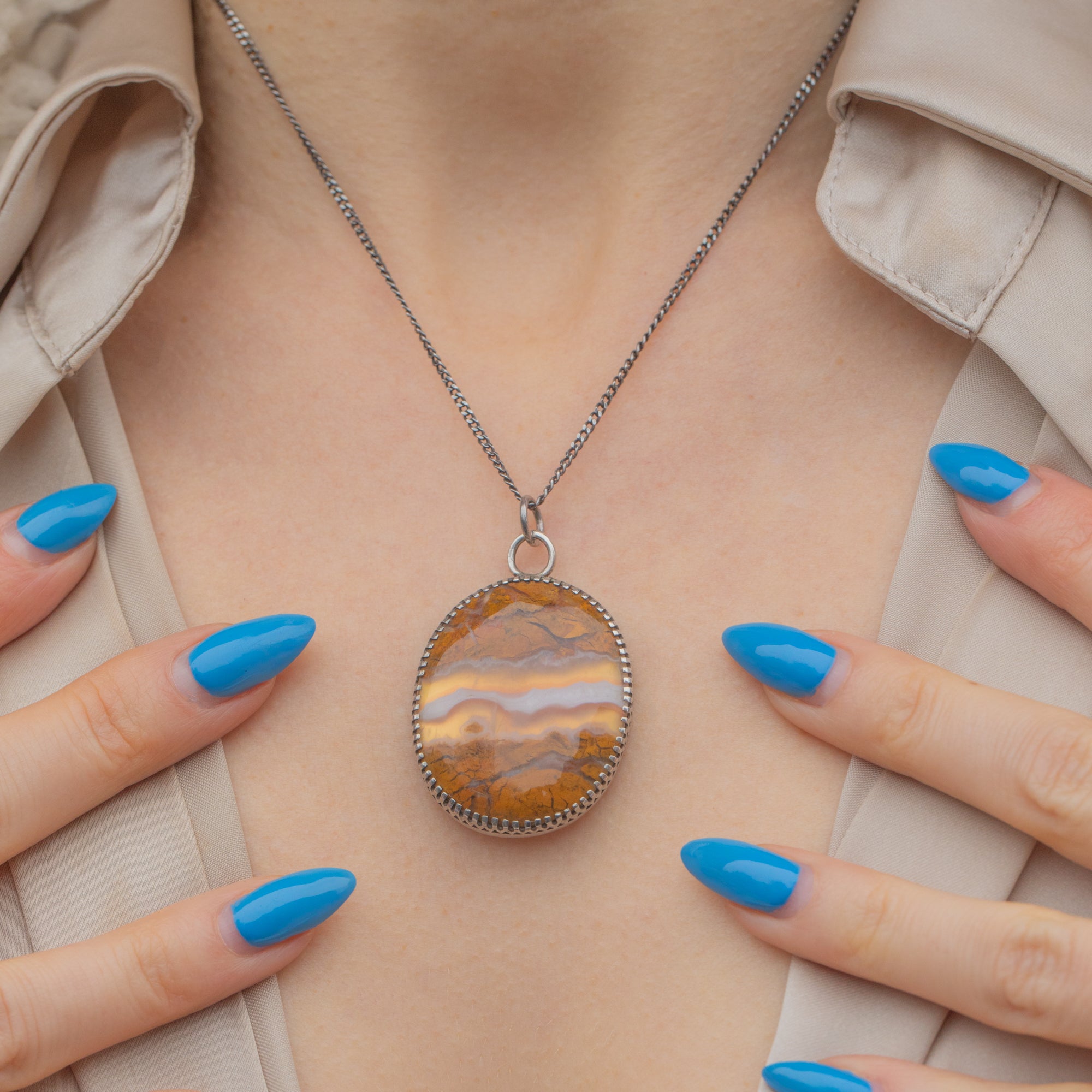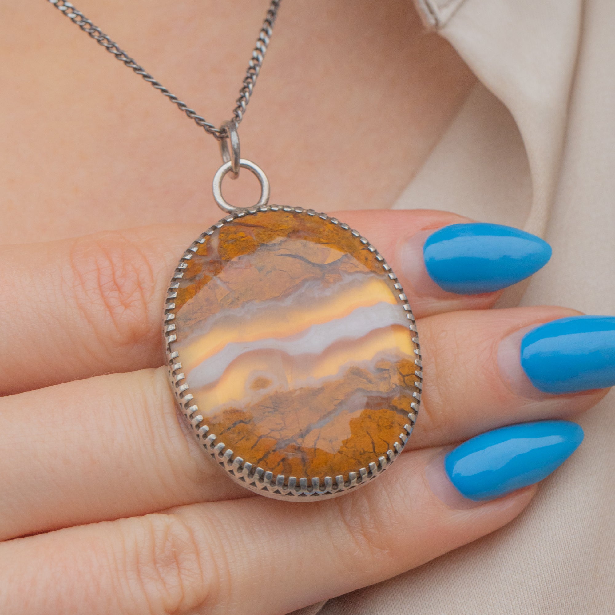 Add a touch of earthy warmth to your collection with this large Silver Agate oval pendant!