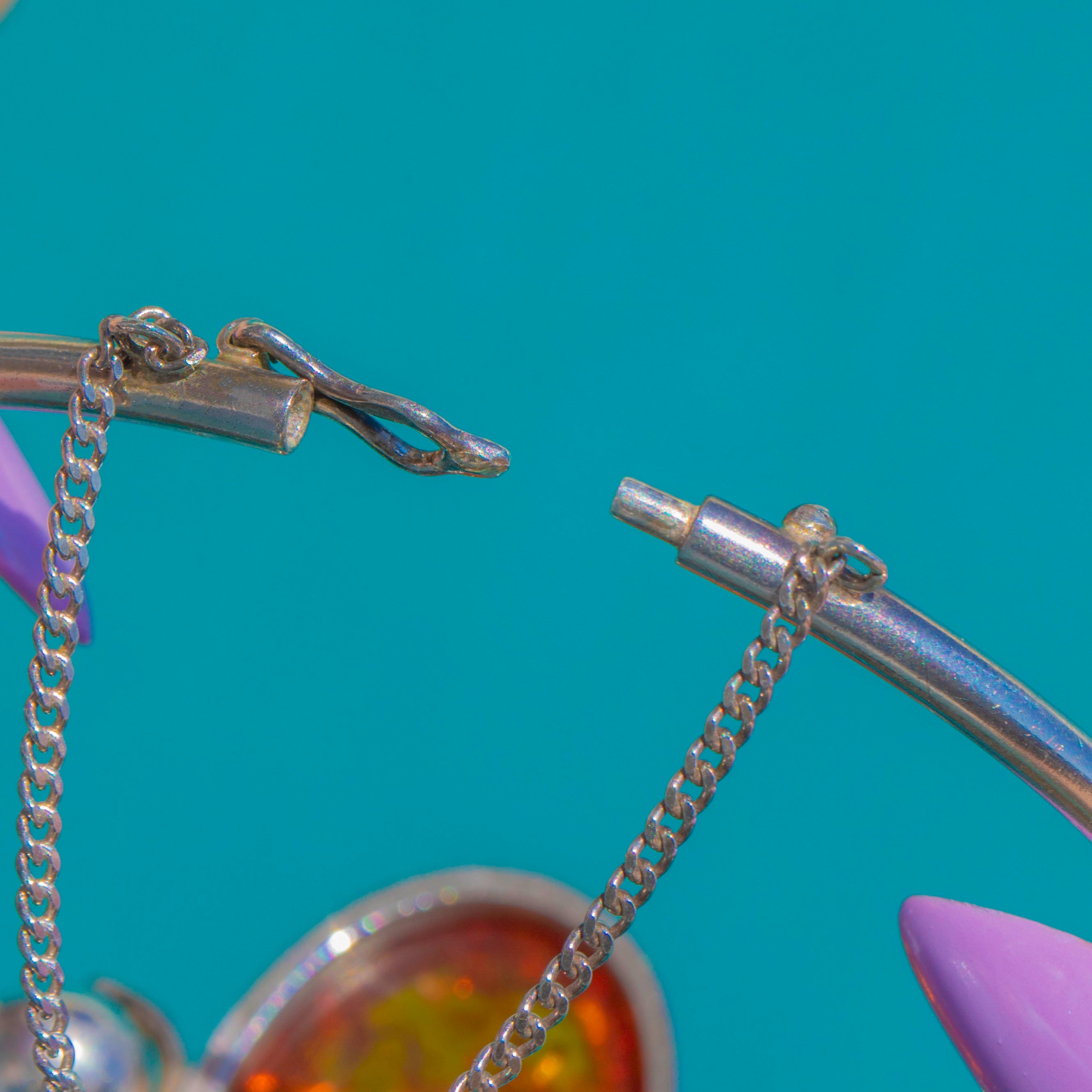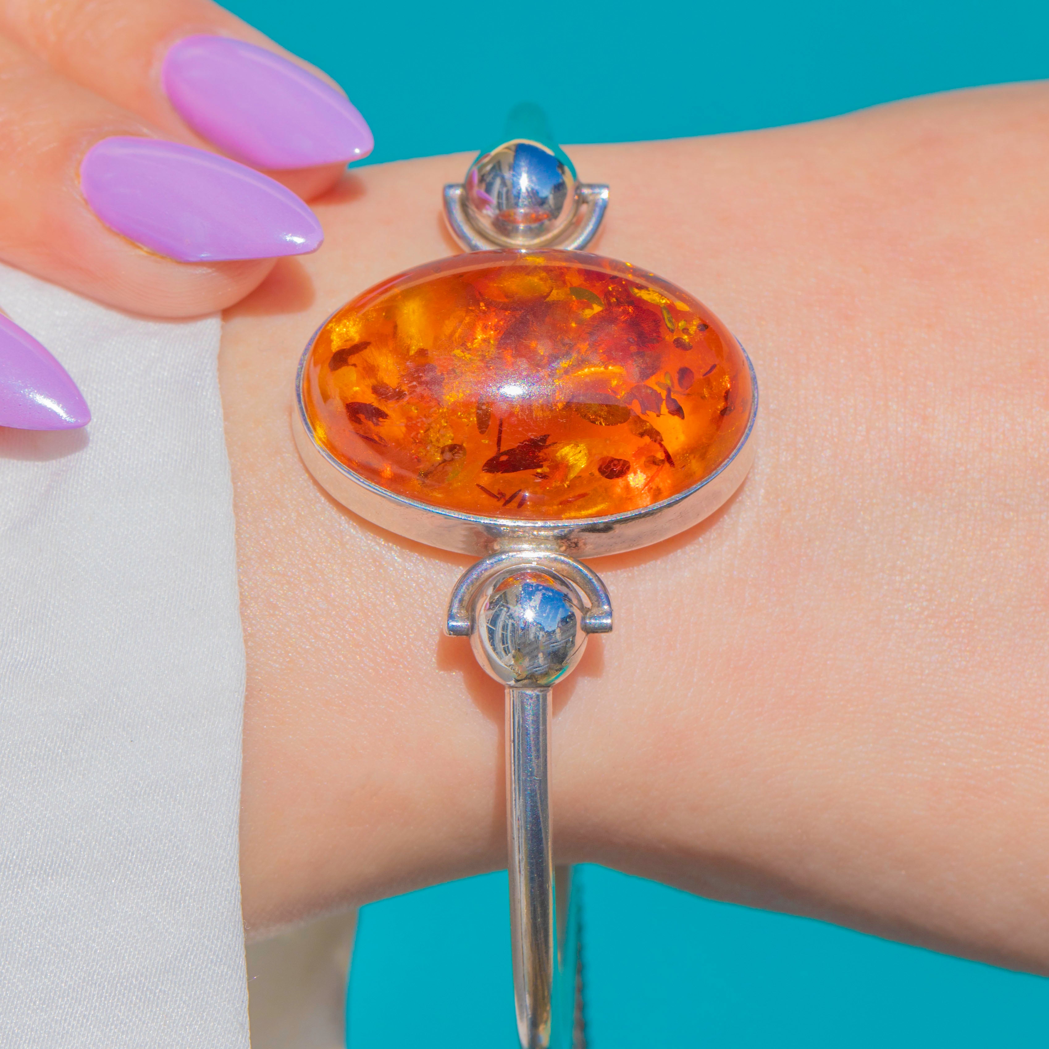 Glowing with rich honey-to-cognac tones, this Vintage 1990s bangle showcases a large high-domed Baltic Amber cabochon set in sleek Sterling Silver. The closed bezel frames the Amber’s natural inclusions and subtle iridescent flashes beautifully, creating a dramatic single-stone focal point.