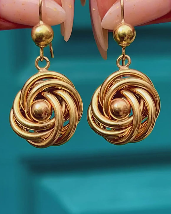 VERY GOOD-EXCELLENT: Bright, mirror-like Gold with minimal surface wear commensurate with age. The tubular knots remain crisp with only a few tiny dimples visible under close inspection; solder seams are visible as expected for period construction. Ear wires are secure and the articulated drops move smoothly.