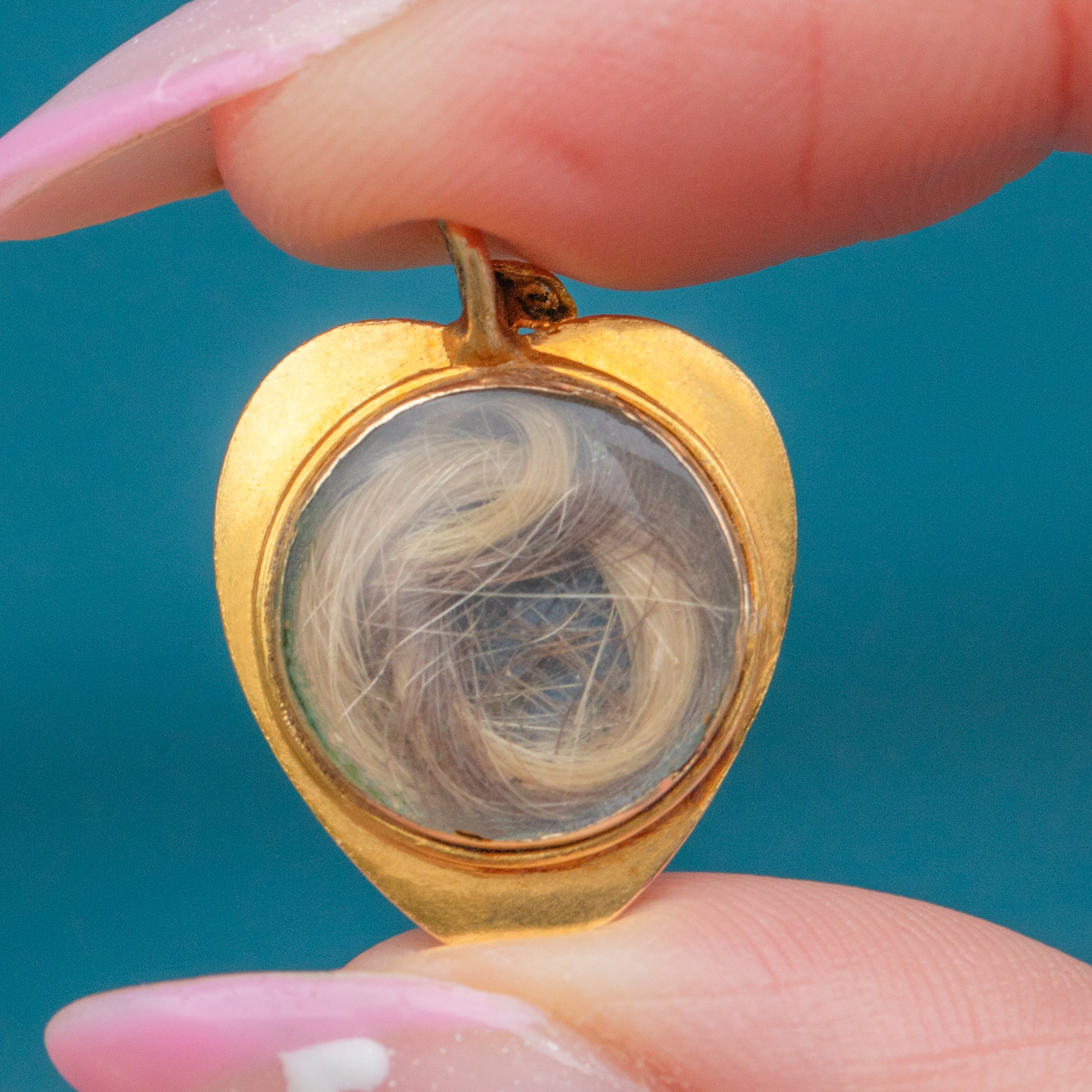 EXCELLENT: The locket is in exceptional condition for its age. The engravings remain crisp, the glass back is clear and intact, and the original hair keepsake is beautifully preserved.