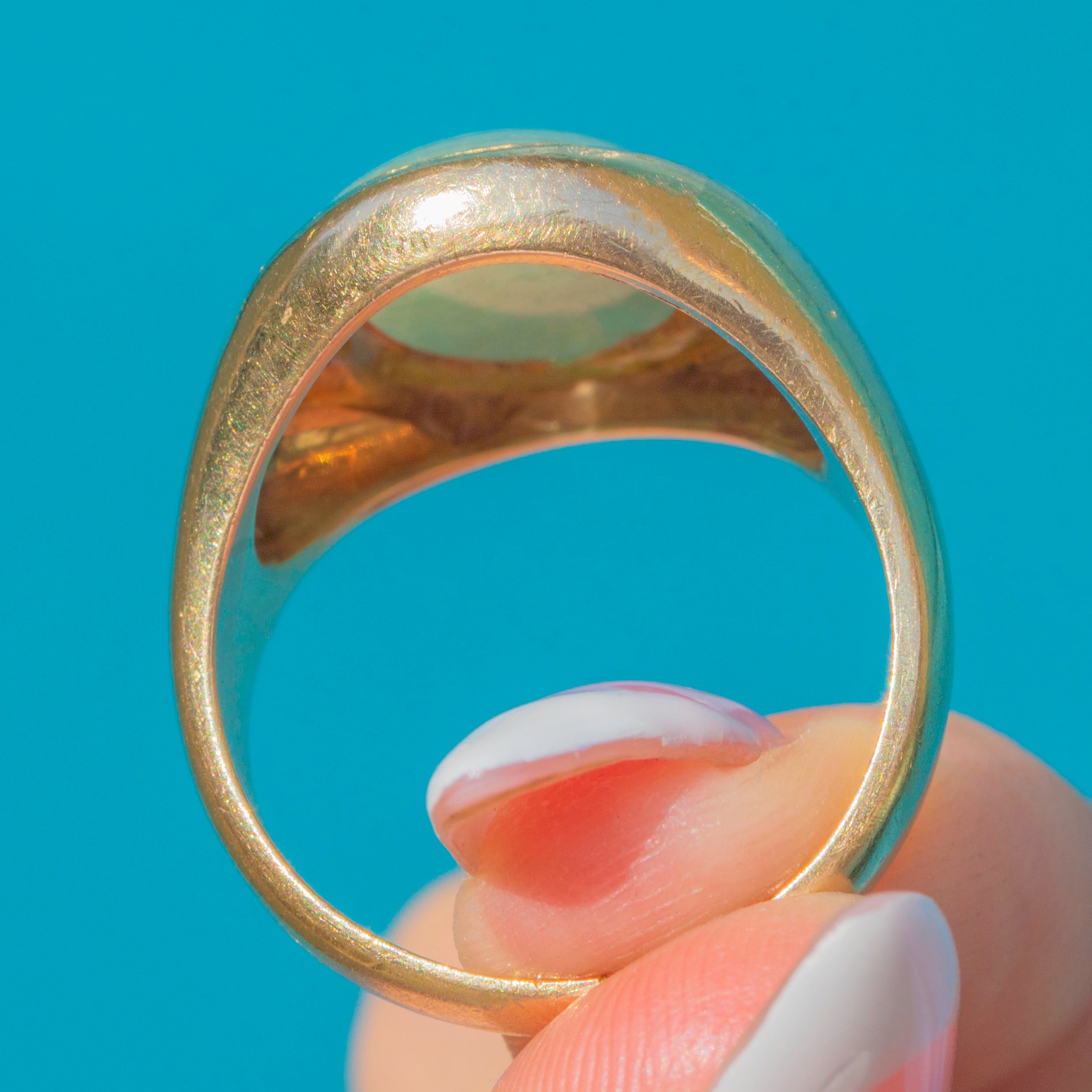 EXCELLENT: The Jade is free from chips, scratches, or abrasions, retaining a beautiful smooth polish. The Gold band is in pristine condition with no thinning or distortion. There is a worn inscription inside the band that is too faint to read, adding a touch of mystery to this well-preserved vintage piece.