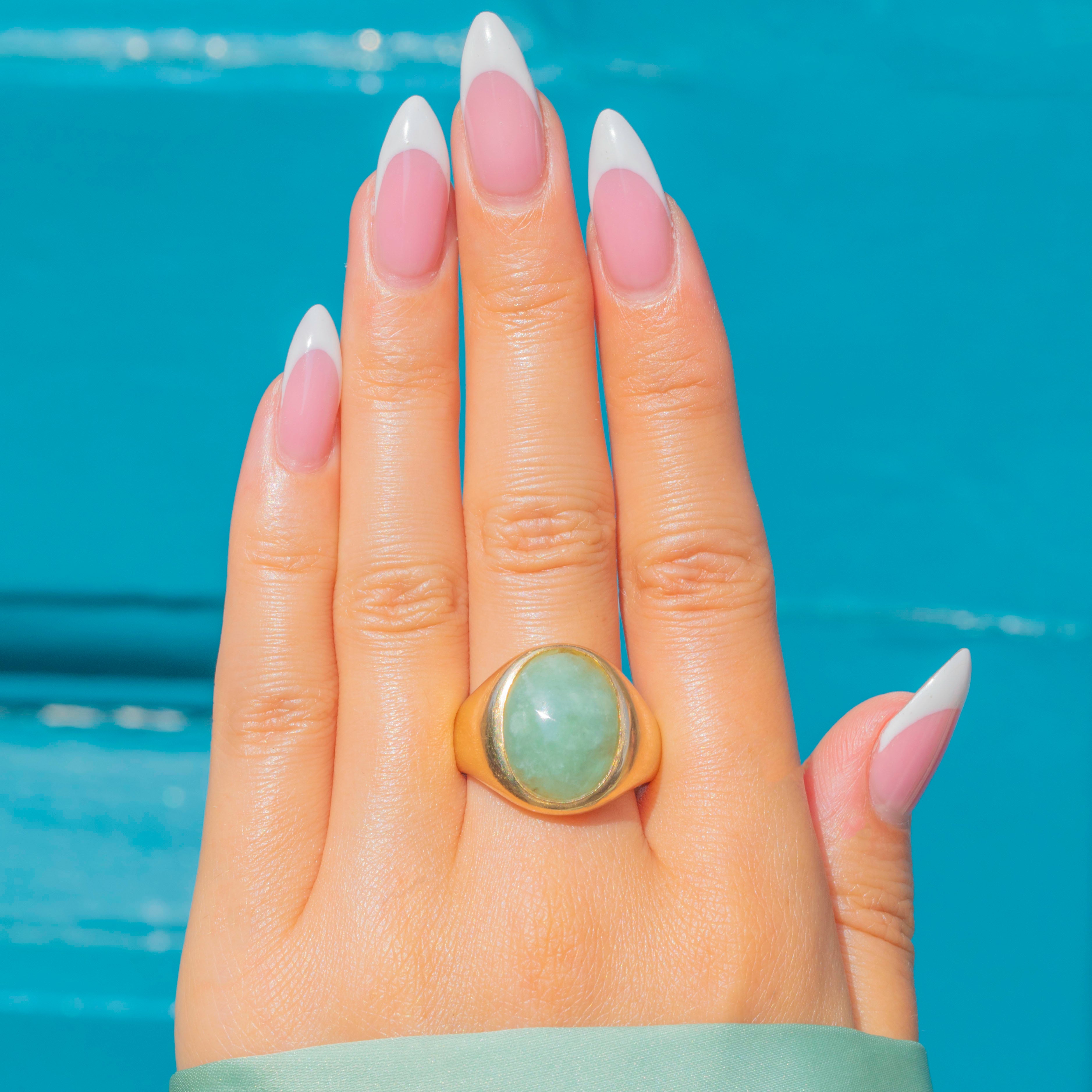The Jade has a soft, even green hue with a subtle translucency, creating a beautiful contrast with the warm Gold.