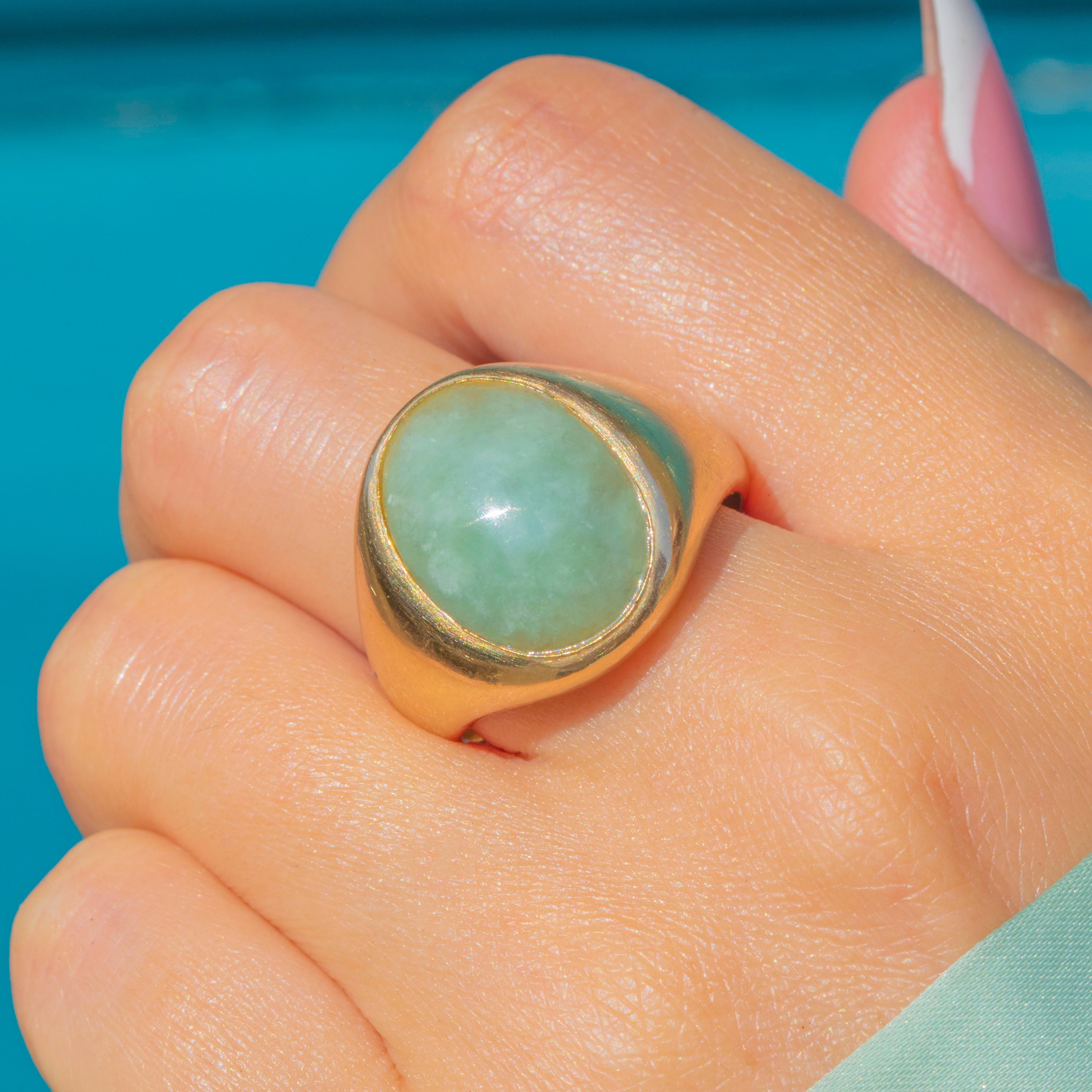 This Mid-Century Vintage ring is crafted in rich 14ct Gold and set with a striking oval Jade cabochon.