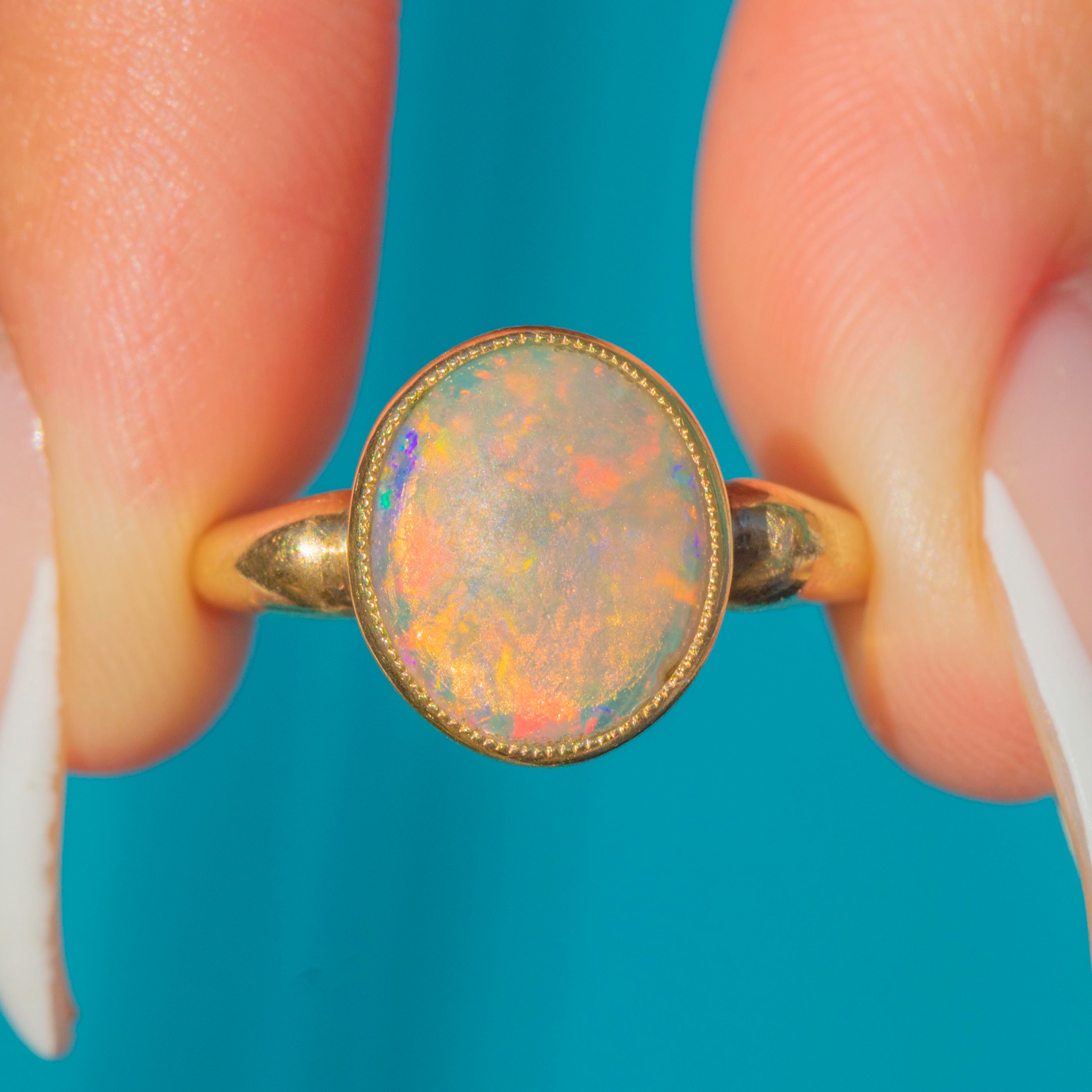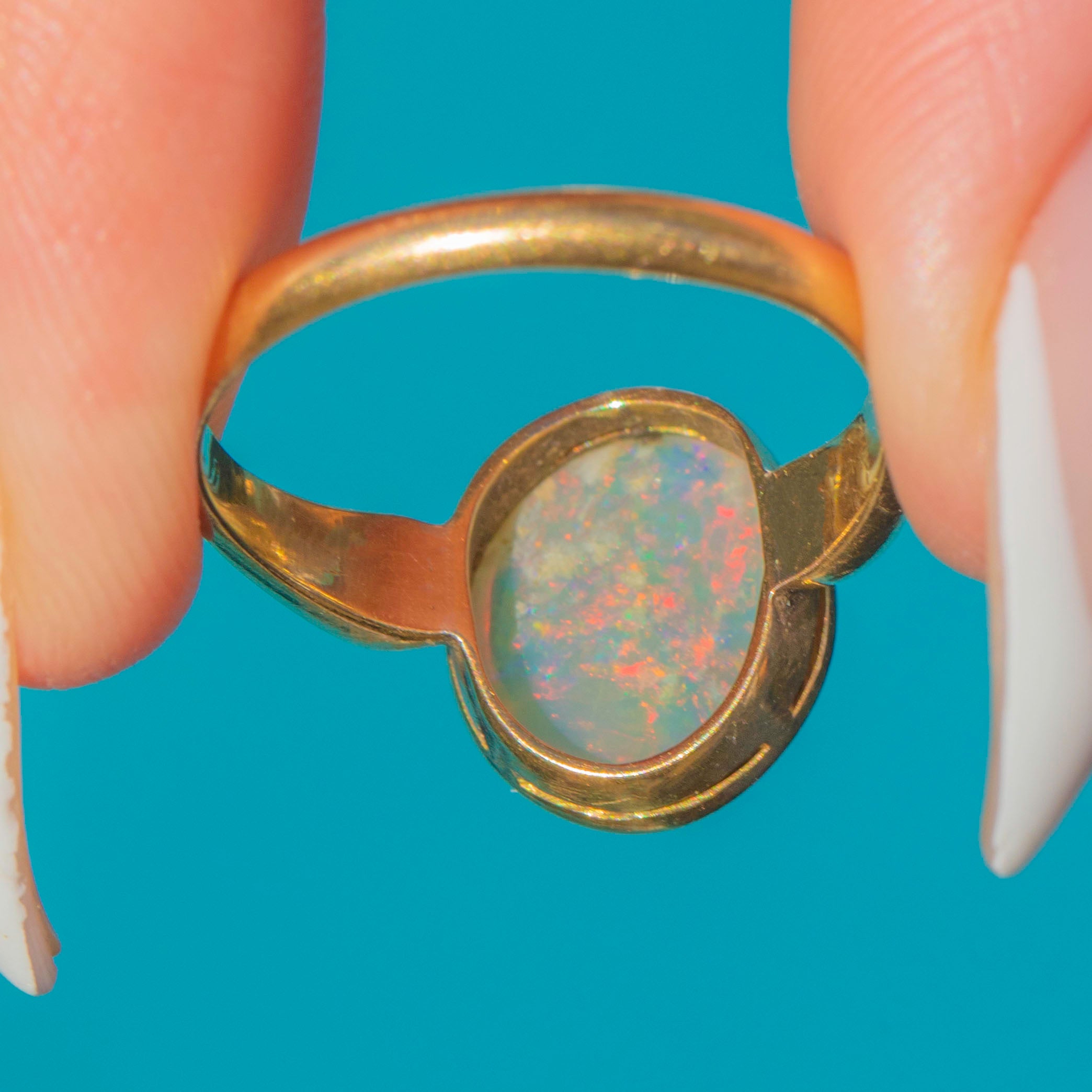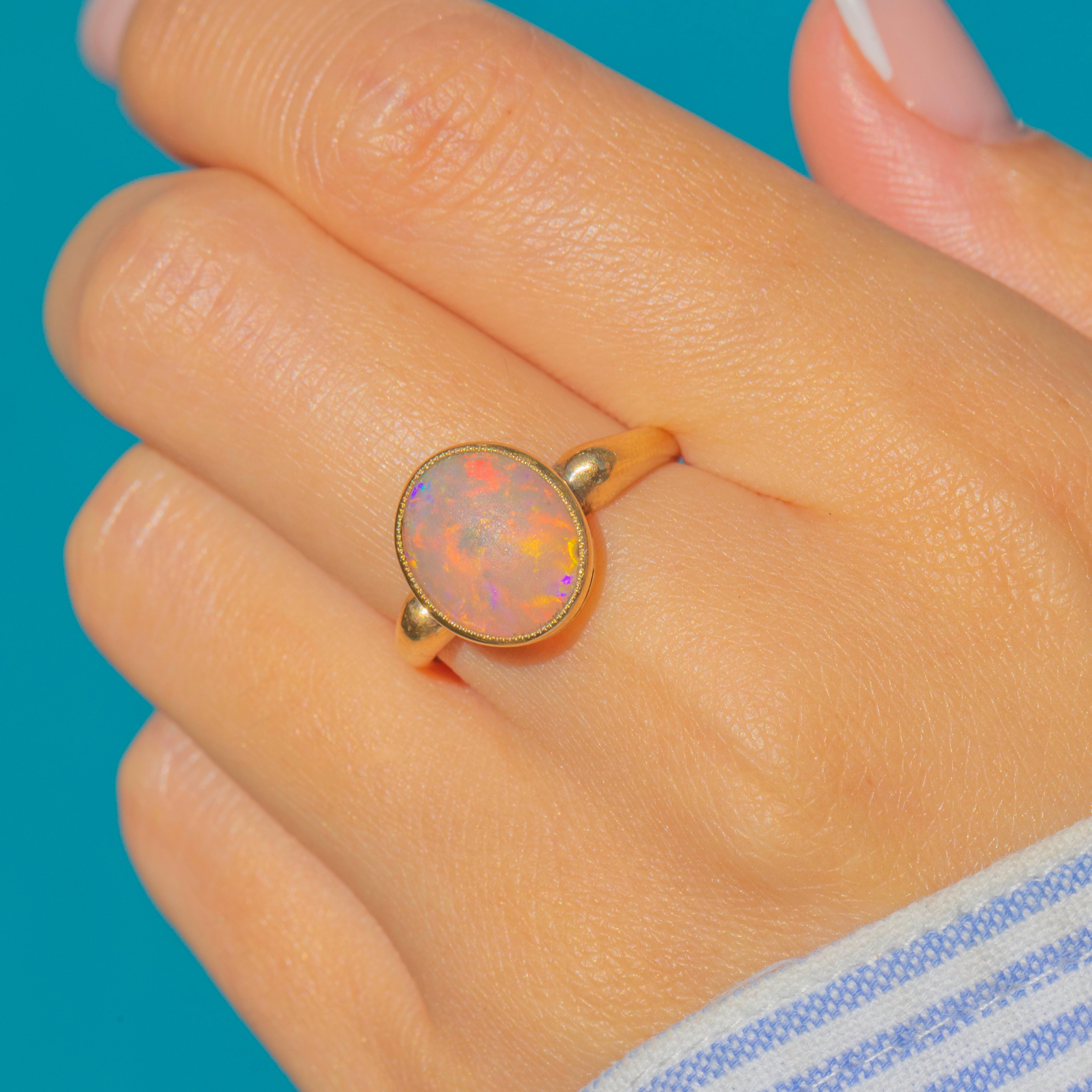 VERY GOOD: The Opal shows moderate surface wear consistent with age, but its play of colour remains vivid. Band and setting are secure and well-preserved.