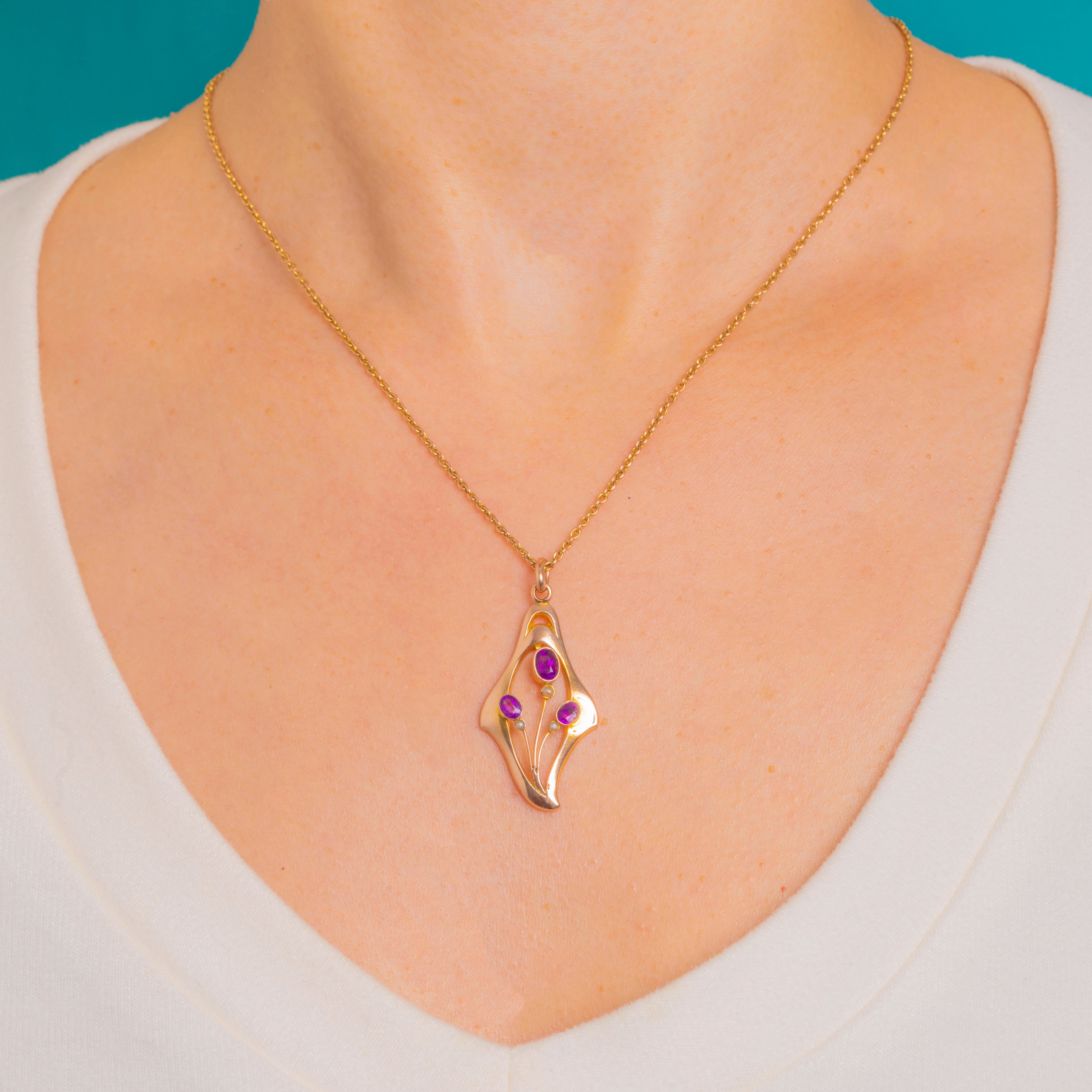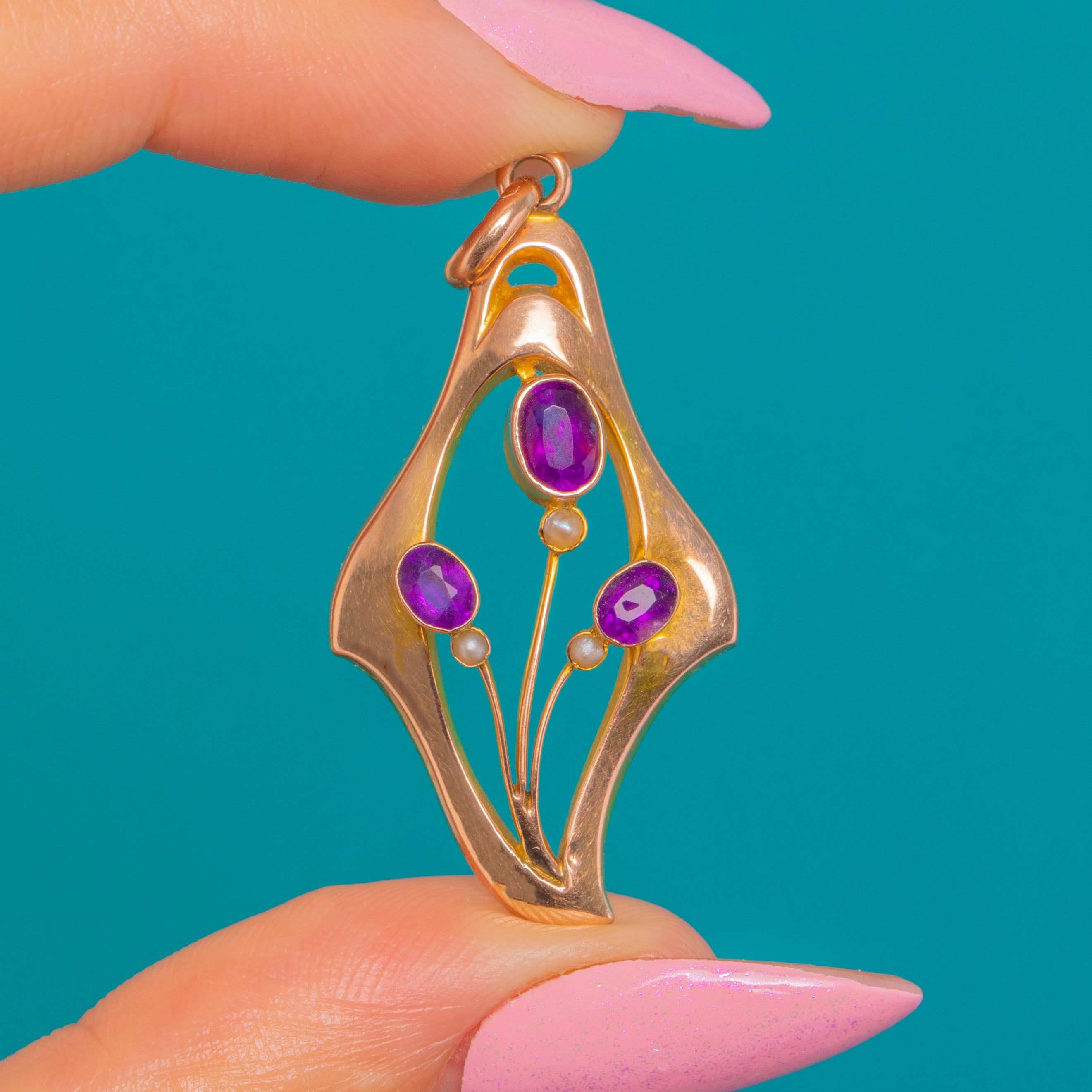 A lyrical Art Nouveau pendant by Murrle Bennet in glowing 9ct Gold, its elongated lozenge silhouette traced with graceful openwork and flowing foliate lines. Three fine wire stems unfurl into a delicate spray, each tipped with a lively faceted Amethyst in romantic violet and accented by petite creamy Seed Pearls.