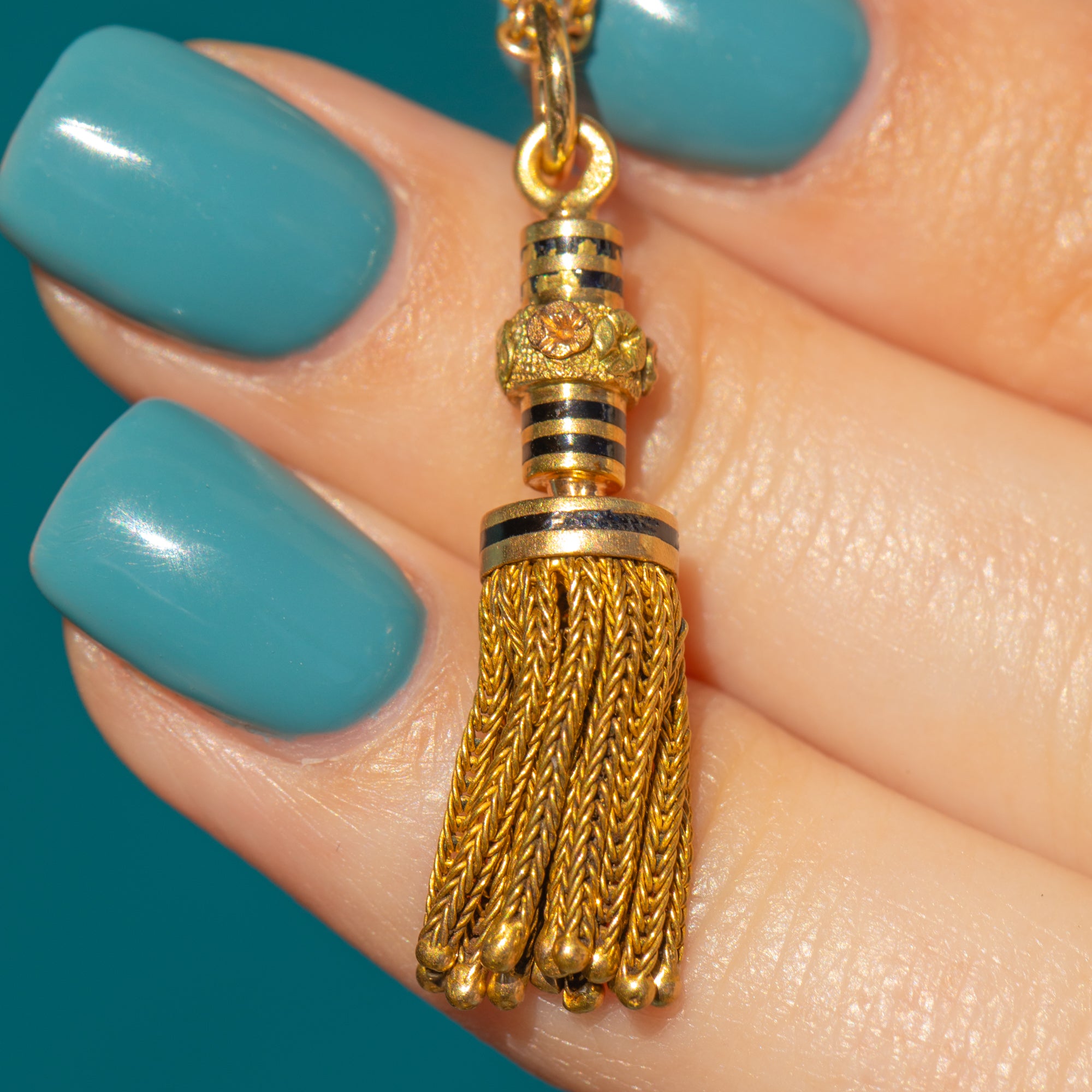 This antique Napoleon III French 18ct Gold & Enamel tassel pendant is divine! Crafted from French 18ct Gold, this Victorian tassel possesses a deliciously rich tone, flaunting thirteen slinky foxtail tassels and French hallmarks upon her hasp.