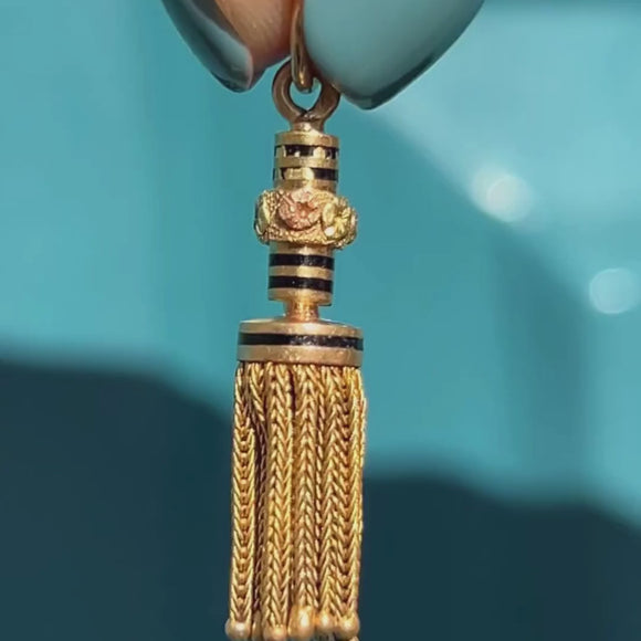 Bursting with antique charm, striking striped black Enamel flows around the tassel top, framing her pretty floral details. The Victorians were prized for their intricate tassel pendants and this masterpiece showcases their craftsmanship at another level!