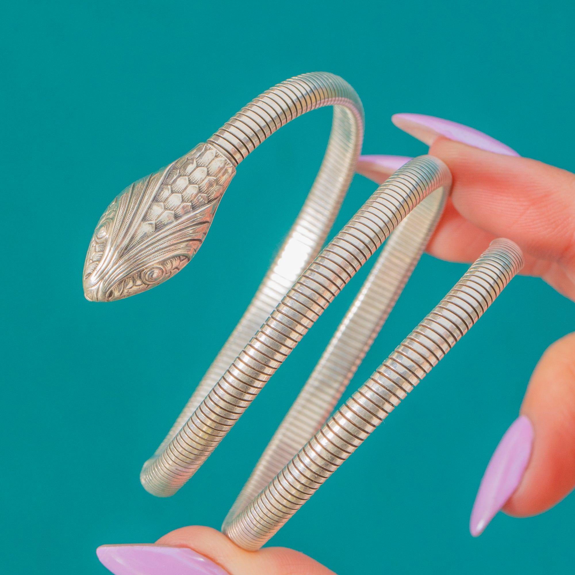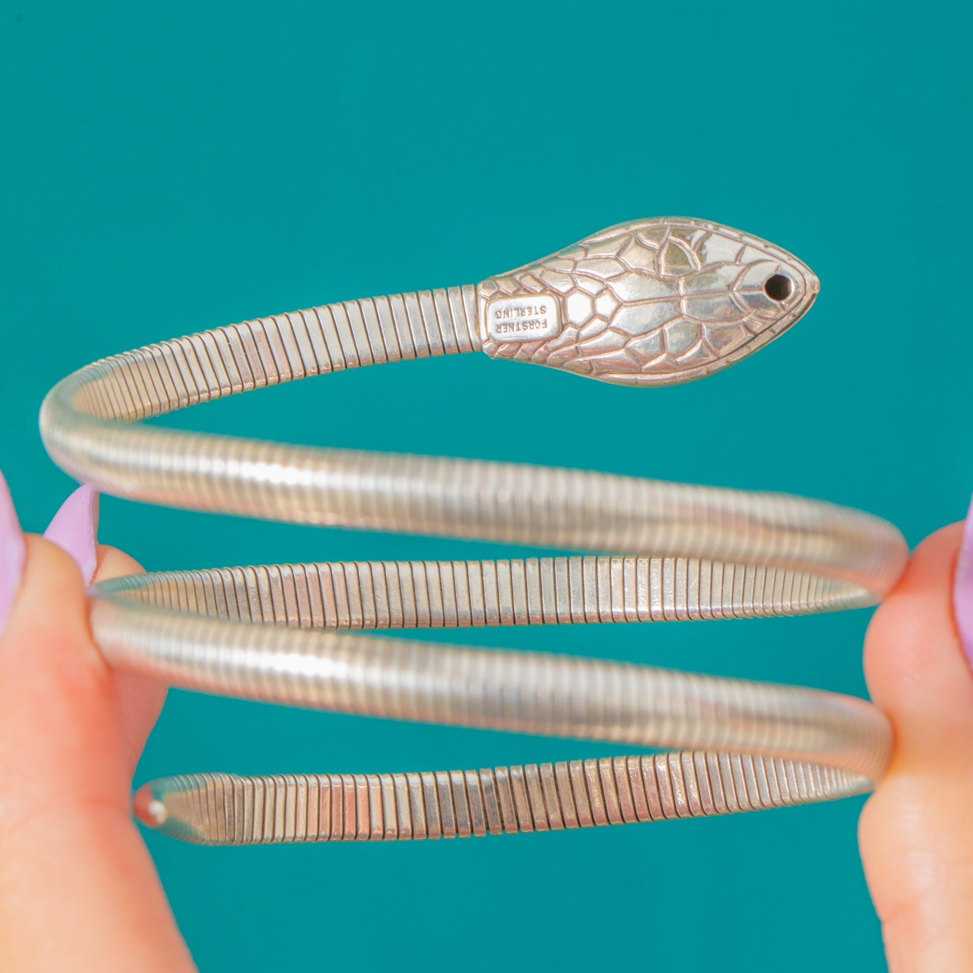The head is crisply engraved with fine scale and radiating foliate details that catch the light against the bright Silver. An open-ended, tension-fit design makes it effortless to wear, while the “Fostner Sterling” stamp underlines its quality. A chic 20th-century revival of the beloved Victorian serpent motif, it’s a statement piece with timeless allure.