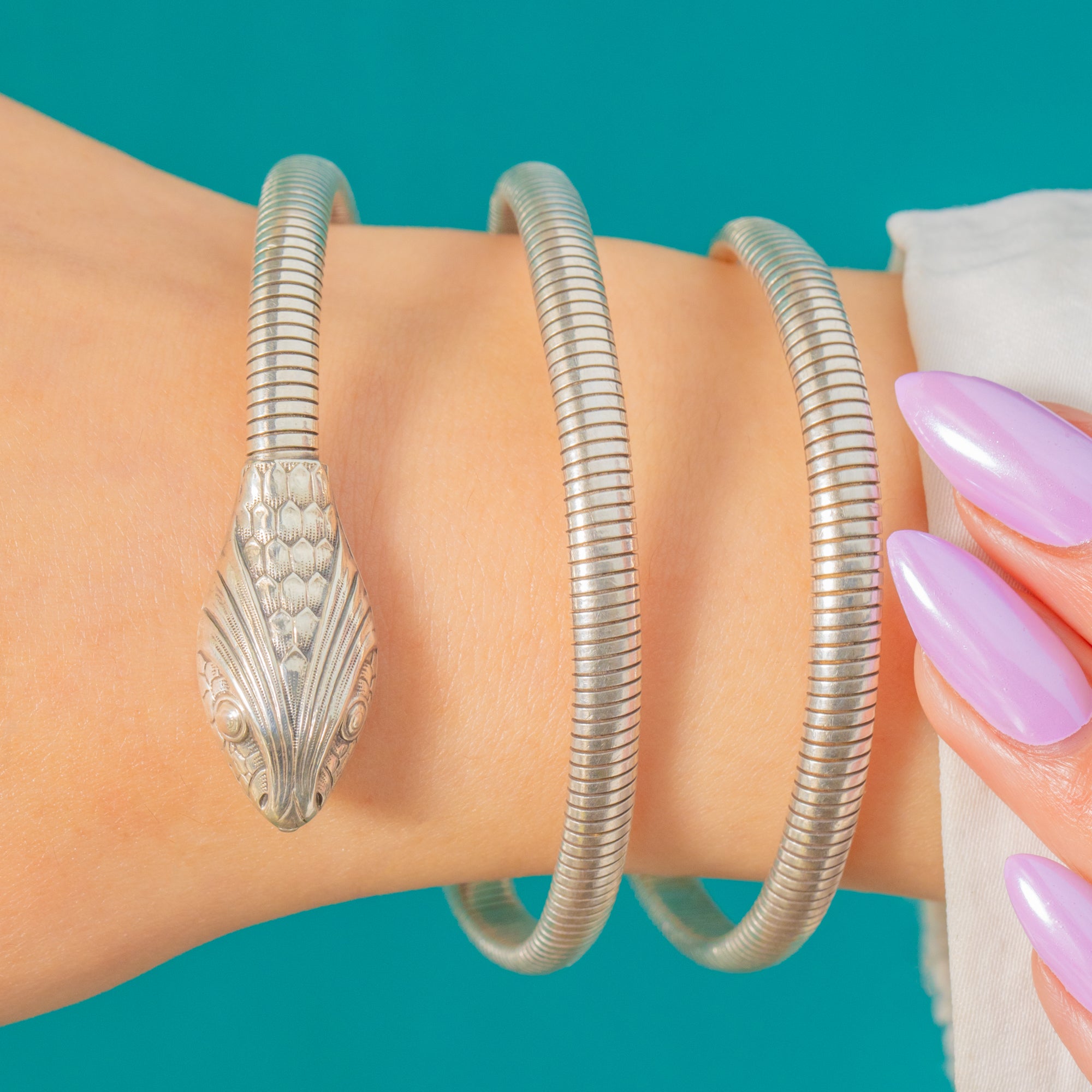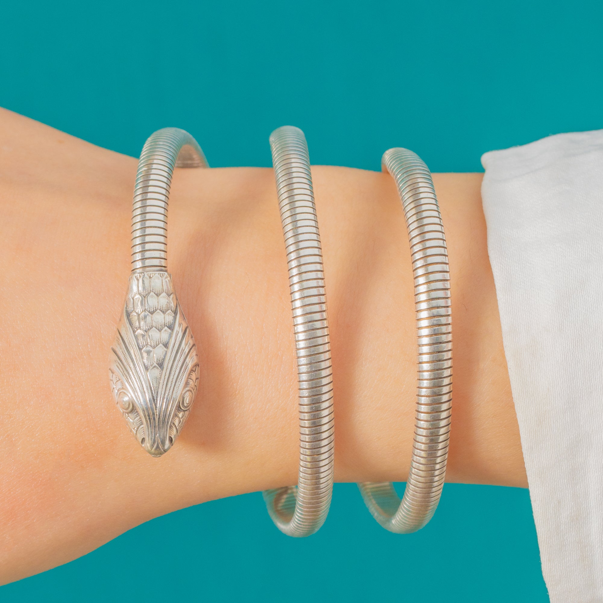 Sinuous, sculptural and wonderfully tactile, this authentic 1920's Sterling Silver serpent bracelet has all the charm and style of the Art Deco period. Wrapping sleekly about the wrist in tubogas-style coils for an undeniably striking look.
