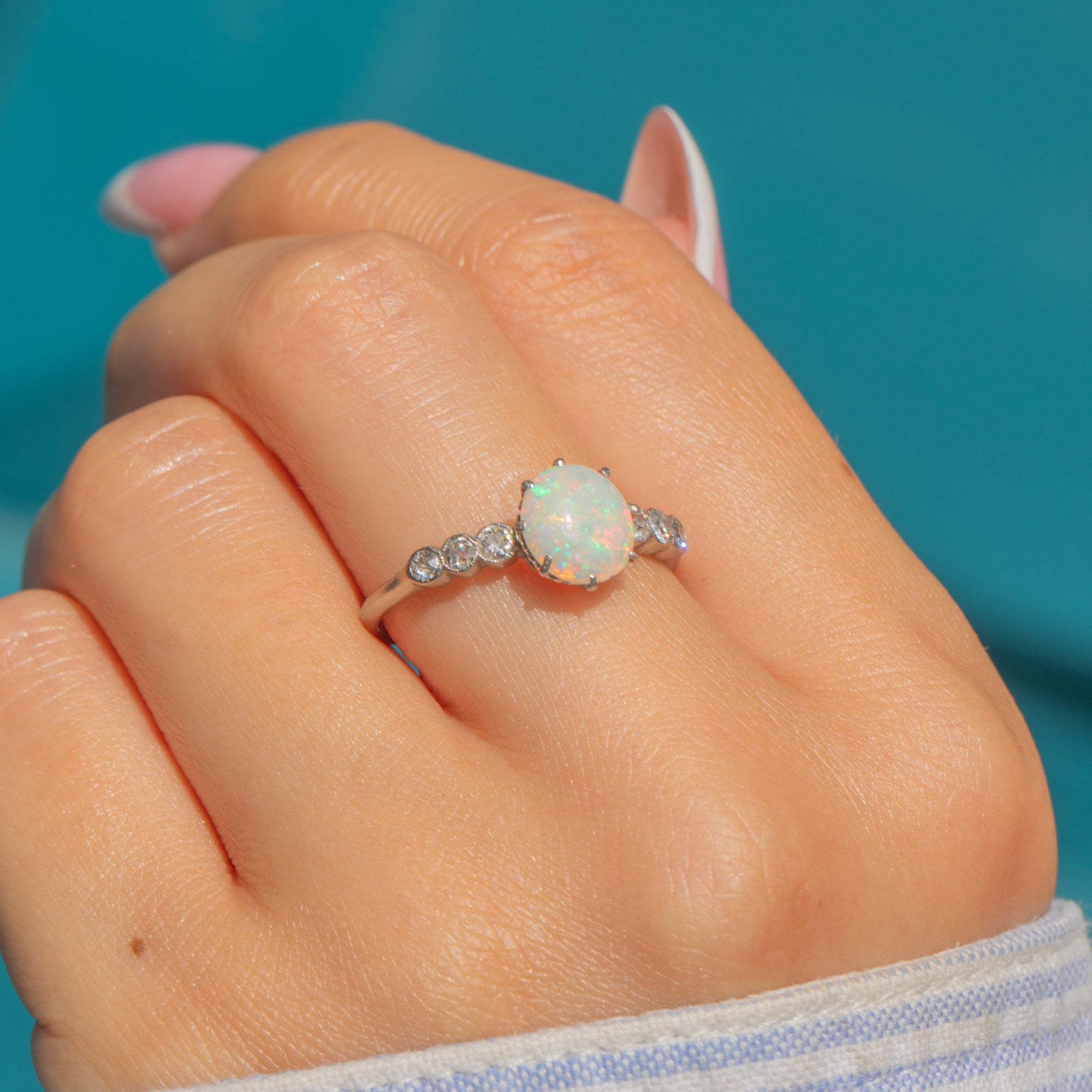 This refined Platinum ring showcases a luminous Opal cabochon accompanied by twinkling Diamond accents. The 1.25ct Opal cabochon glows with characteristic play-of-colour, beautifully complemented by 0.15cts of sparkling Diamonds.