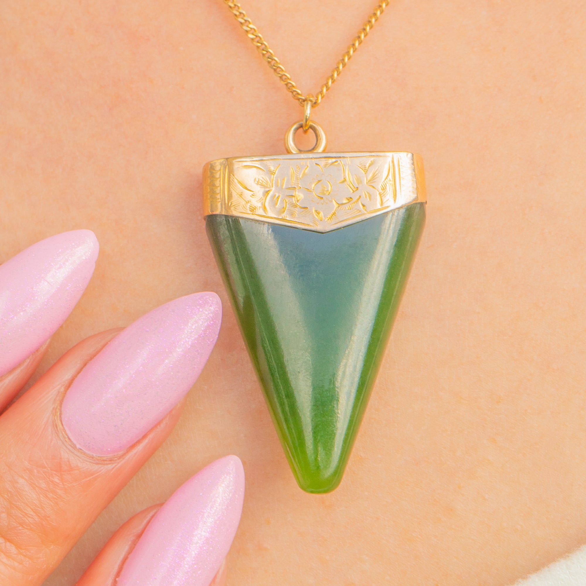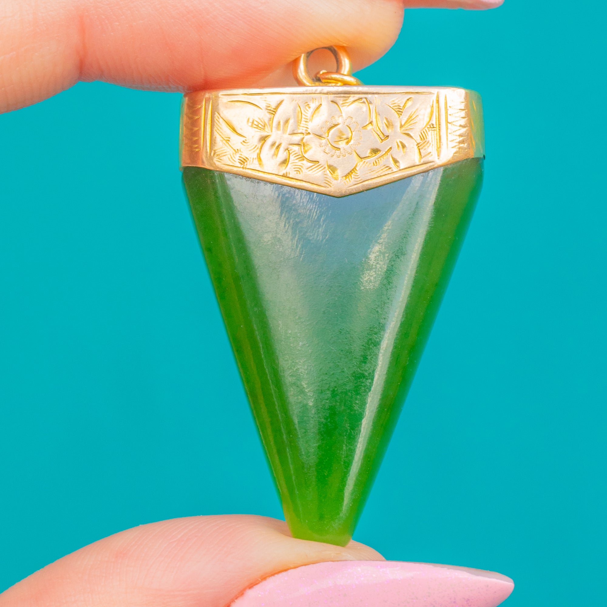A striking Victorian Jade pendant crowned with a finely engraved 18ct Gold cap. The elongated, tapered drop of verdant green Jade (Nephrite) is sculptural and elegant, its pure geometry beautifully offset by the cap’s delicate floral and foliate engravings.
