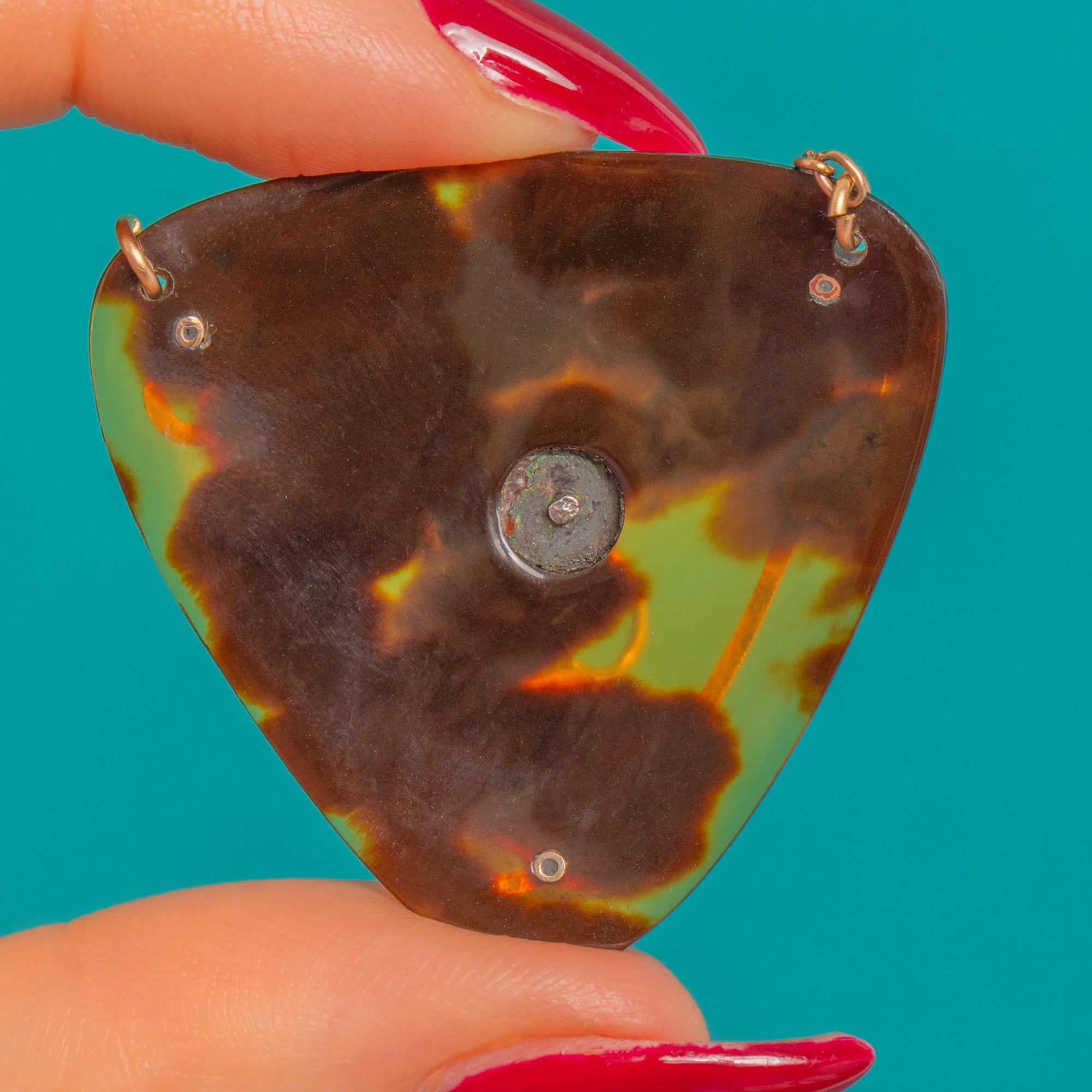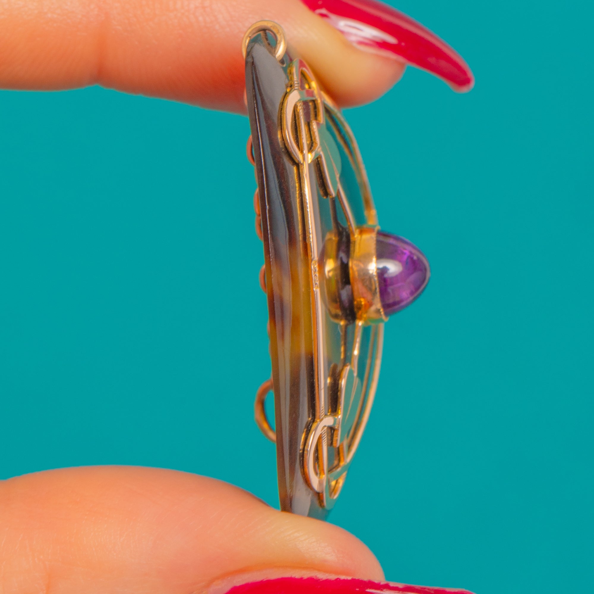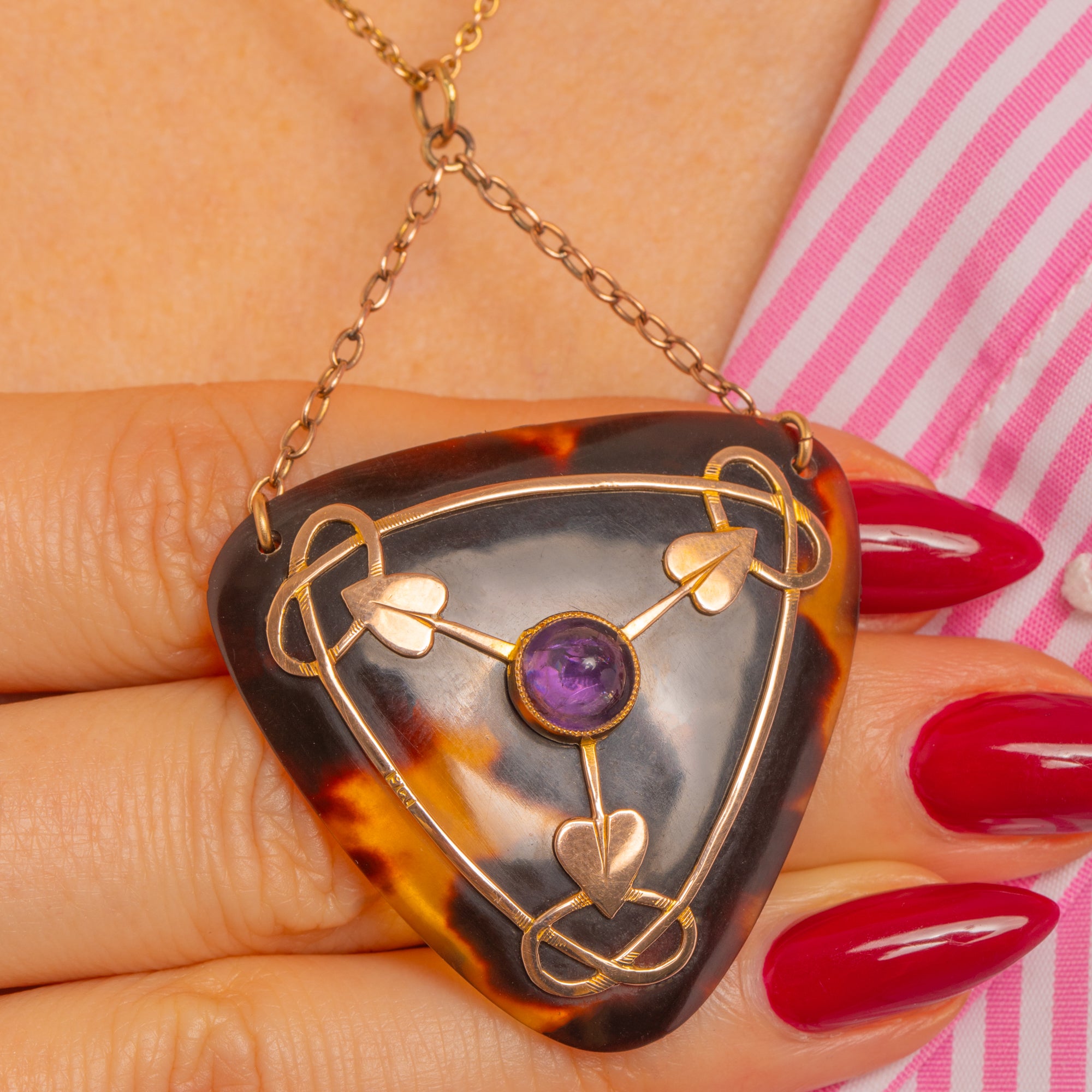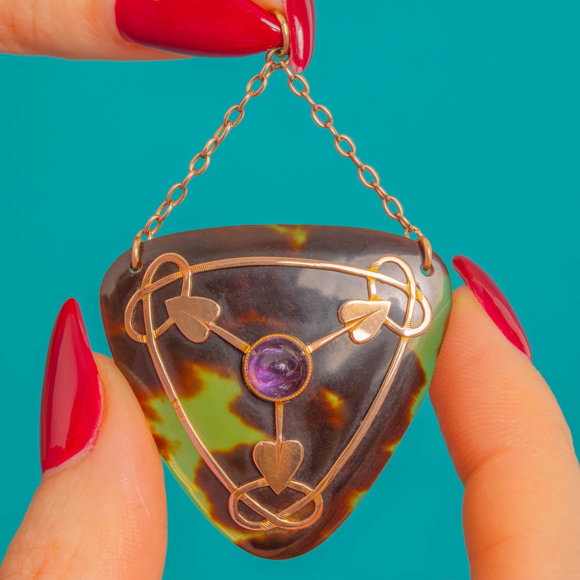 Sensuous Art Nouveau lines sweep across a glossy Shell piqué plaque in this enchanting 9ct Gold pendant, its triangular form softened by flowing wirework that unfurls into three stylised heart-leaves. At the centre sits a high-dome Amethyst cabochon, a rich, romantic purple that glows beautifully against the warm Gold and deep, organic tones of the Shell.