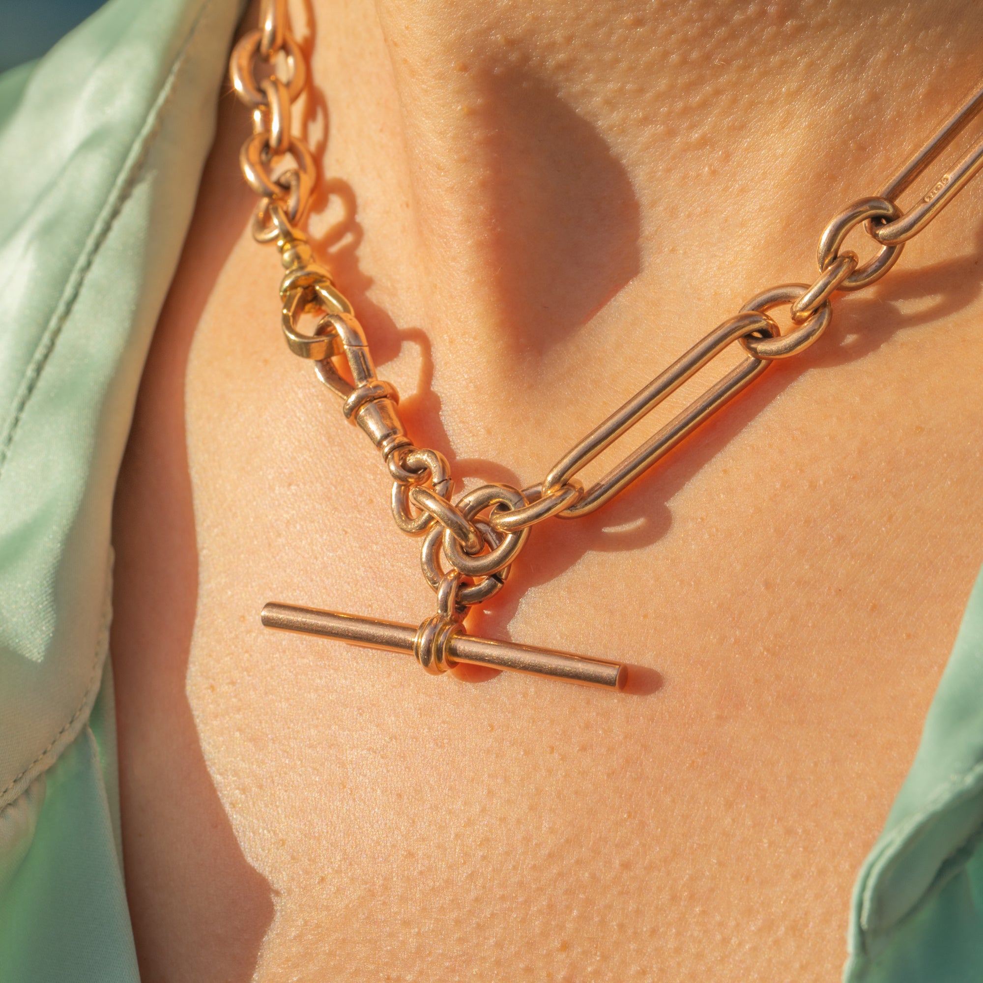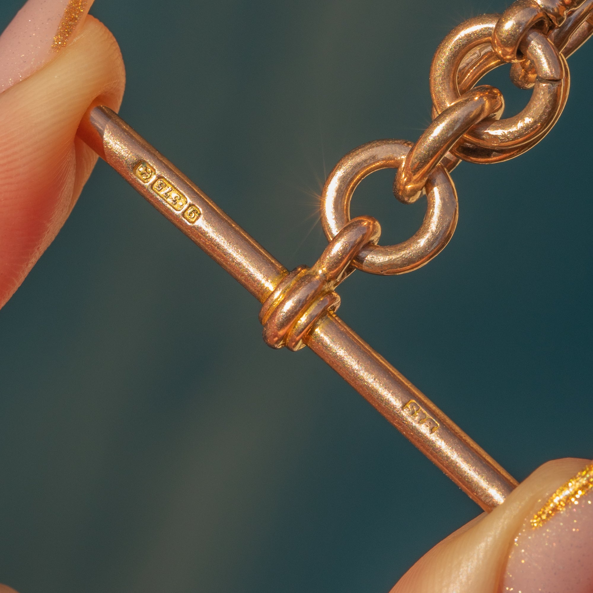 A truly exceptional Victorian 9ct Gold trombone-link chain of substantial weight and rarity. At an impressive 48.7 grams, with every single link stamped for solid 9ct Gold, this is a collector’s dream and a standout investment piece. Rarely do chains of this calibre appear with two original dog-clips and their matching T-bar — all antique, all working beautifully, and all stamped “9ct”.