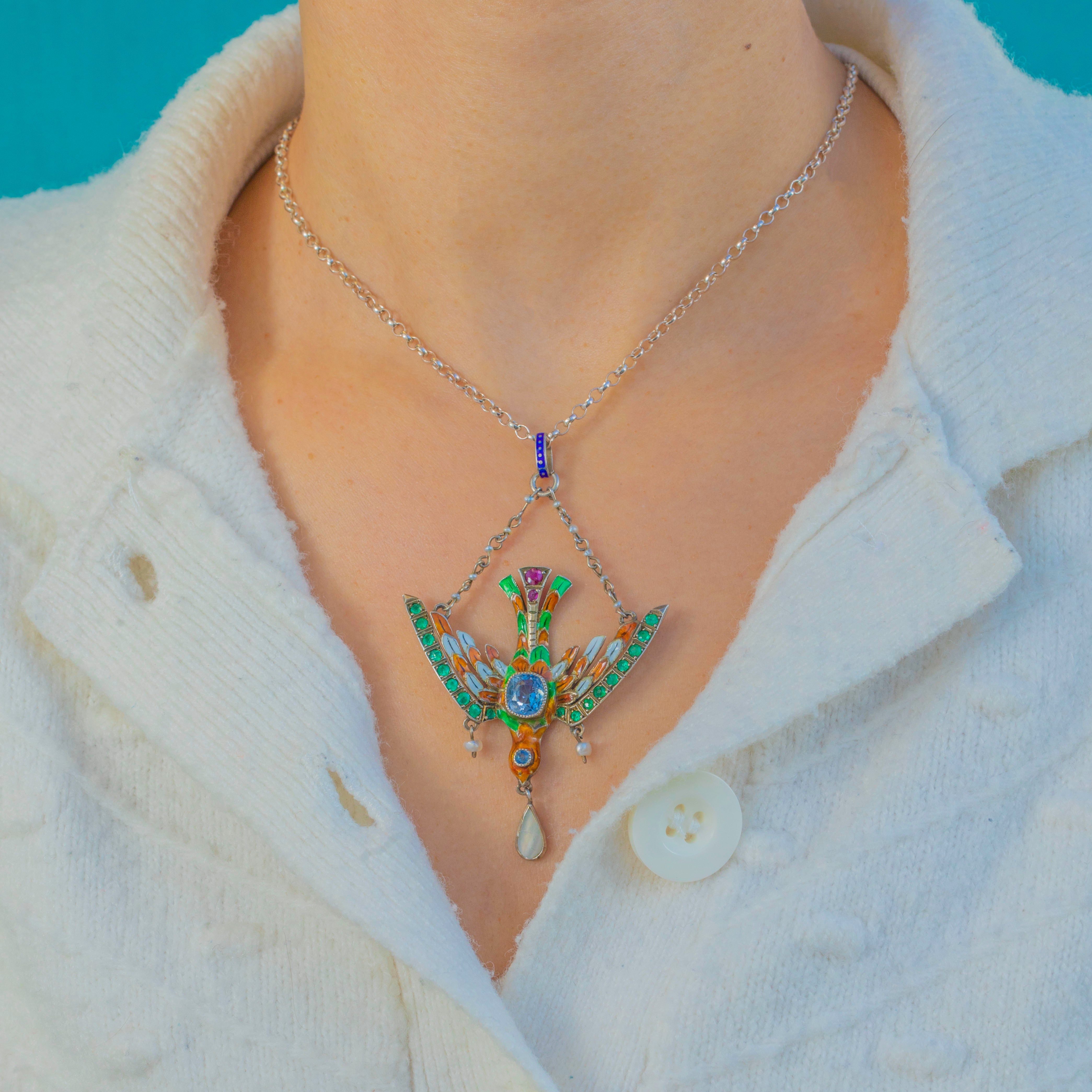 The colour palette is exquisite: white, green and orange Enamel, a playful blue-and-white polka-dot Enamel bale, sparkling natural Sapphires and Rubies, and soft, lustrous natural Pearls. A Mother-of-Pearl teardrop suspends from a delicate Pearl chain, finishing the piece with a romantic, devotional flourish. Spectacular, deeply symbolic and highly collectable, this pendant would be the star of any antique jewellery collection.