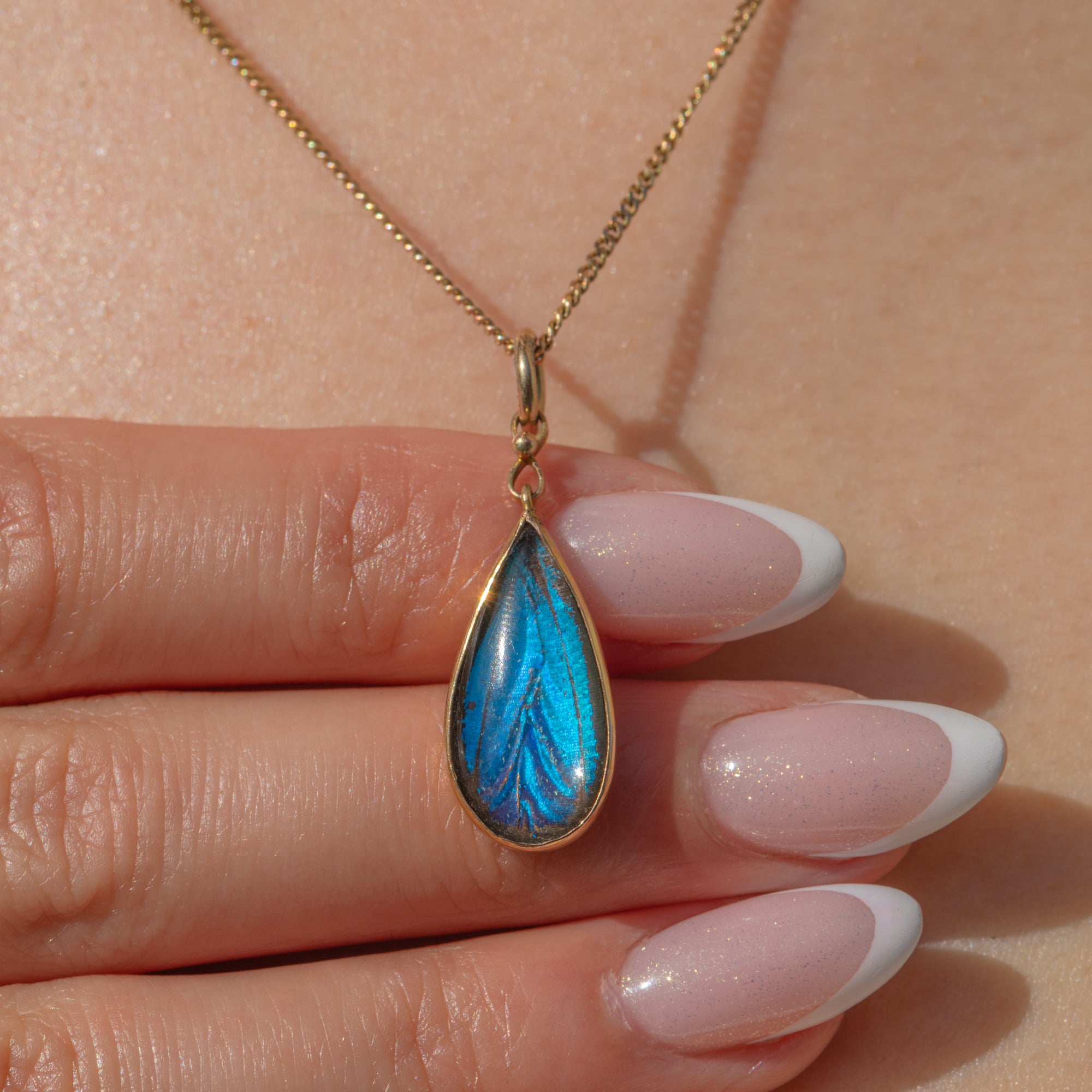 The iridescent wing is encased in a buttery 9ct Gold bezel setting in an elegant teardrop shape. The vibrance of this antique butterfly wing pendant will ensure that you stand out from the crowd when it's adoring your décolletage!