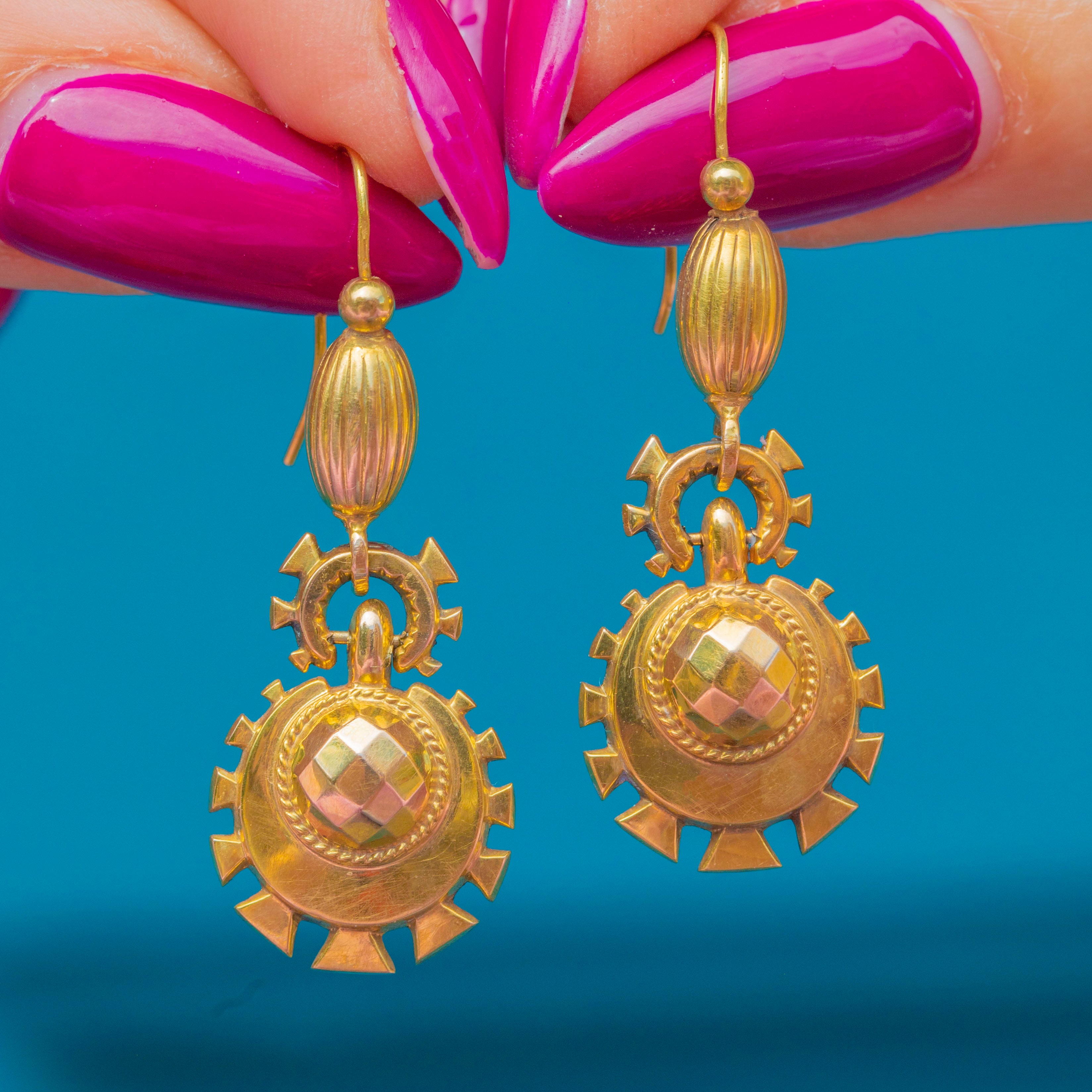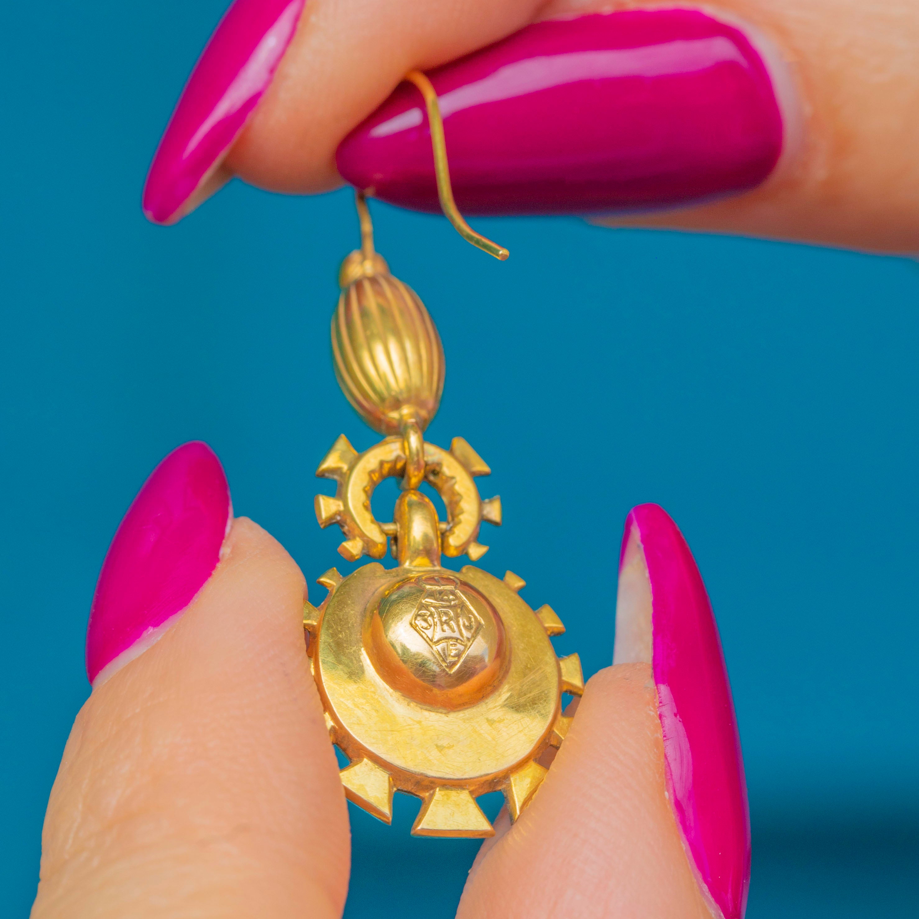 They are complete with a rare Victorian registration mark, dating these earrings to 14th May 1880. Radiating antique charm and dancing with movement as they suspend from your lobes, these glossy Gold Etruscan earrings are a wonderfully glamorous pair.
