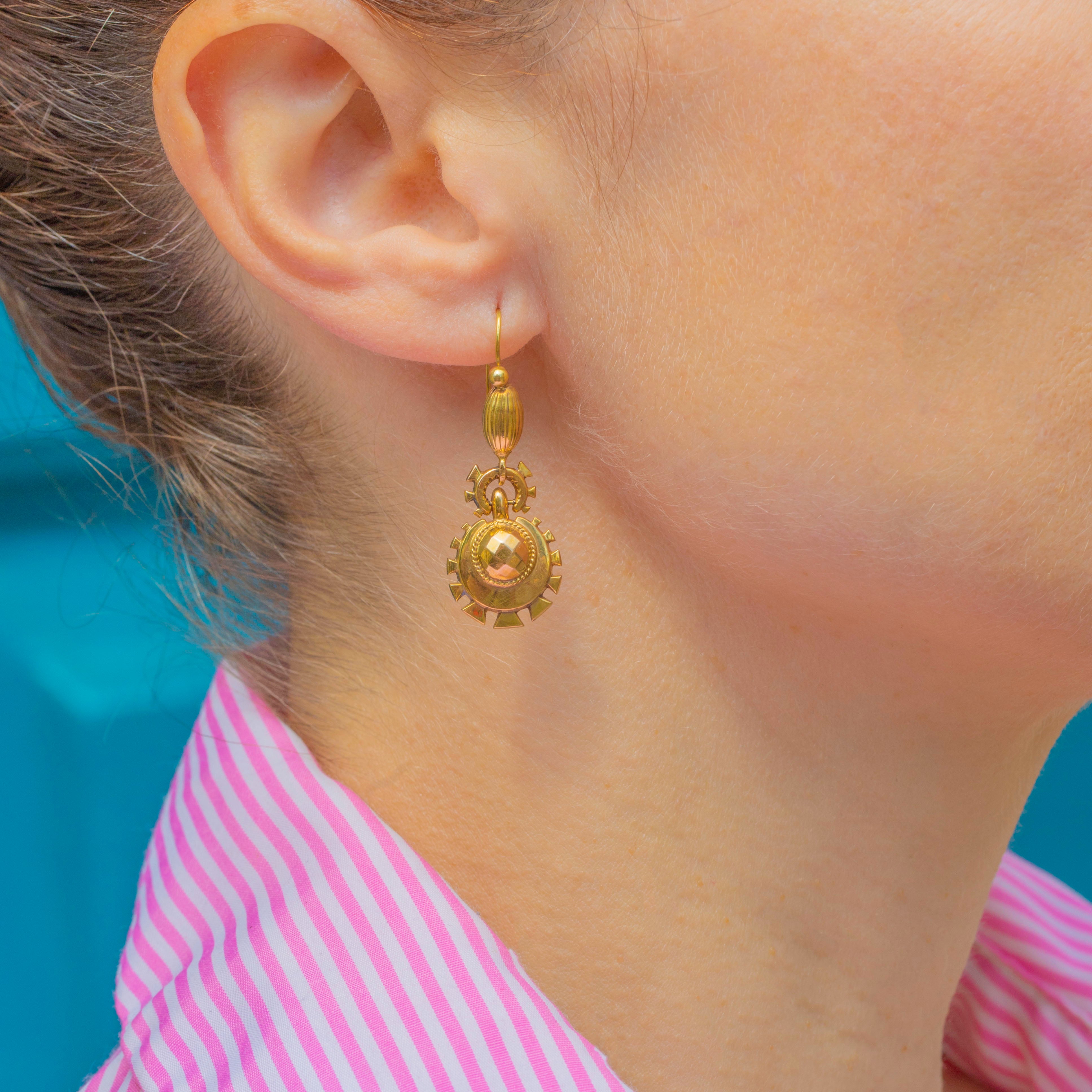 EXCELLENT: The Gold is bright and glossy and has retained a wonderful form, with no dings or scuffs to note. The registry stamp is crisp and legible, and with securely soldered hooks, these Victorian earrings can be worn with utmost confidence.
