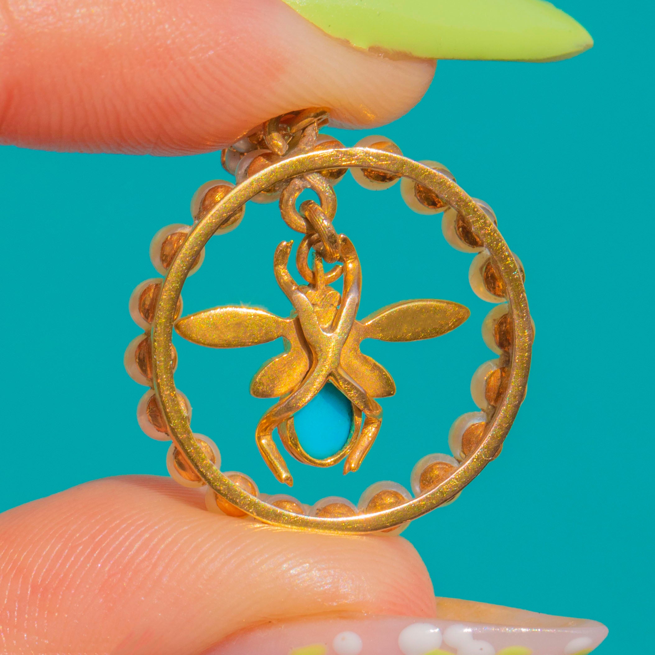 A charming Victorian fly pendant in rich 15ct Gold, set with luminous Pearls and a vivid Turquoise cabochon. A halo of Seed Pearls forms a delicate wreath, while the articulated fly at the centre is beautifully detailed with a round Pearl head, elongated Pearl-set wings and an oval Turquoise body. The tapered bail is accented with three tiny Pearls for a refined finishing touch.