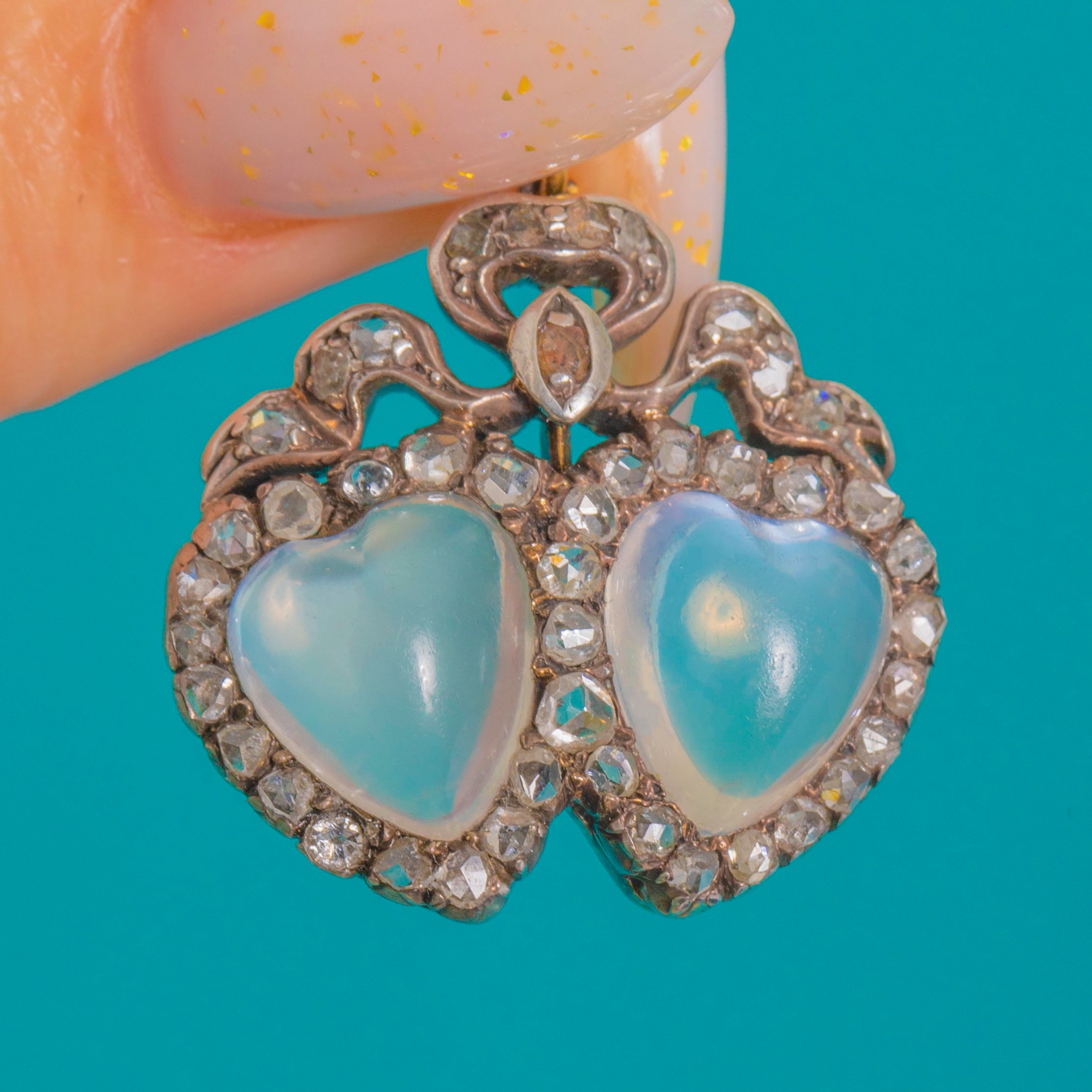 RARE Victorian Moonstone Cabochon Diamond Bow Heart Pendant