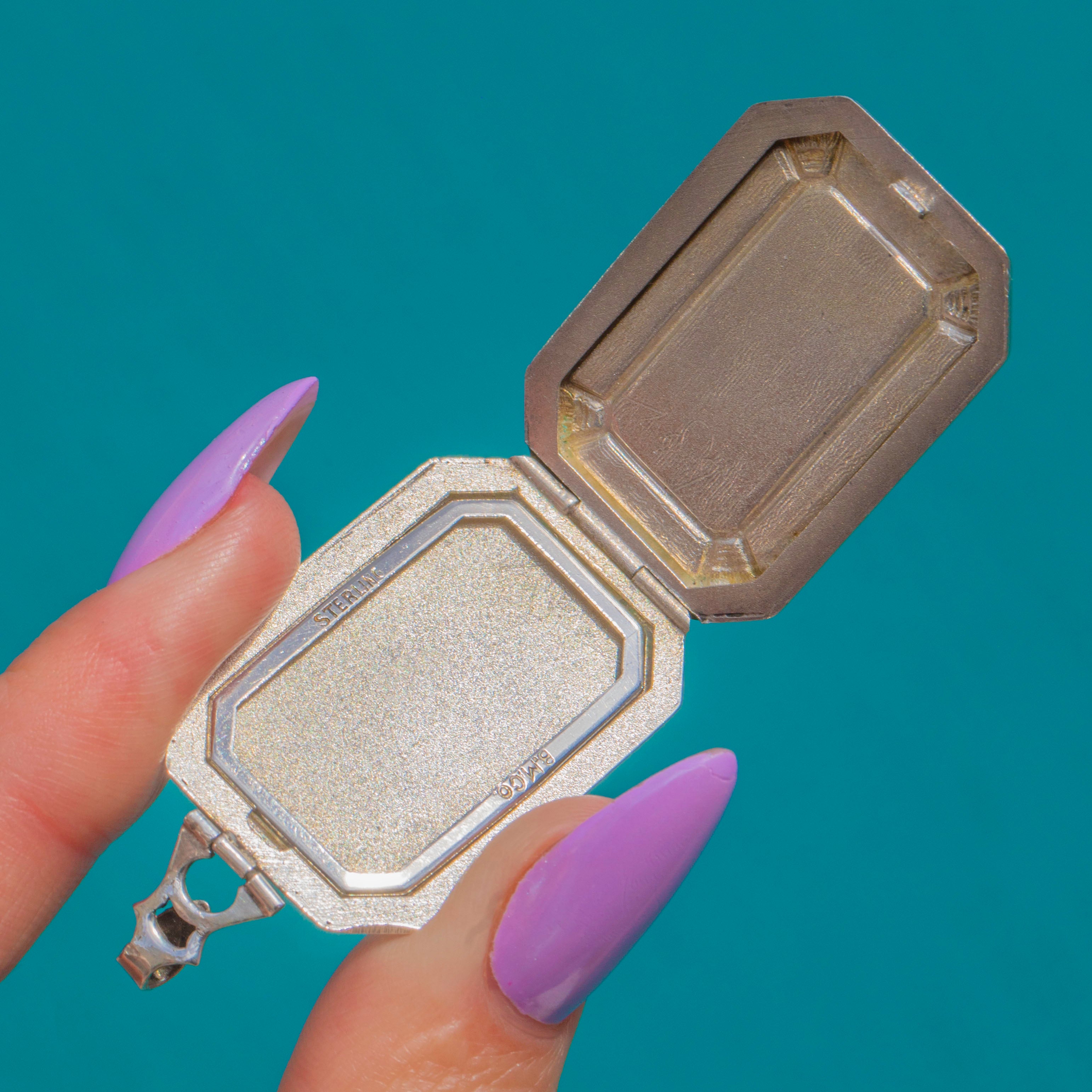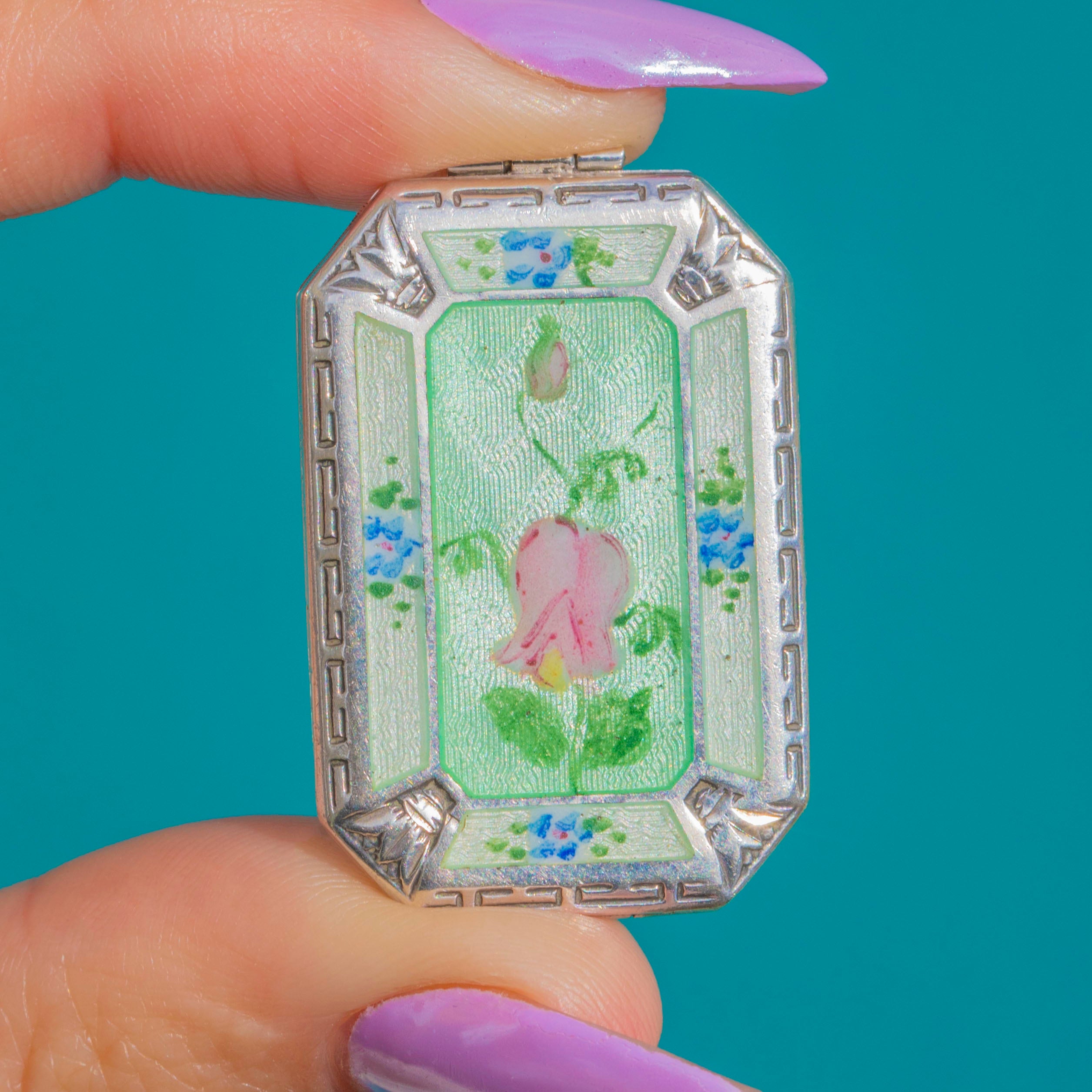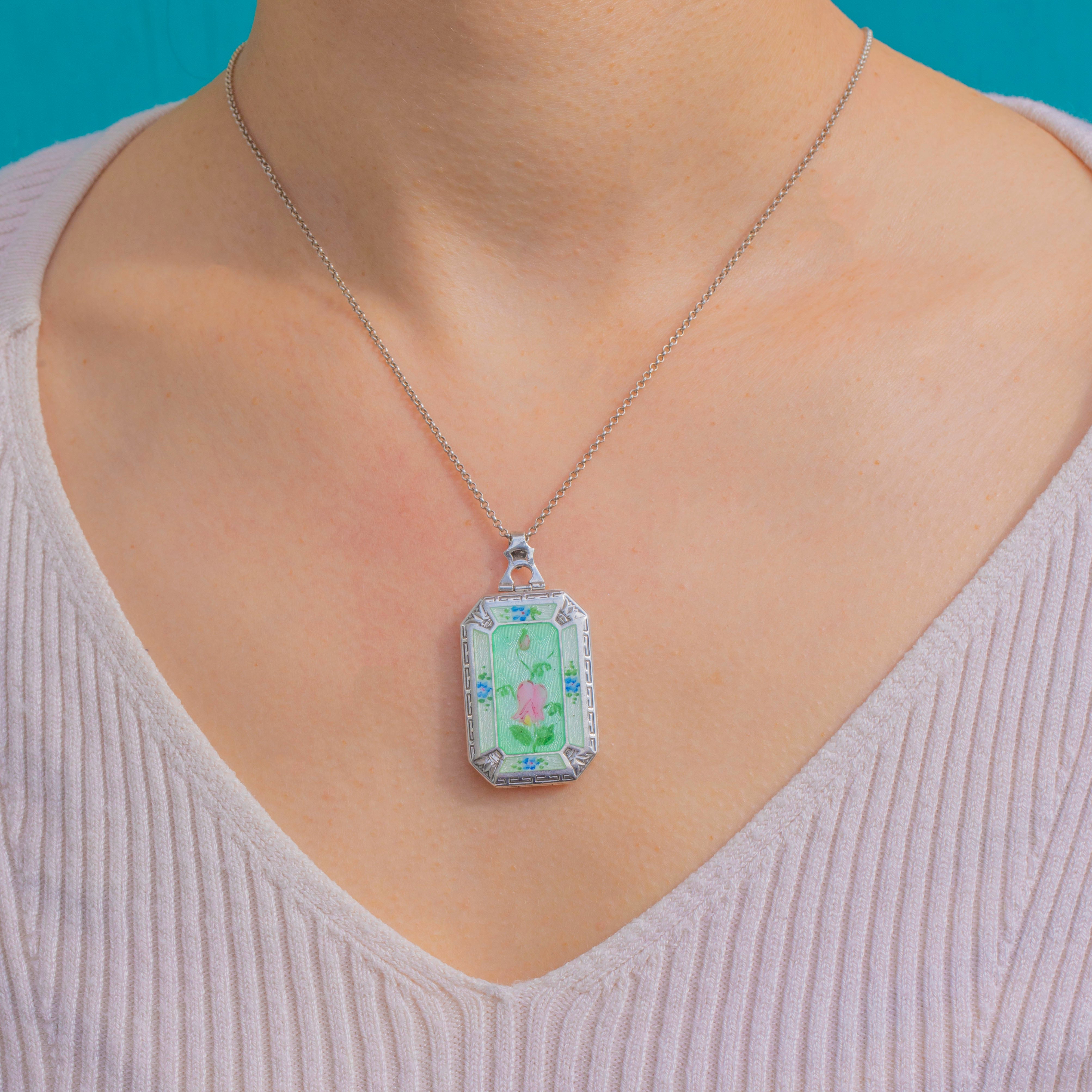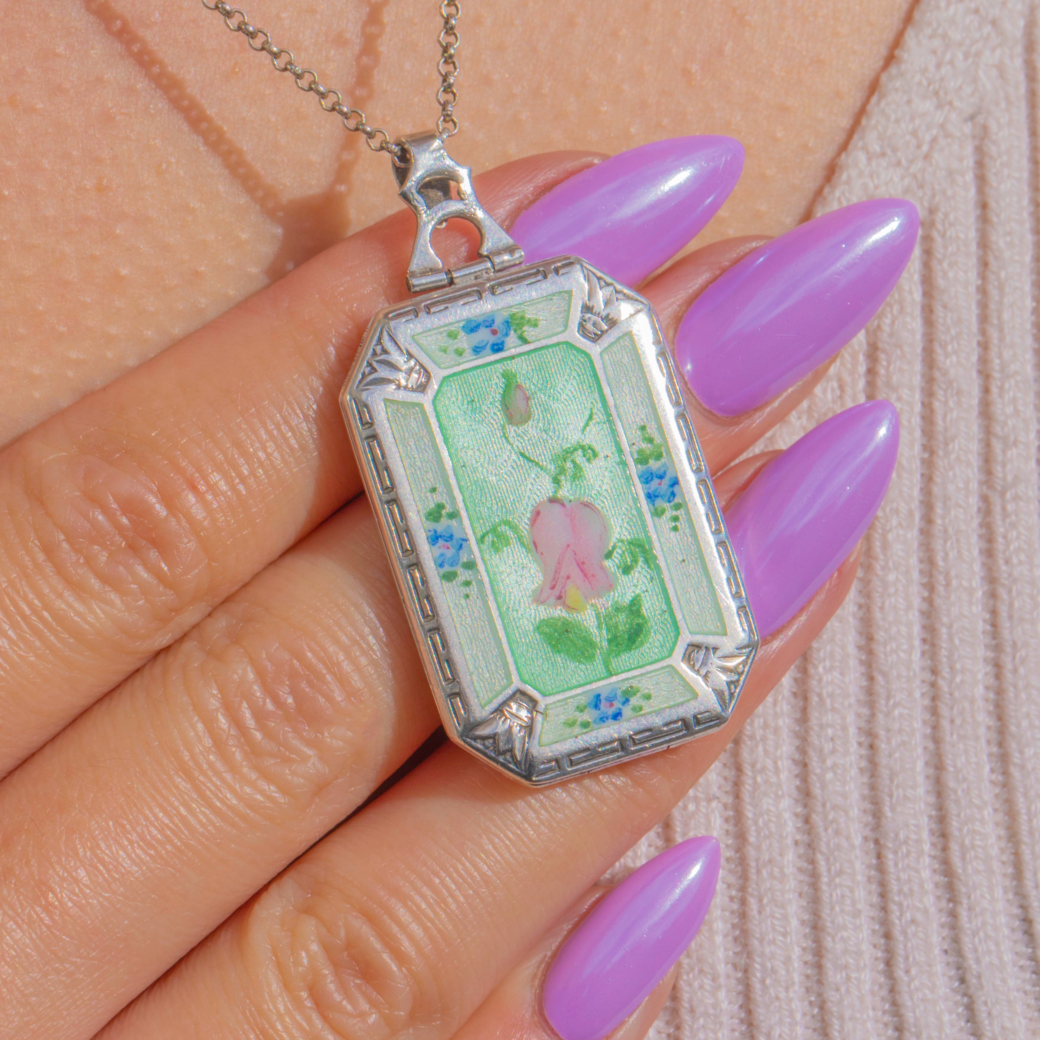 A darling Art Deco guilloché Enamel locket in Sterling Silver, delicately painted with a blush-pink floral bud and tiny sky-blue sprays on a pale sea-green ground. The engine-turned pattern shimmers beneath the translucent Enamel, framed by an elegant octagonal-rectangular border with refined engraved accents and a decorative bail.