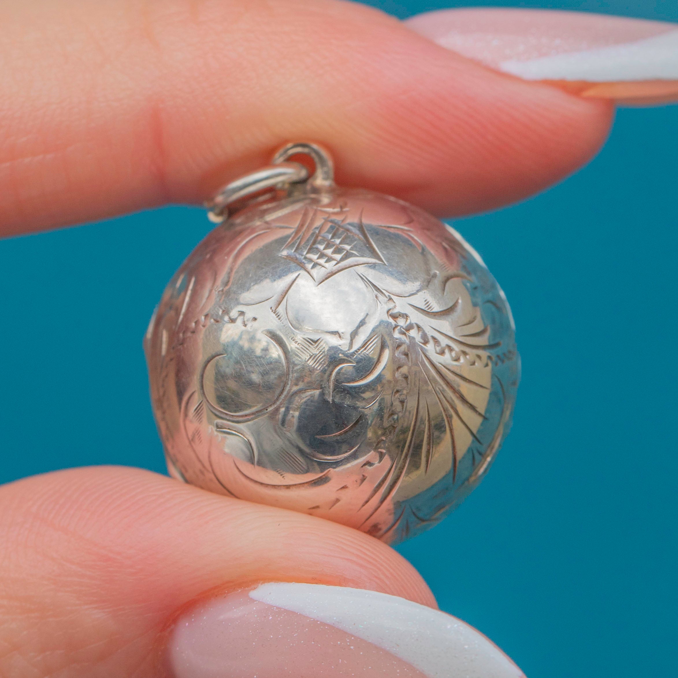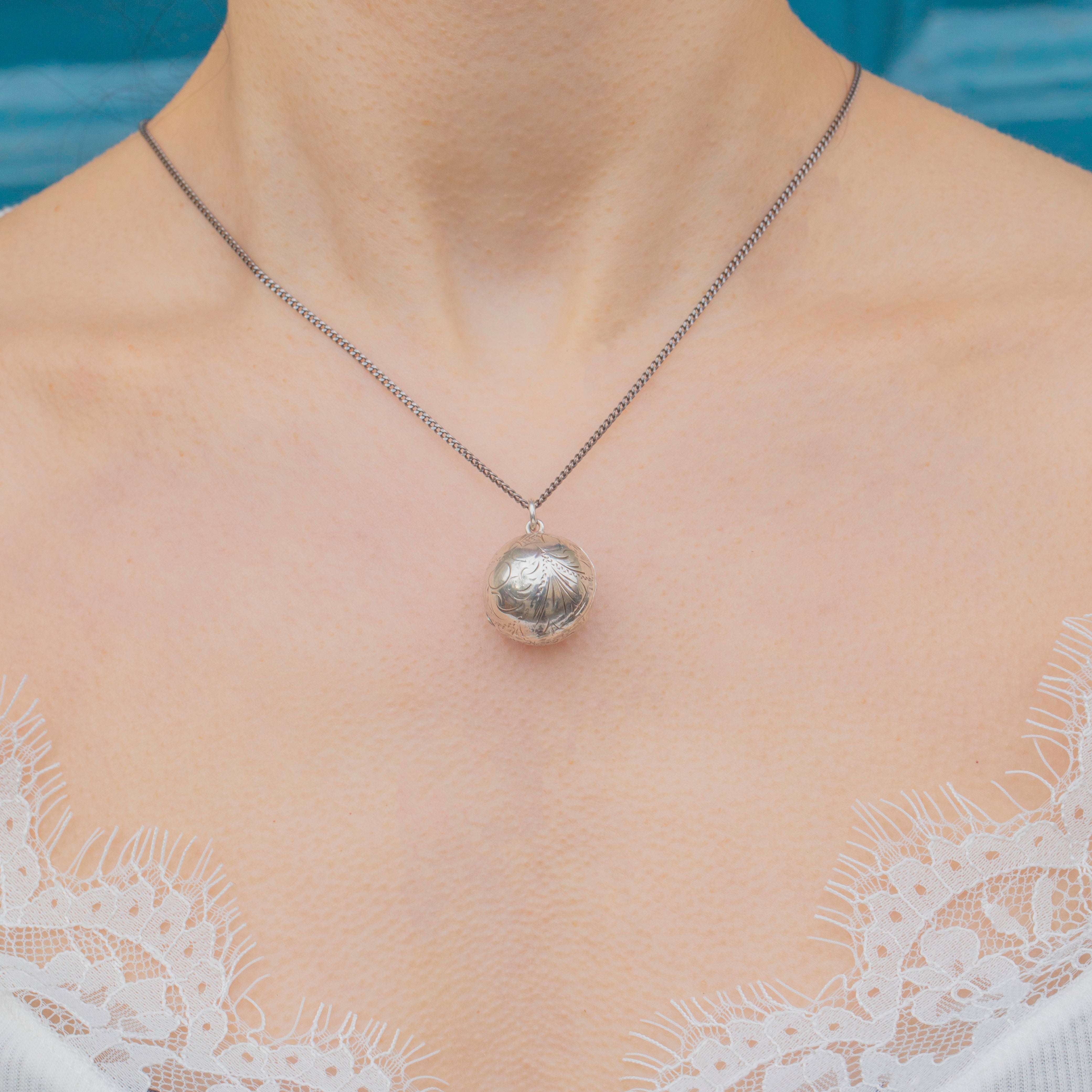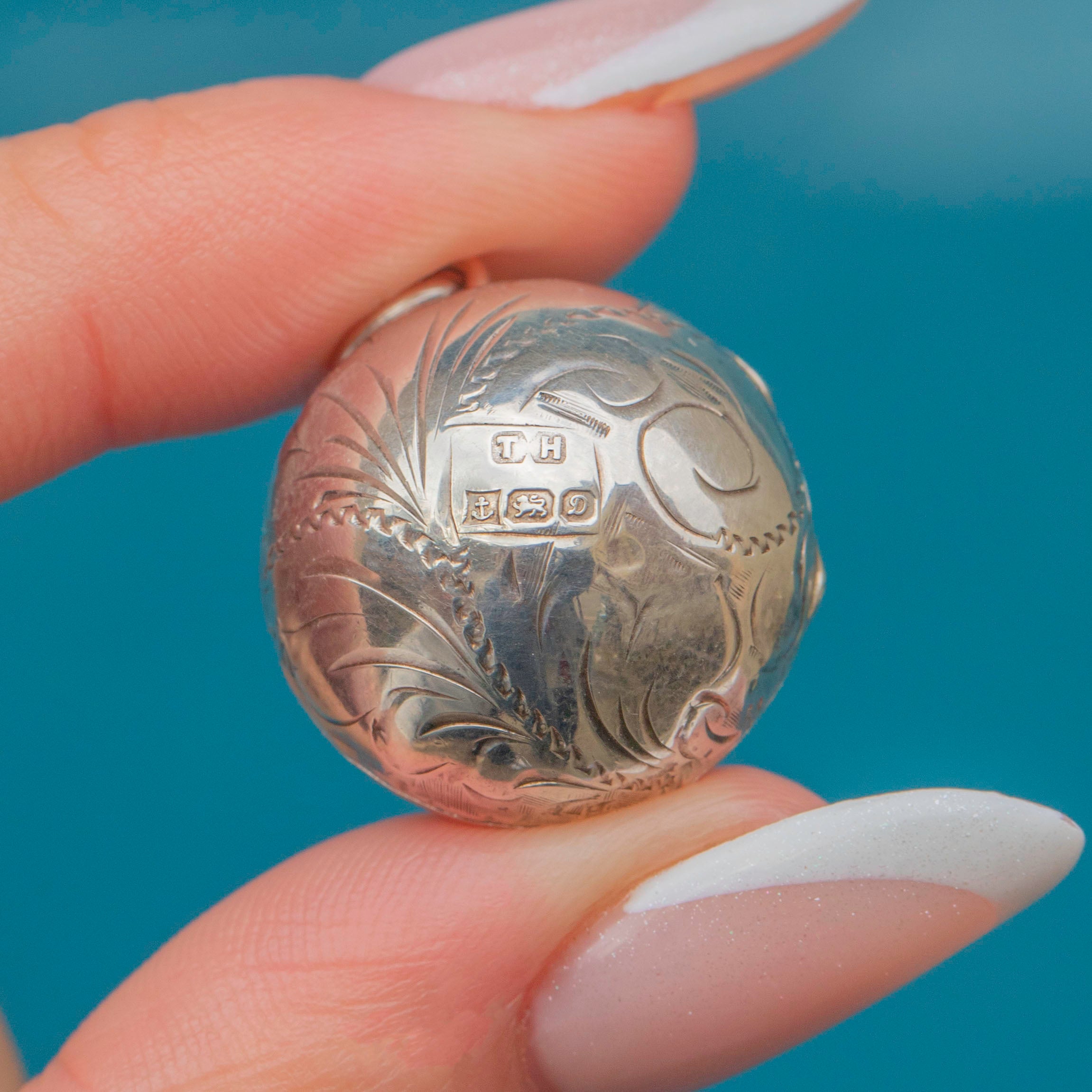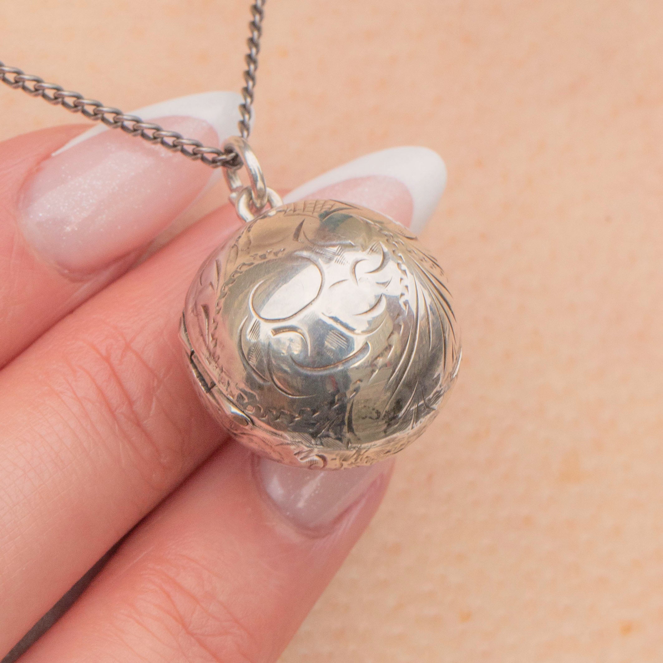 This sweet Silver engraved orb locket pendant will make the perfect abode for your most cherished photographs! Crafted from lustrous Sterling Silver with a bright shine finish, this vintage orb locket is covered in whimsical engravings and opens to reveal two doors inside.