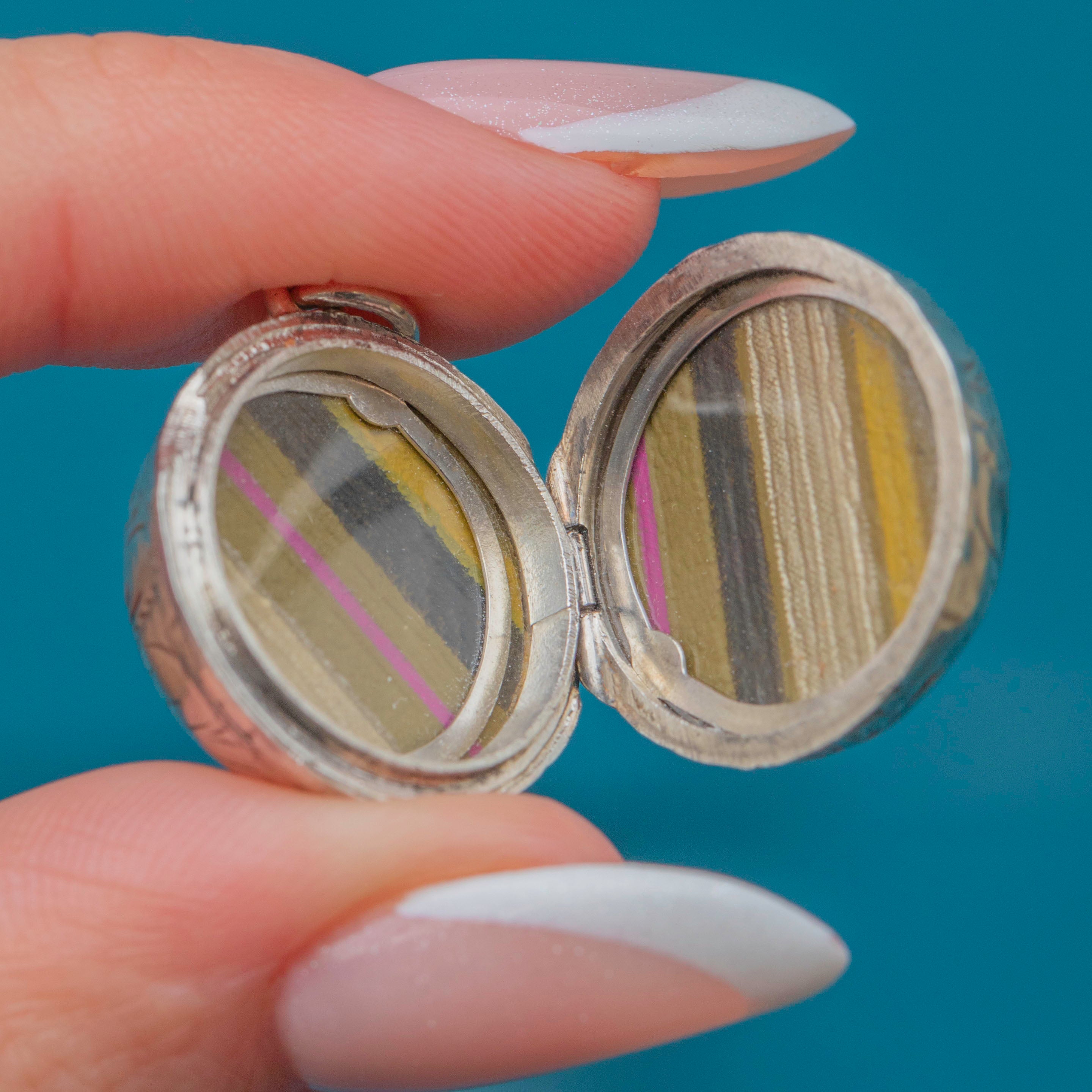 VERY GOOD-EXCELLENT: This Silver engraved orb locket pendant is in wonderful condition. The Silver is glossy, and the surface of the locket is smooth with no dings or dents. The engravings have accrued a light patina, making the details pop. There is some general mild wear throughout, as to be expected with age, but this is only noticeable under close inspection. Complete with two frames and with the locket closing securely, you can keep your precious memories safely inside!