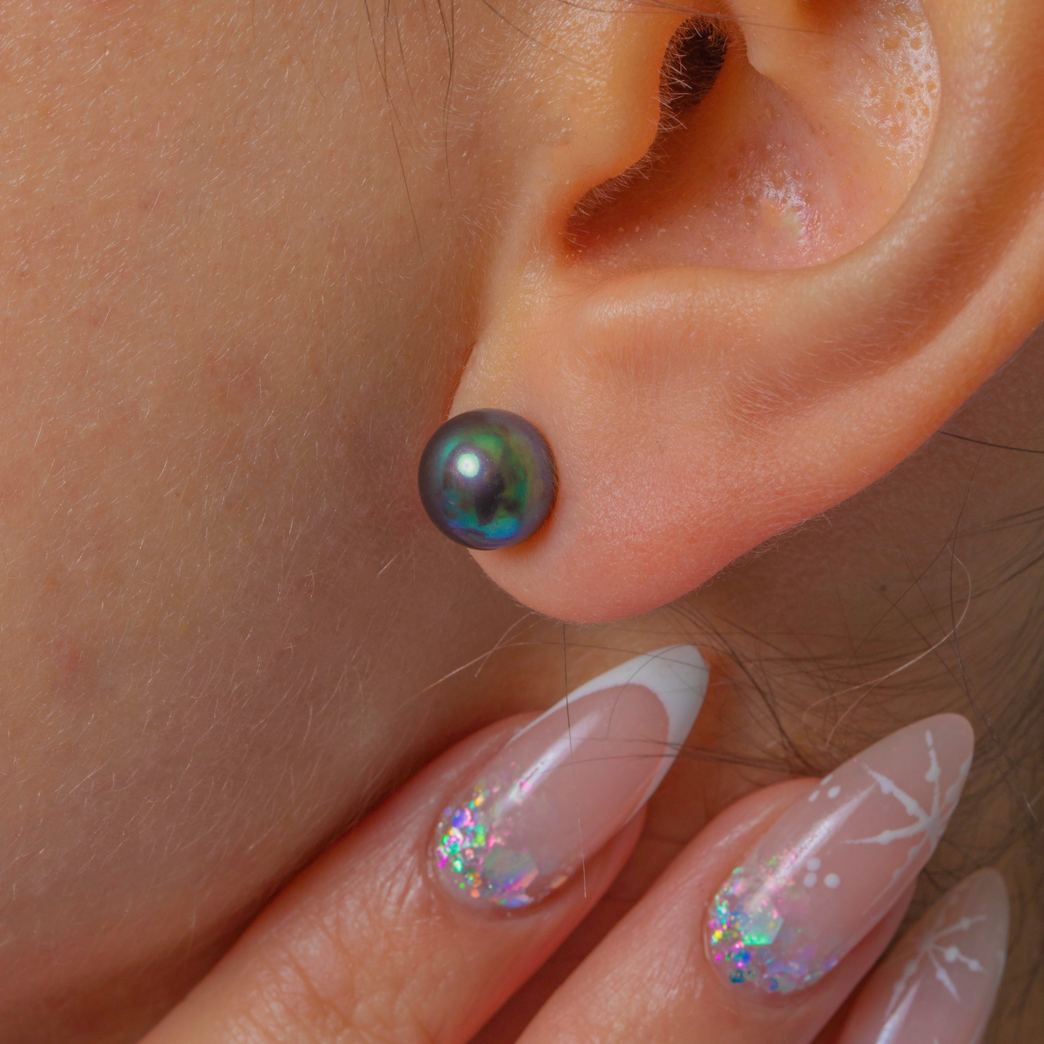 These Vintage Peacock Pearl stud earrings are a timeless classic. The lustrous 8mm Pearls display beautiful natural sheen and depth, making them effortlessly elegant for everyday wear or special occasions.