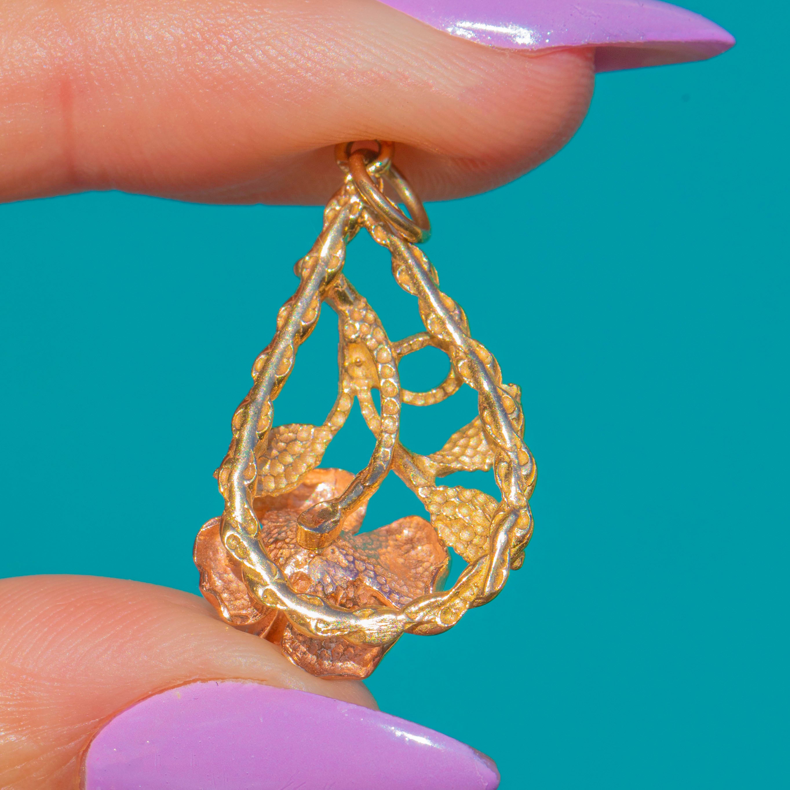Delicately openworked and highly polished, it catches the light from every angle while celebrating nature in its purest form. British hallmarks to the pendant confirm 9ct Gold and Birmingham origin, with the date letter obscured.