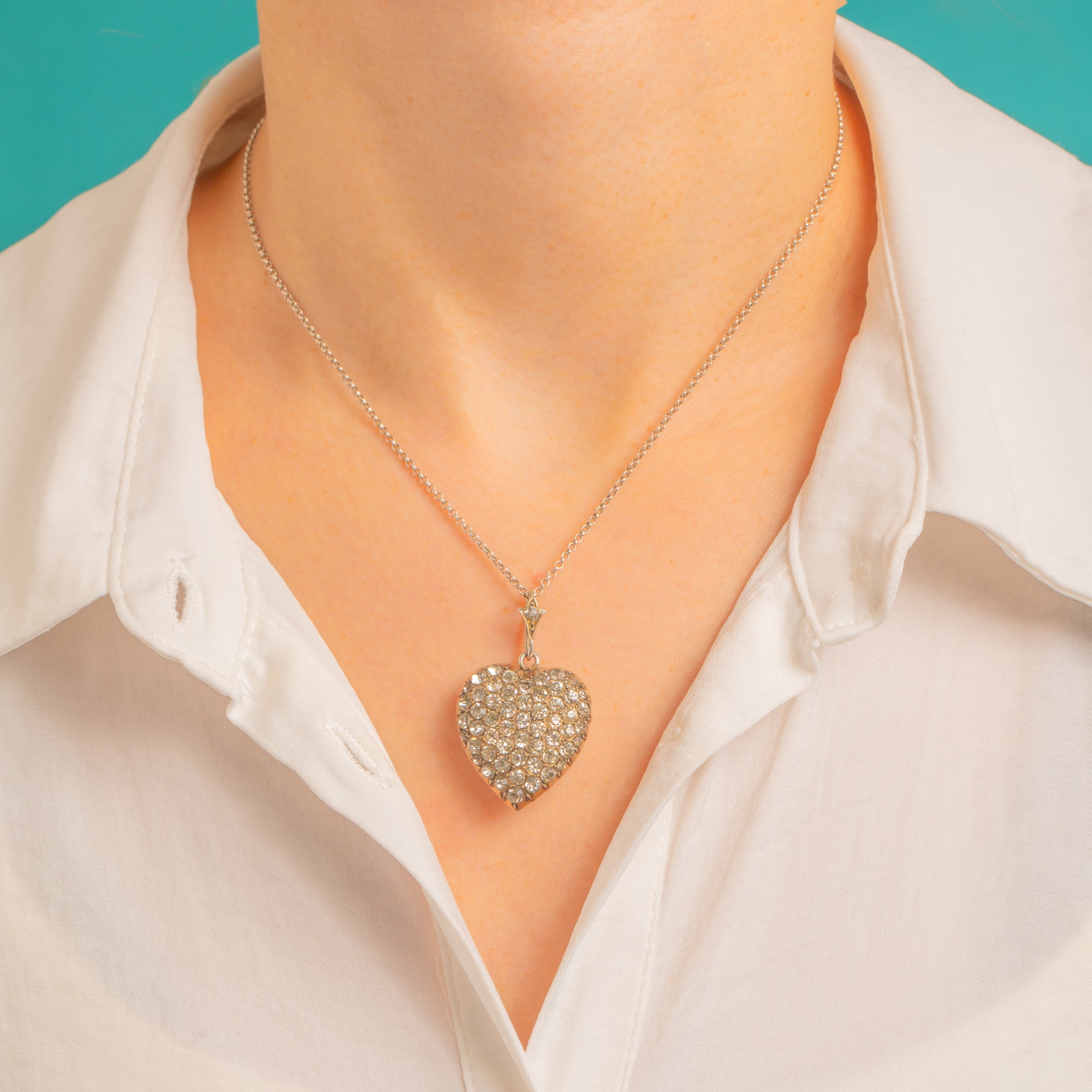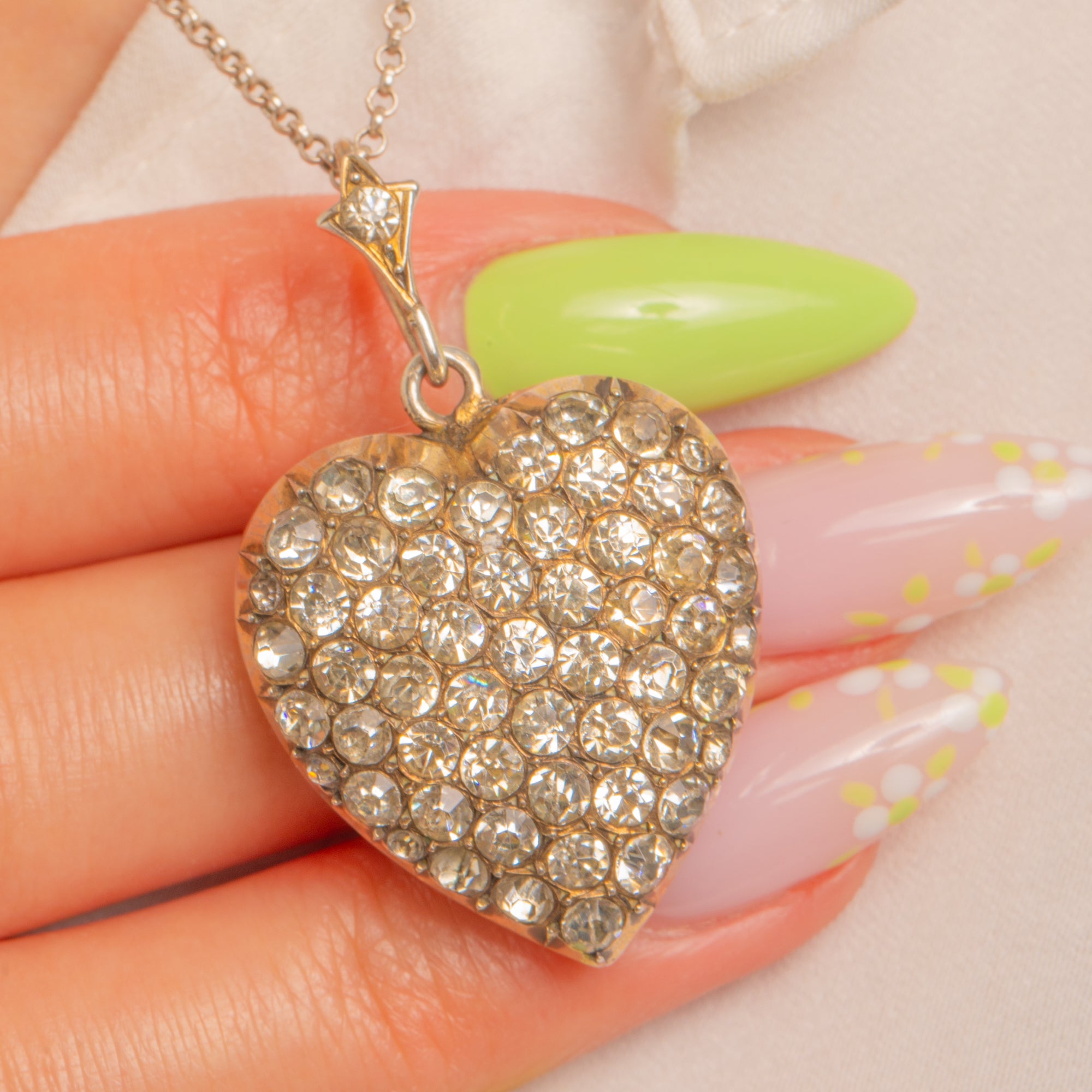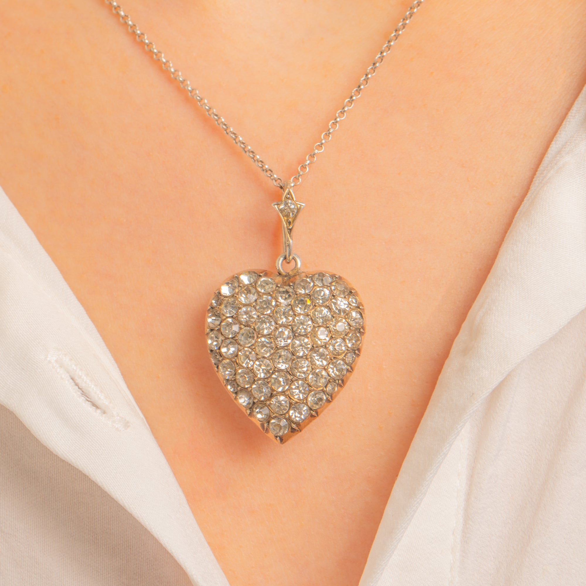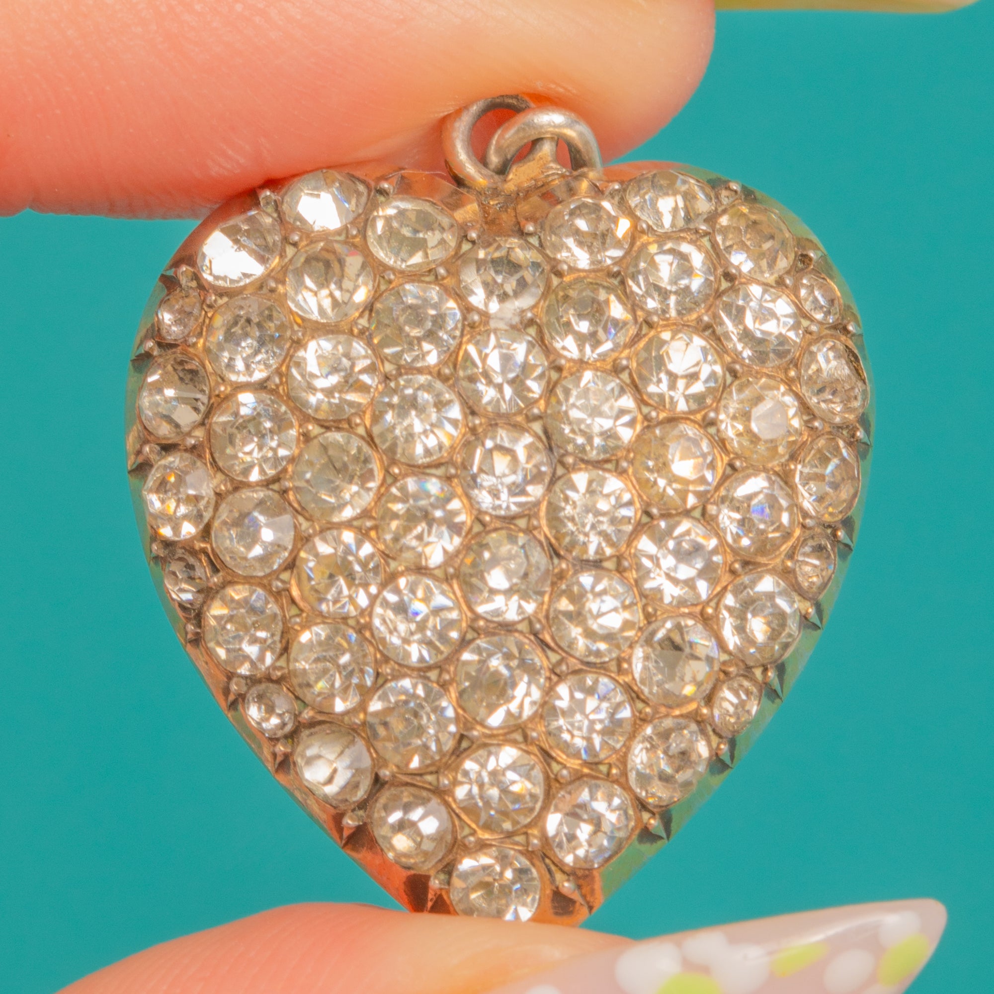 A luminous heart steeped in turn-of-the-century romance, this Late Victorian/Early Edwardian Paste pendant shimmers from every angle. Crafted in Sterling Silver, the heart is paved with tiny round Paste gemstones that catch and scatter the light with a delicious, Diamond-bright sparkle.