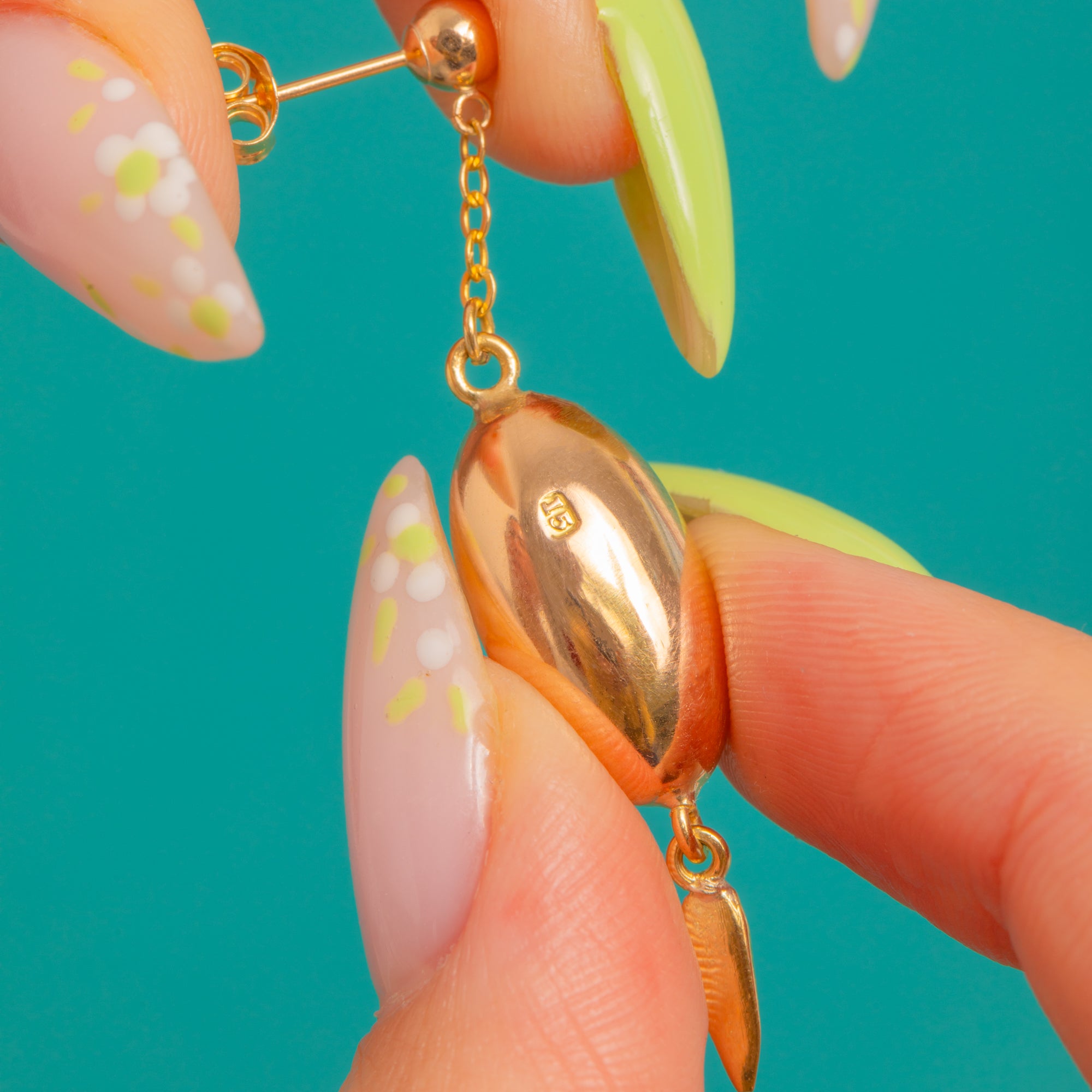 Sleek, sculptural and undeniably elegant, these Victorian torpedo drop earrings are beautifully rendered in glowing 15ct Gold. From a polished ball stud, a short length of chain leads the eye to a smooth elongated oval and a tapering finial, creating that classic torpedo silhouette with delicious, mirror-bright shine and graceful movement.