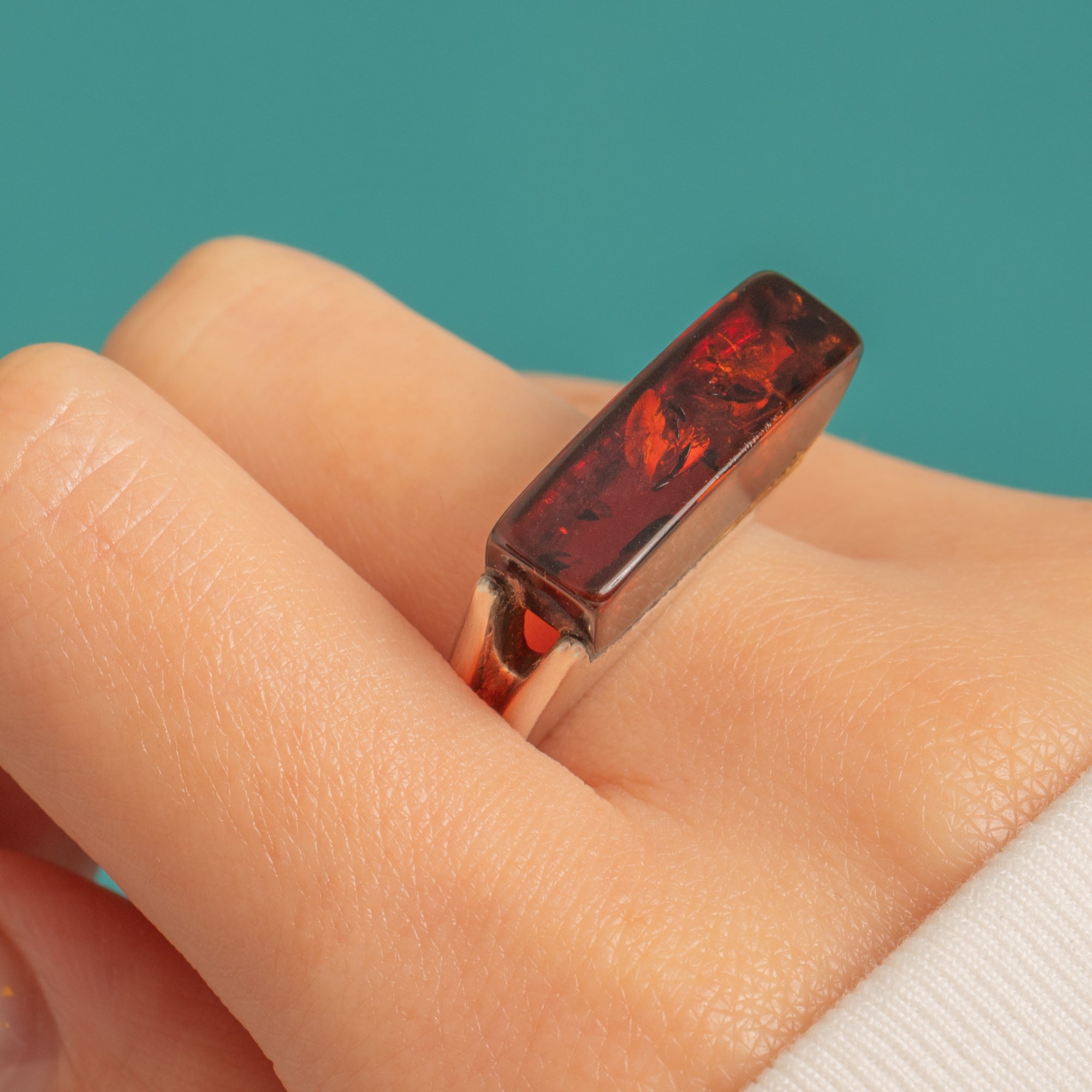 Sleek, sculptural and effortlessly bold, this Sterling Silver statement ring captures a distinctly Modernist mood. An elongated rectangular Amber cabochon sits in a smooth, substantial bezel, creating clean architectural lines that span the finger with confident presence.