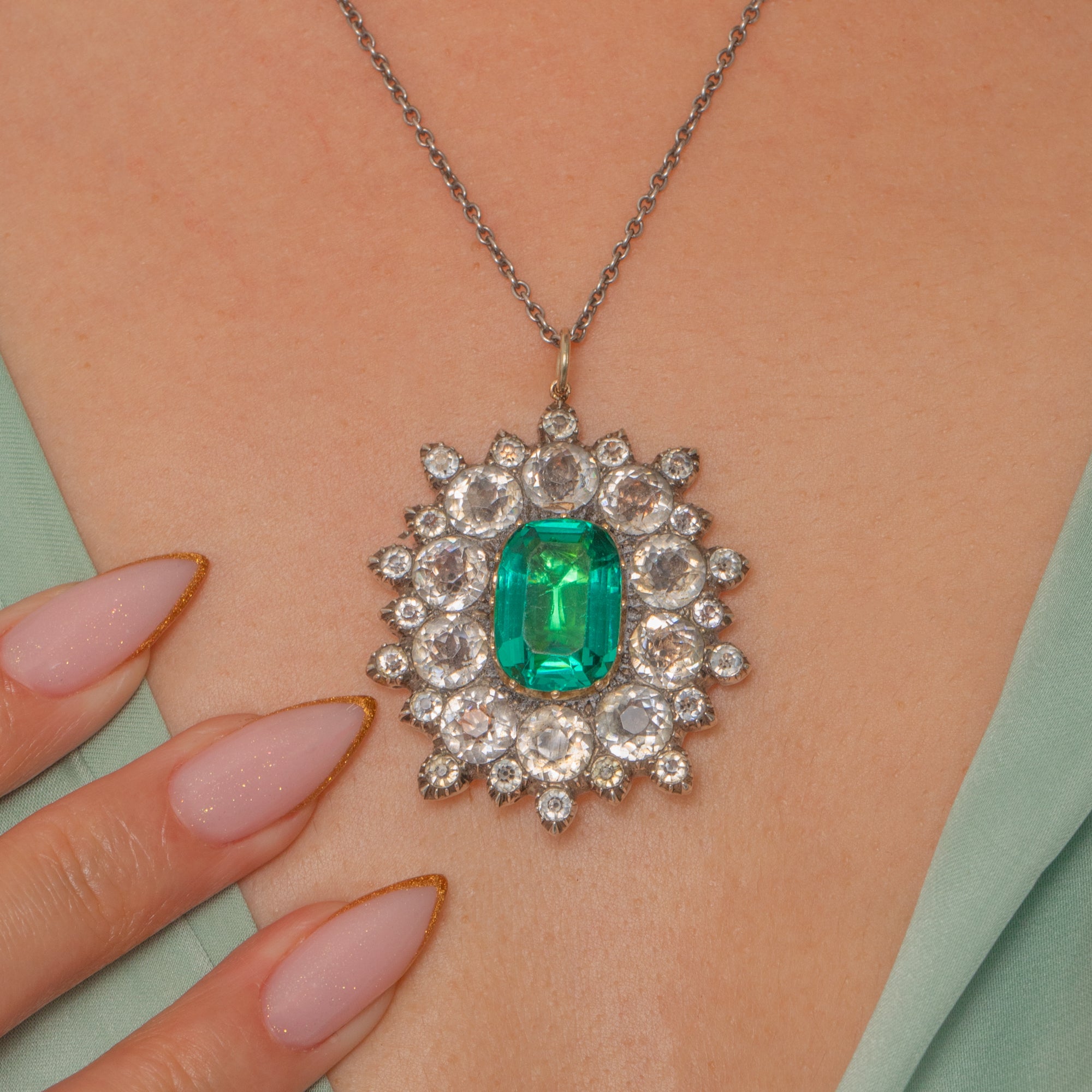 This striking Georgian “Starburst” pendant radiates with the splendour of the era, centred by a luminous foiled green Paste, the colour of the finest Colombian Emeralds. Surrounding it, a halo of highly collectable Black Dot Paste stones form a dazzling starburst design, each one hand-set in Silver collets.