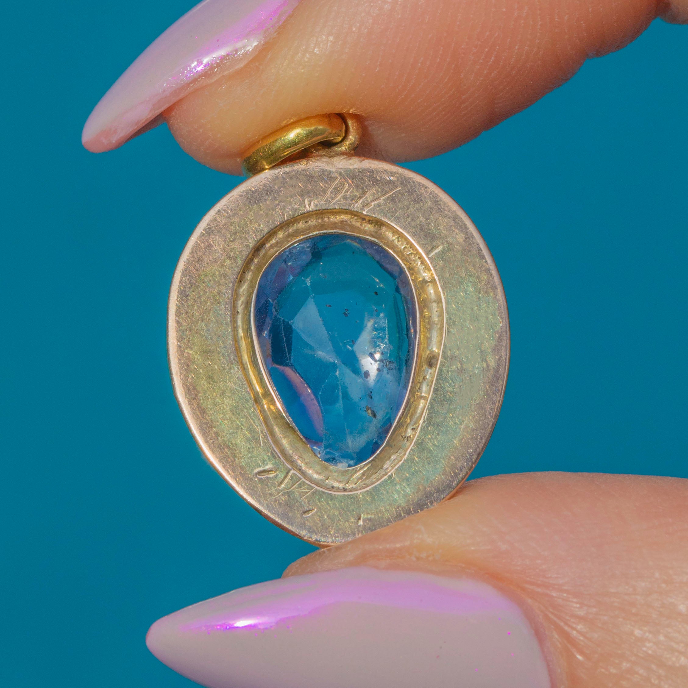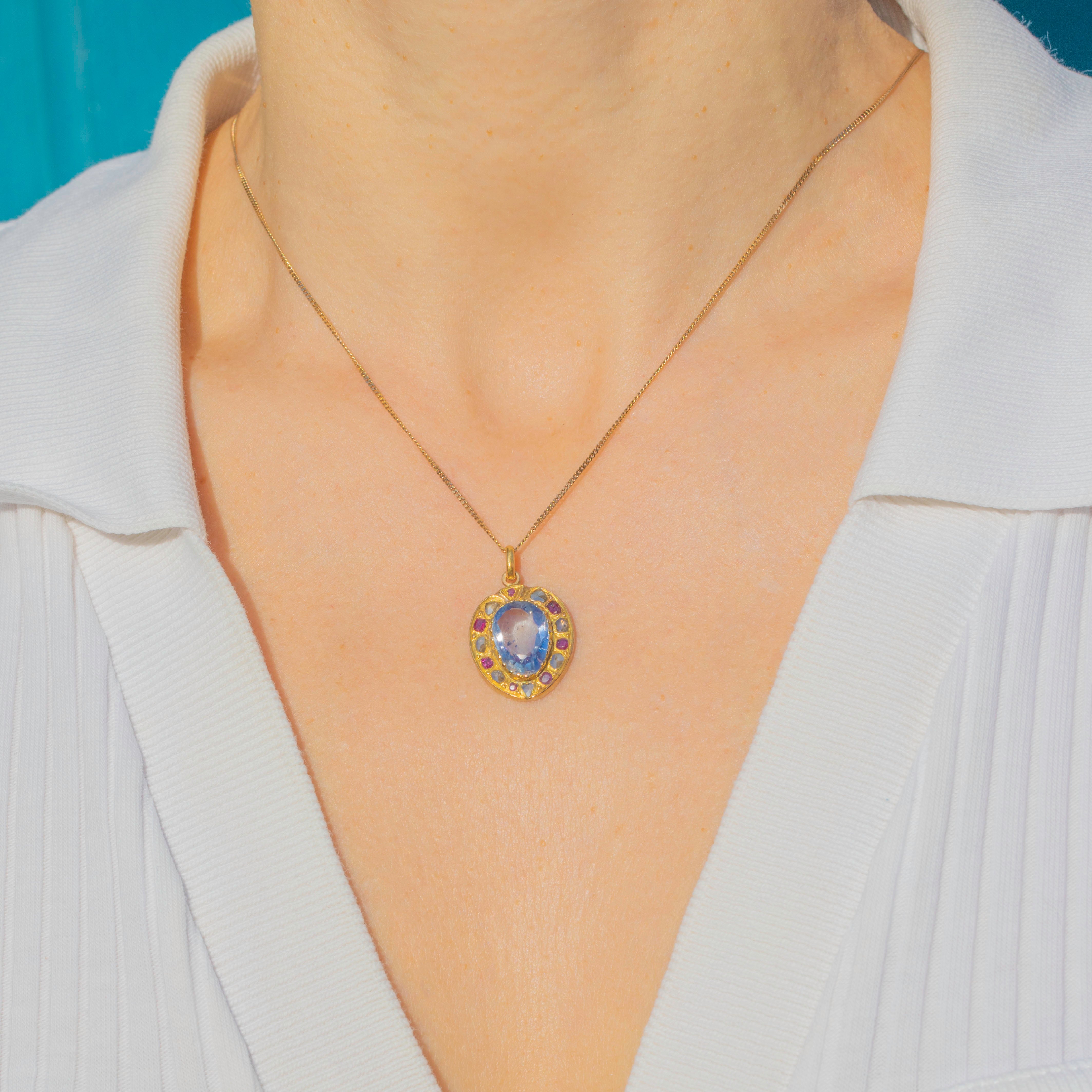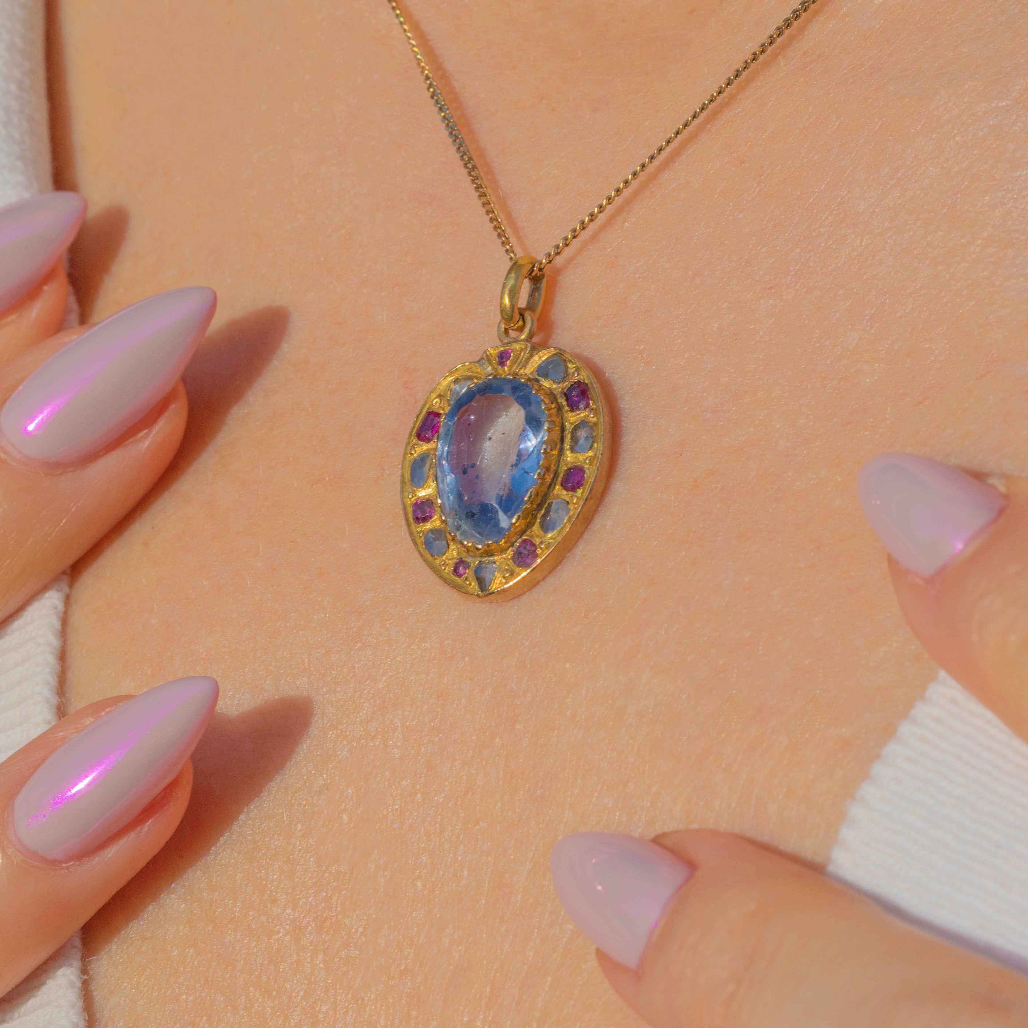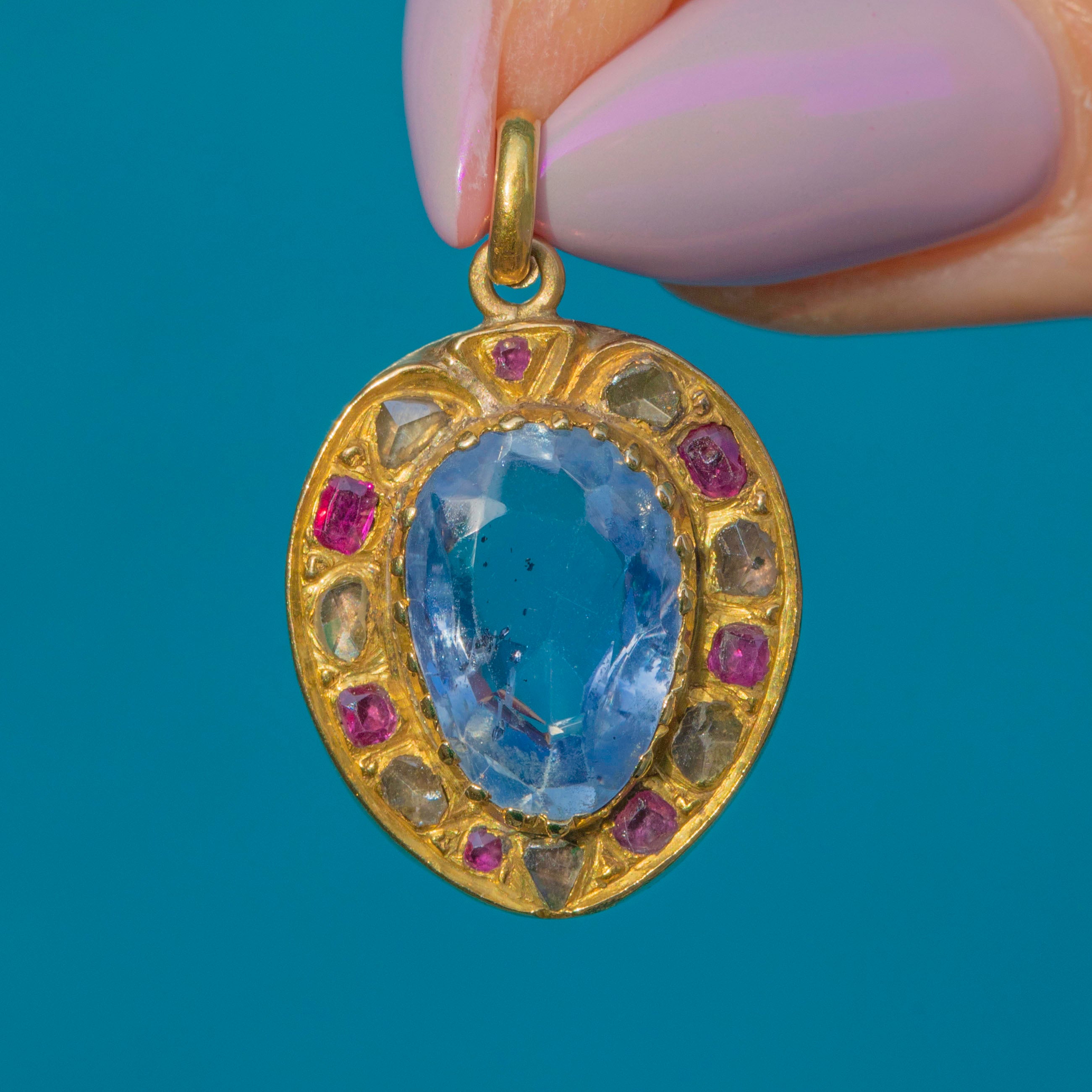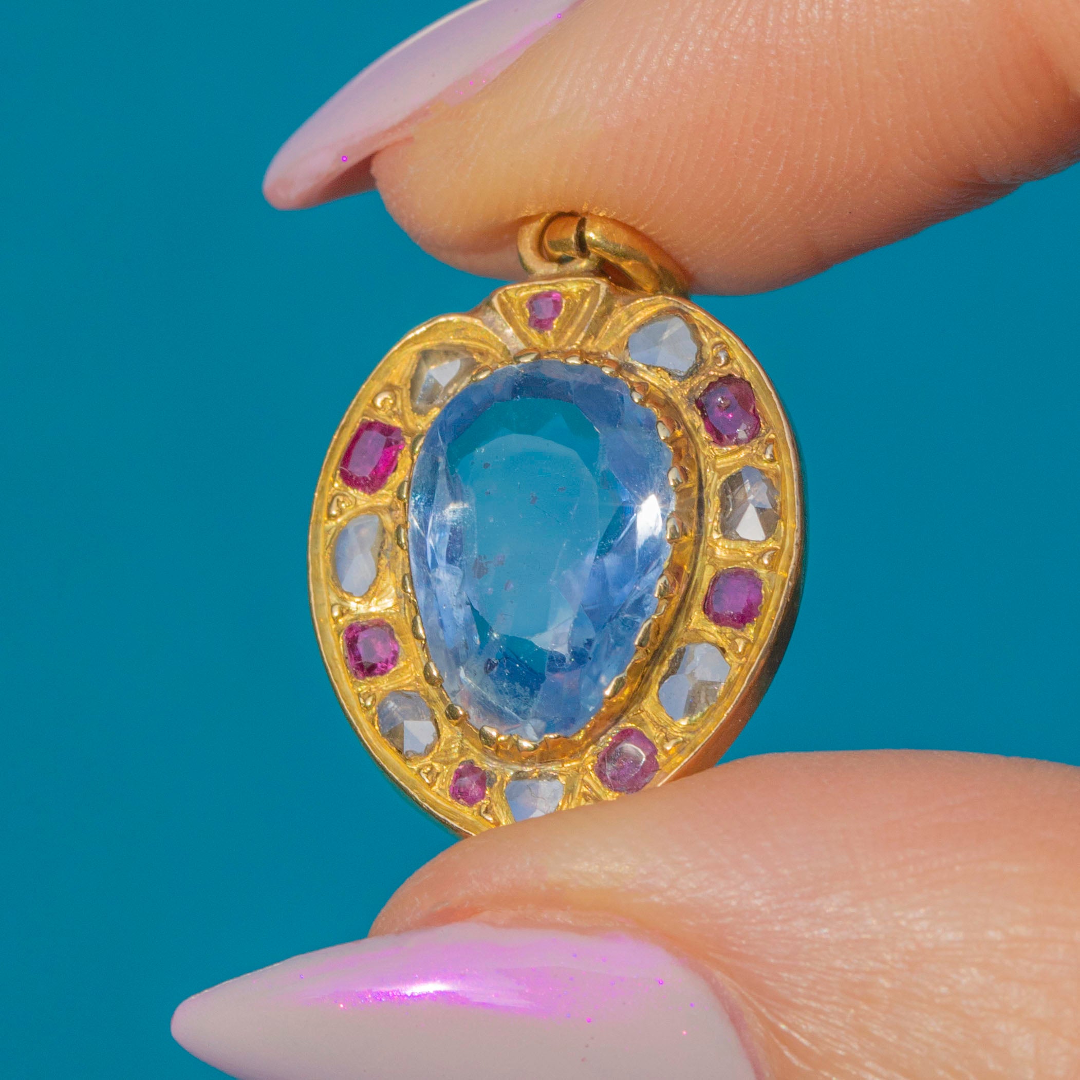 Superb 15ct Gold Natural Cornflower Sapphire, Ruby Diamond Pendant c.1840