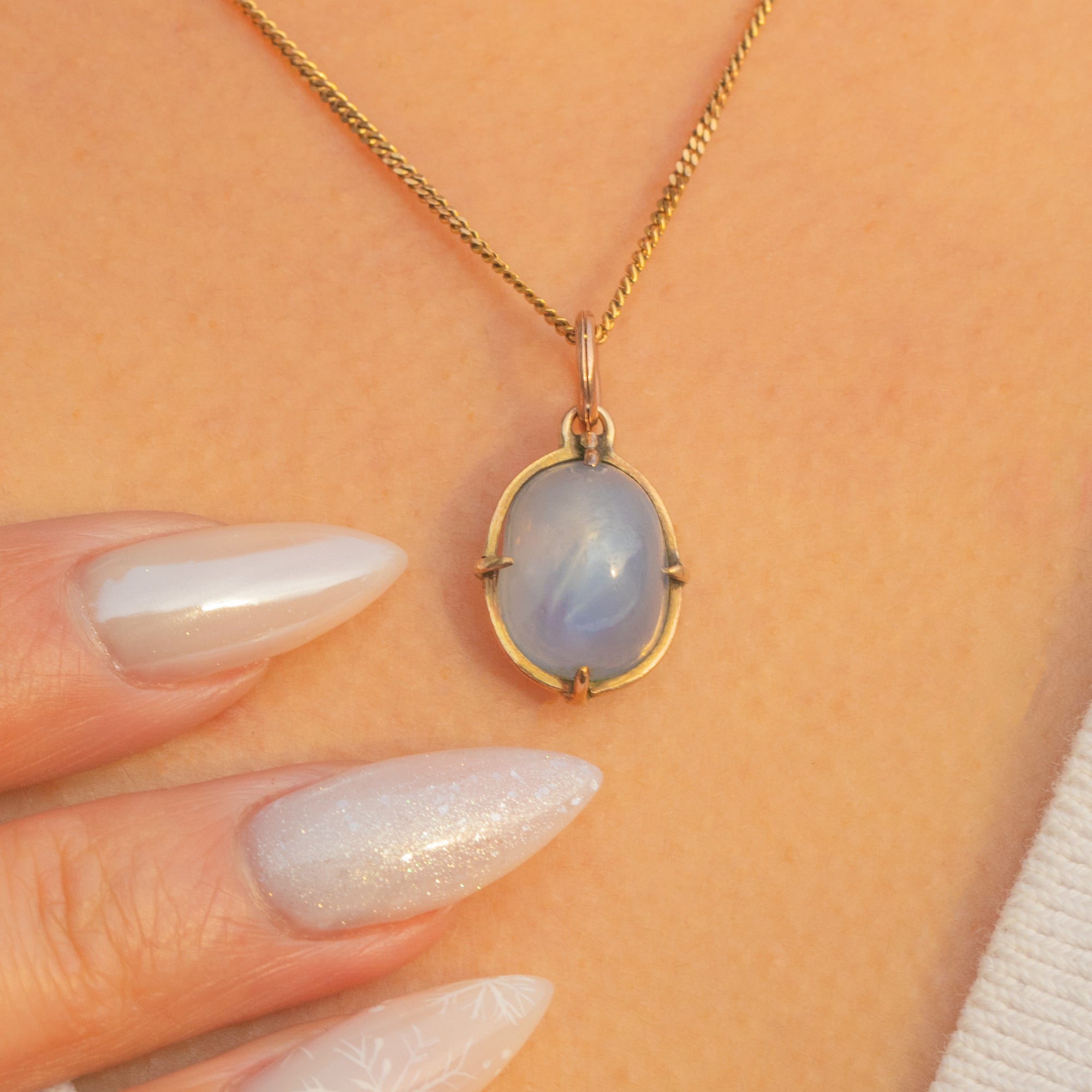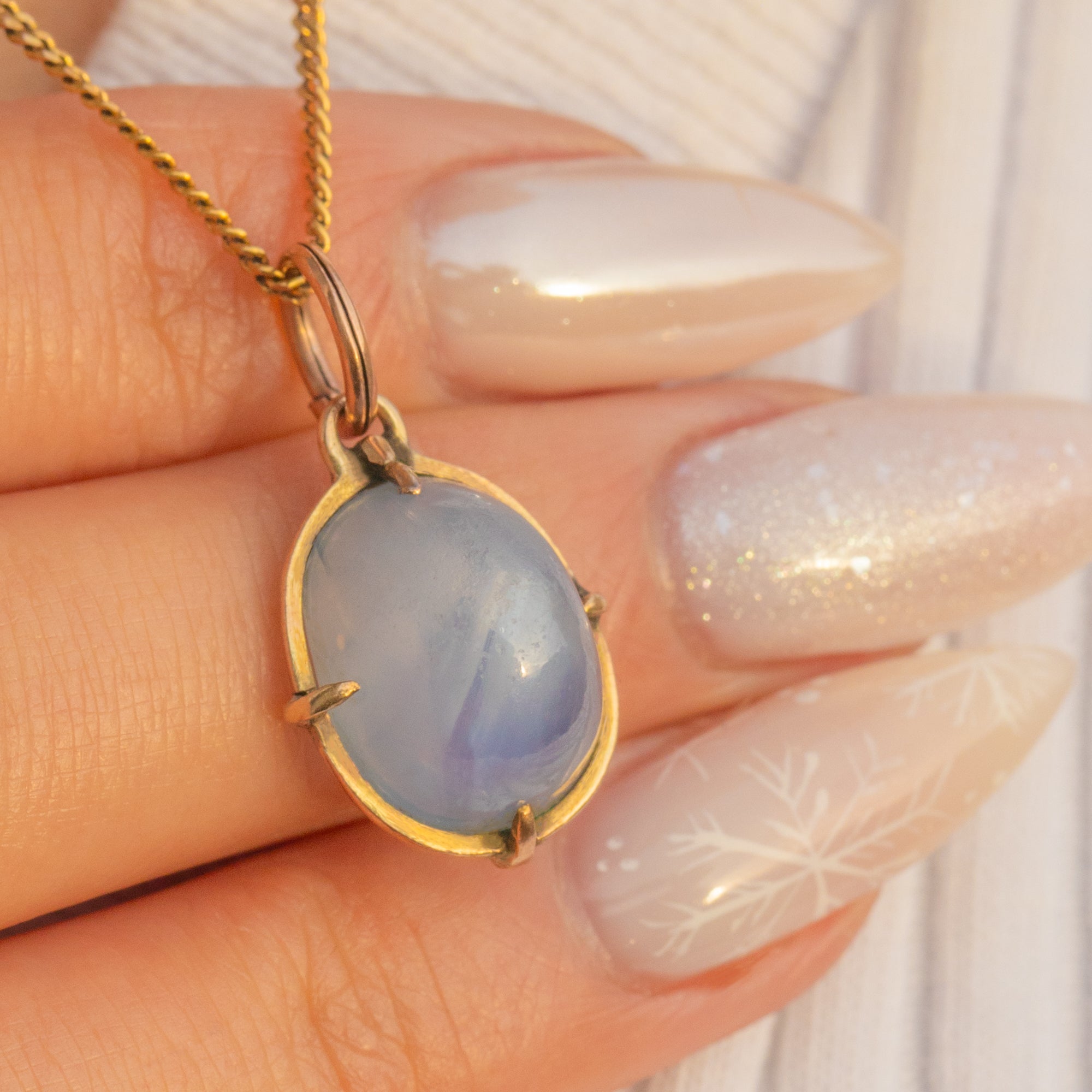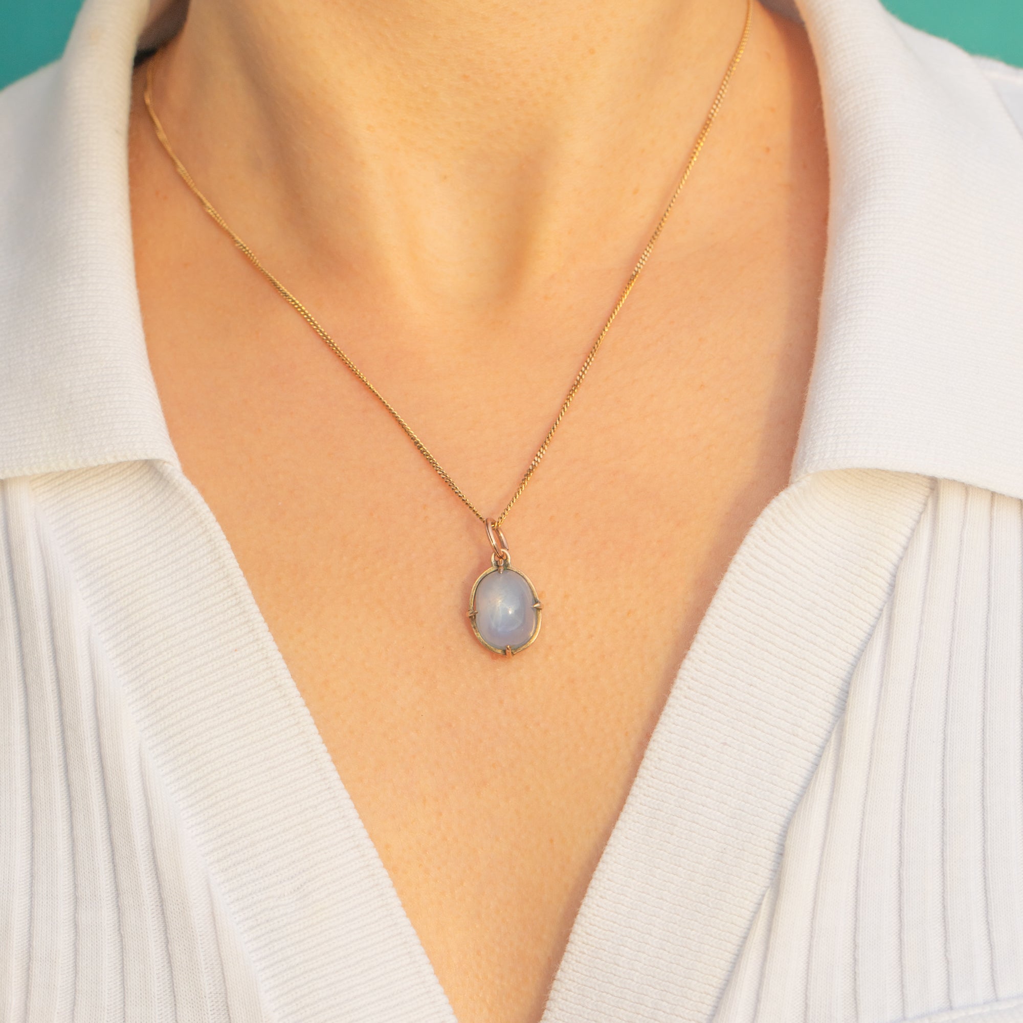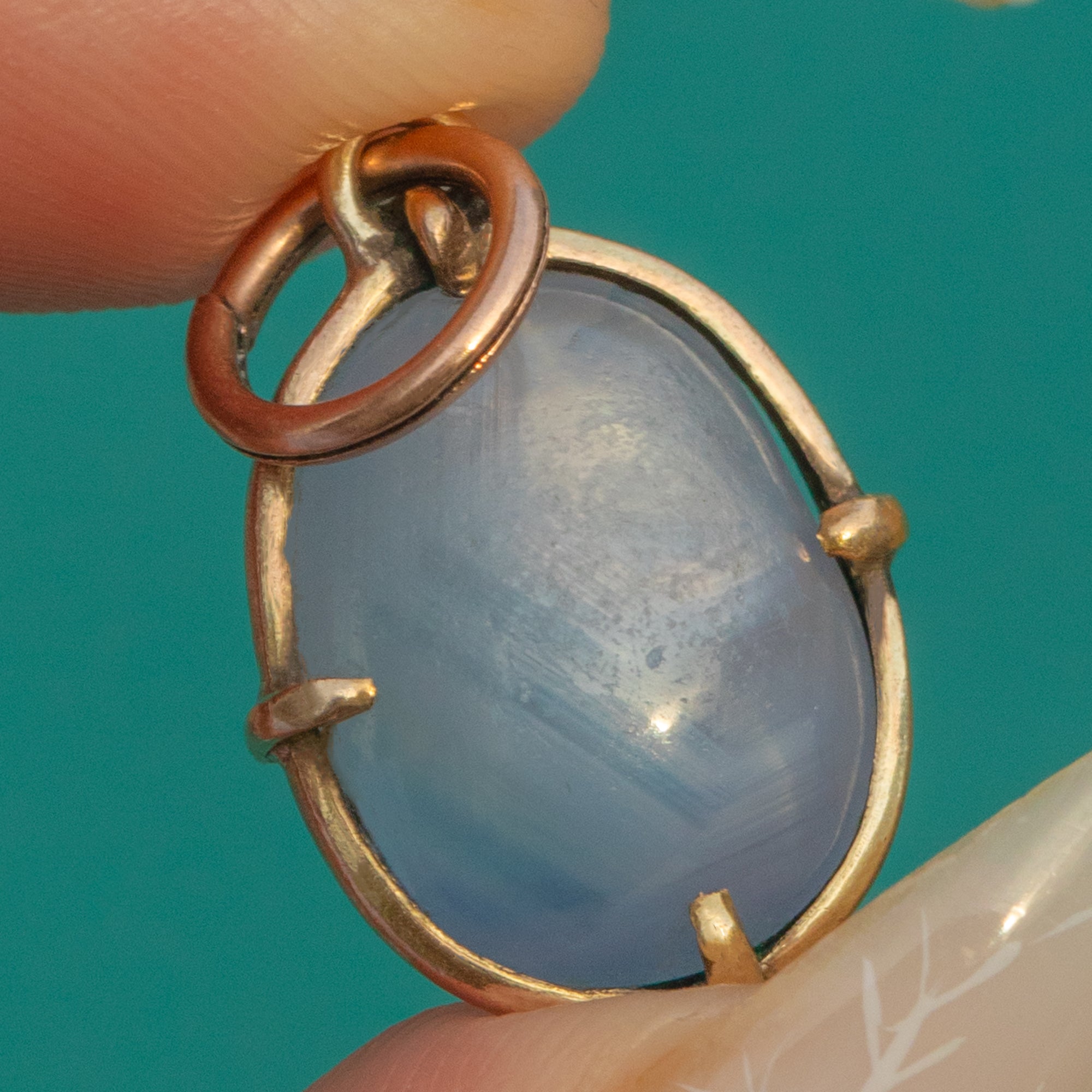 A delicate Victorian charm pendant showcasing a natural, no-heat Star Sapphire of approximately 11.00ct, set in warm 9ct Gold. The oval cabochon glows with a soft, silken luminosity in pale blue to bluish-grey, cradled by four neat claws within an open-backed collet for beautiful light play.