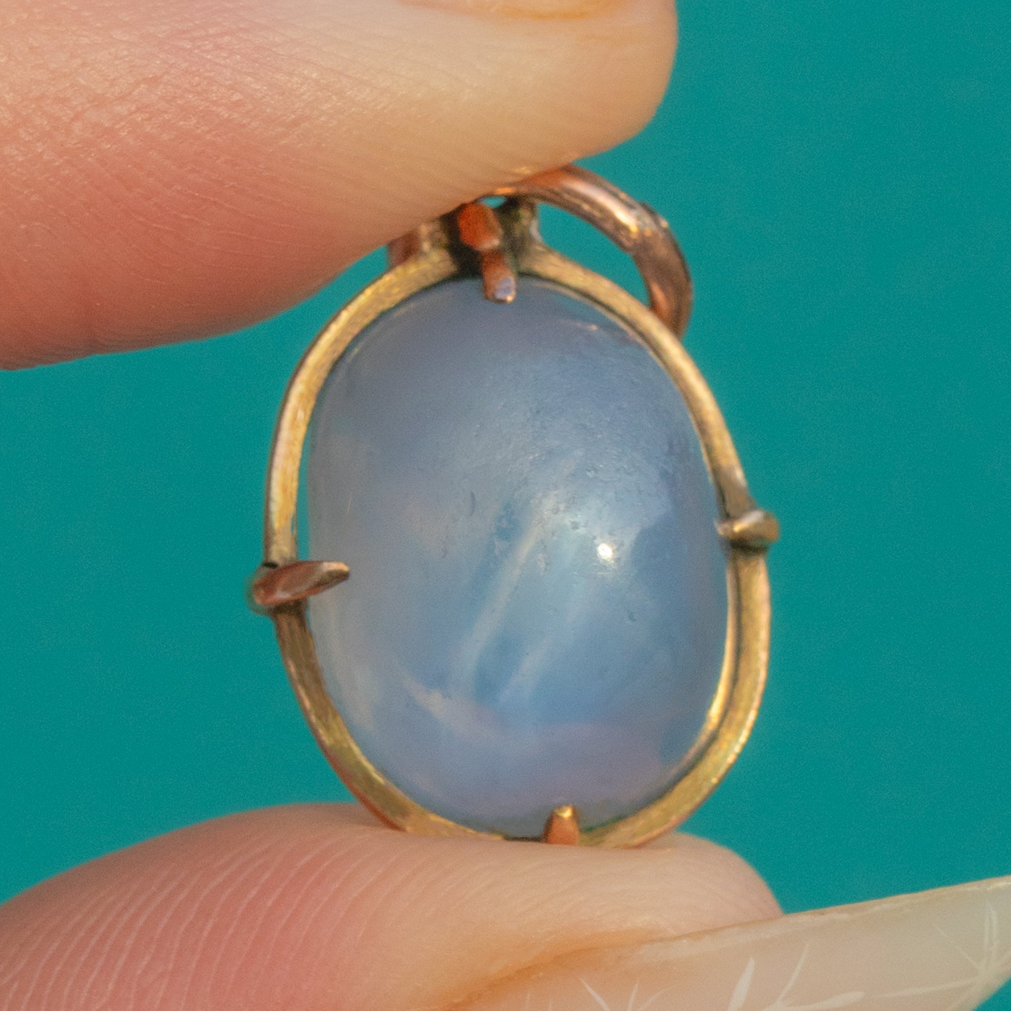 EXCELLENT: The Star Sapphire is in beautiful condition with only the lightest natural surface wear visible under magnification. The 9ct Gold setting is secure with sturdy claws and a petite split-ring bale; gentle patina and subtle tool marks are commensurate with age. No obvious chips, cracks or repairs noted.