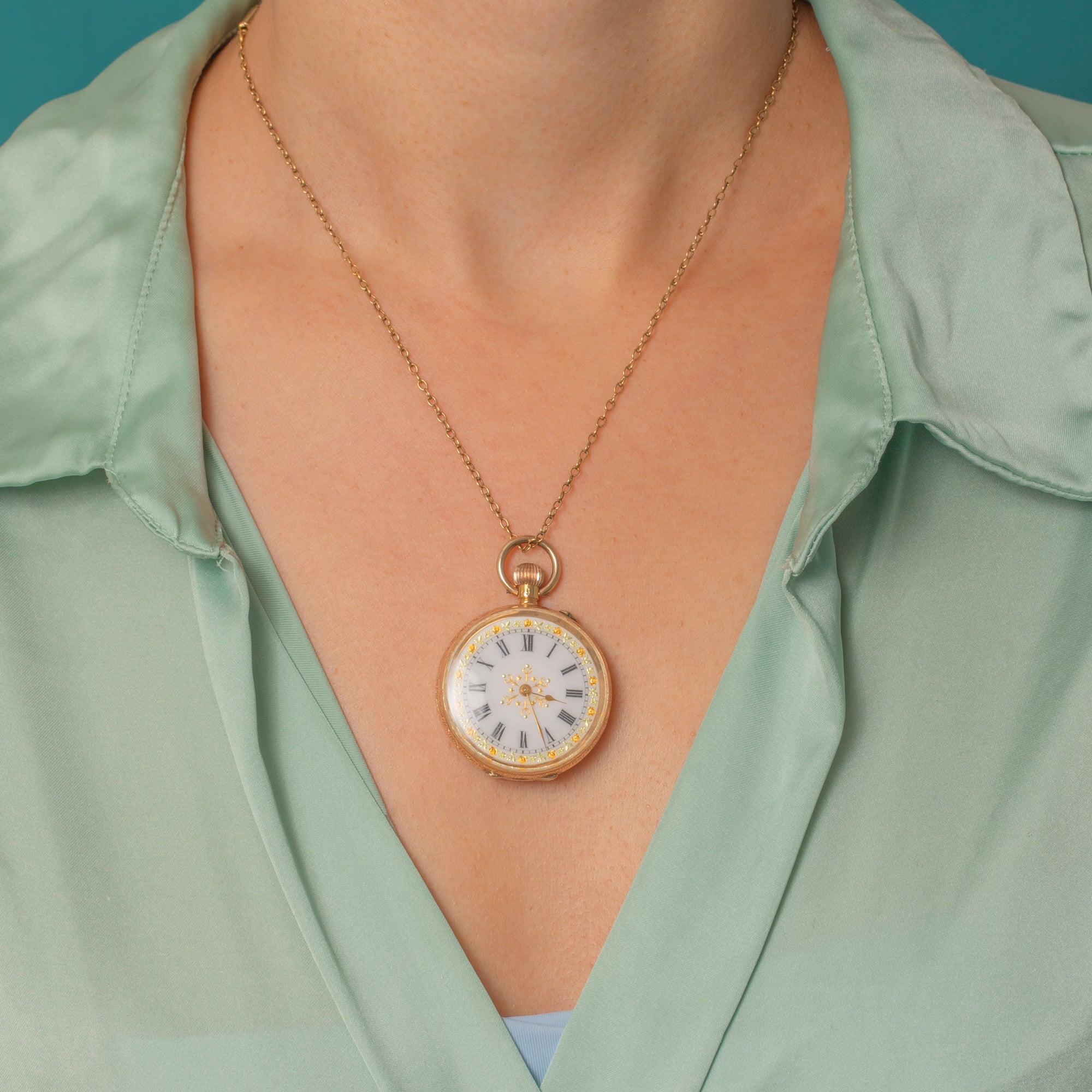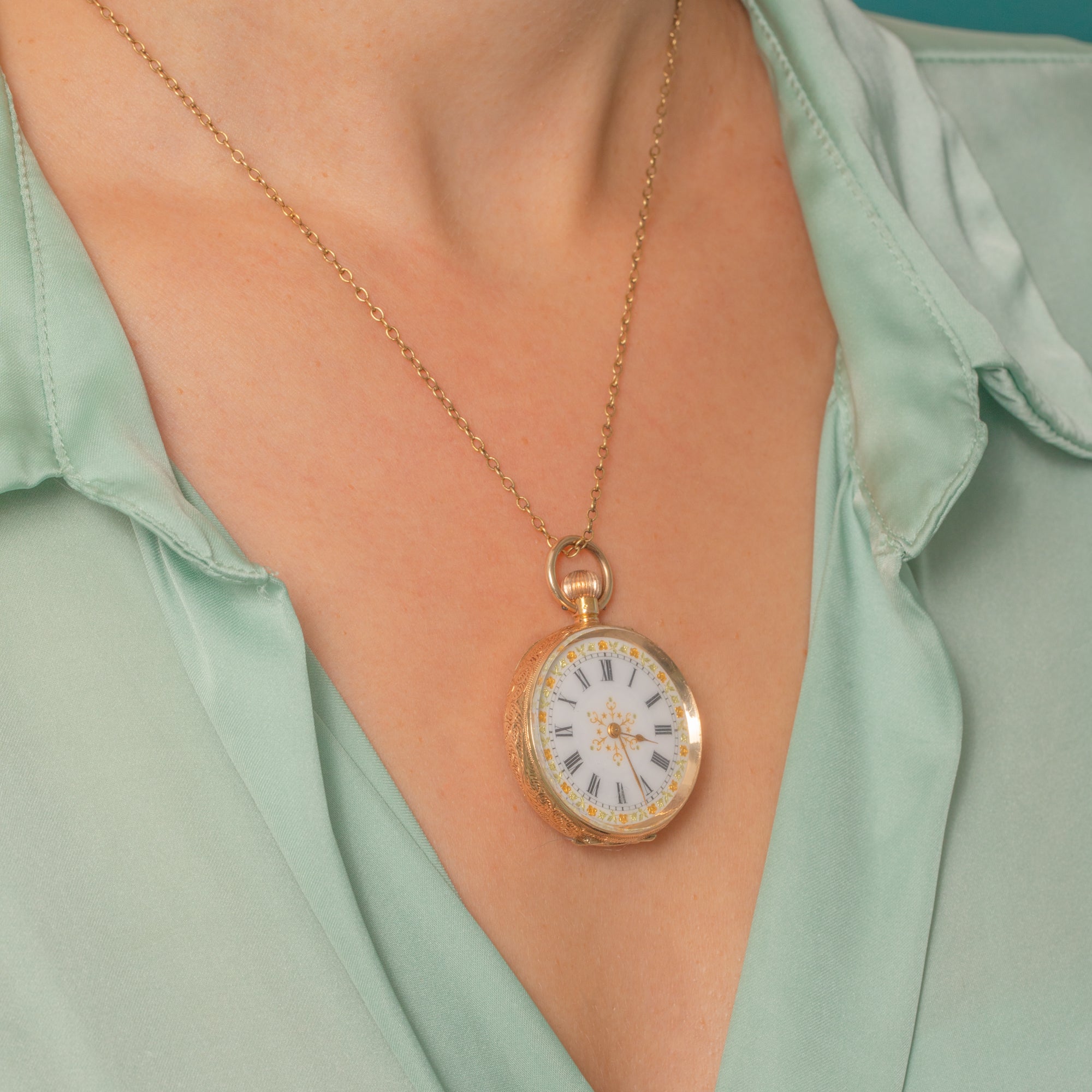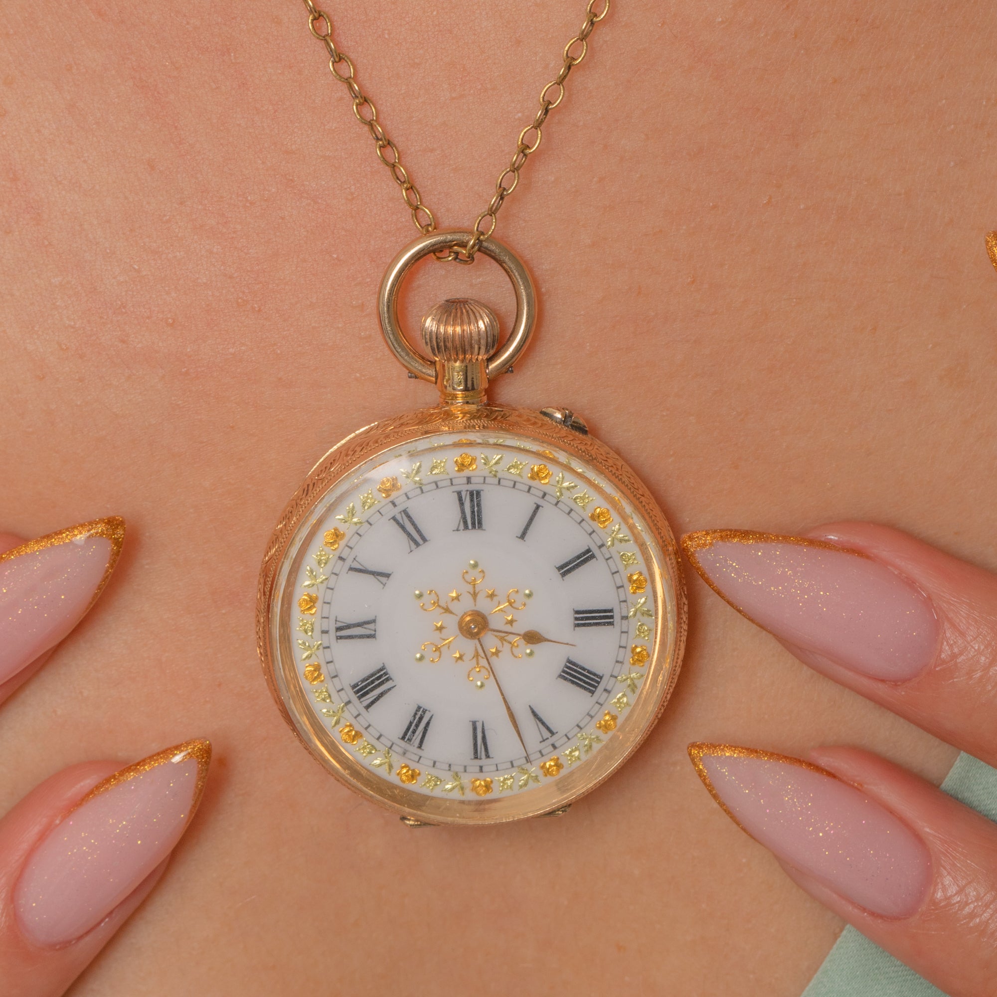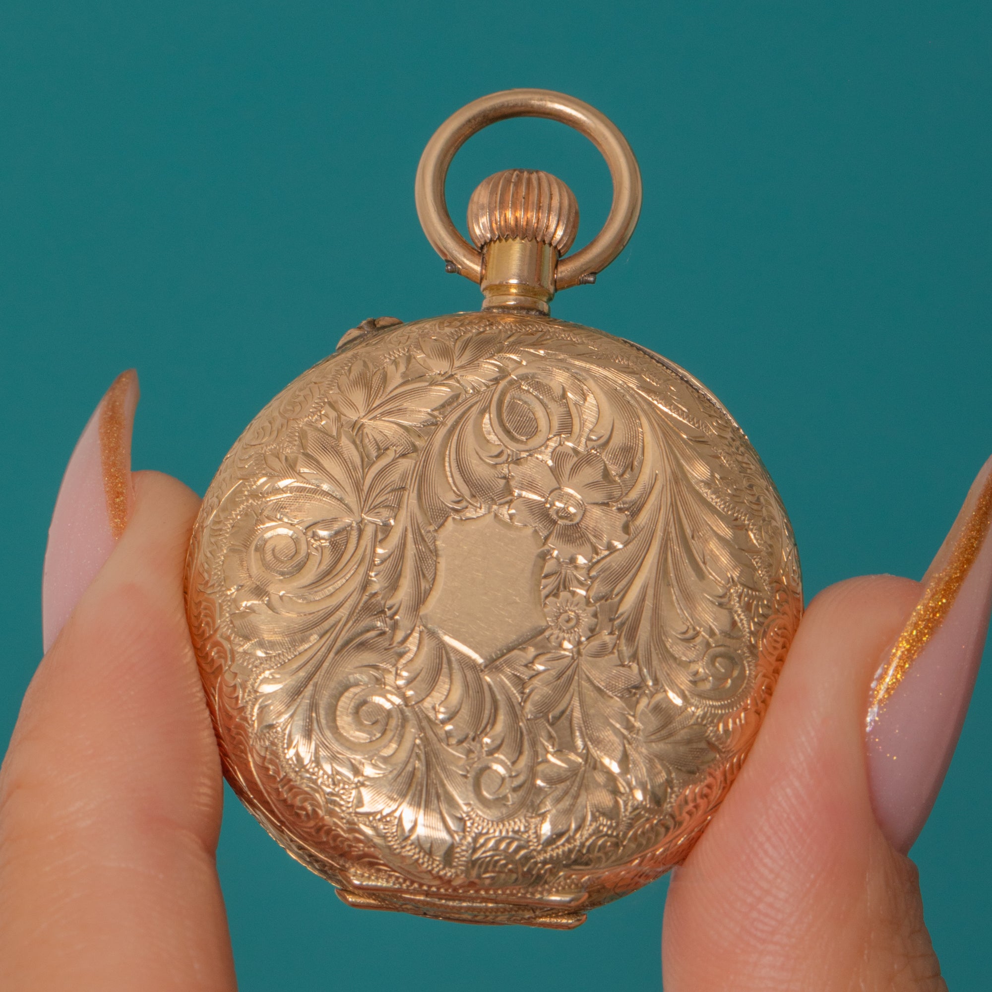 This elegant Victorian pocket watch is a beautiful example of 19th-century Swiss craftsmanship. The watch casing is crafted in 14ct Gold with a bright white Enamel dial featuring black Roman numerals and fine Gold detailing at the centre. Subtle engraving decorates the outer case, completing its refined and timeless appeal.