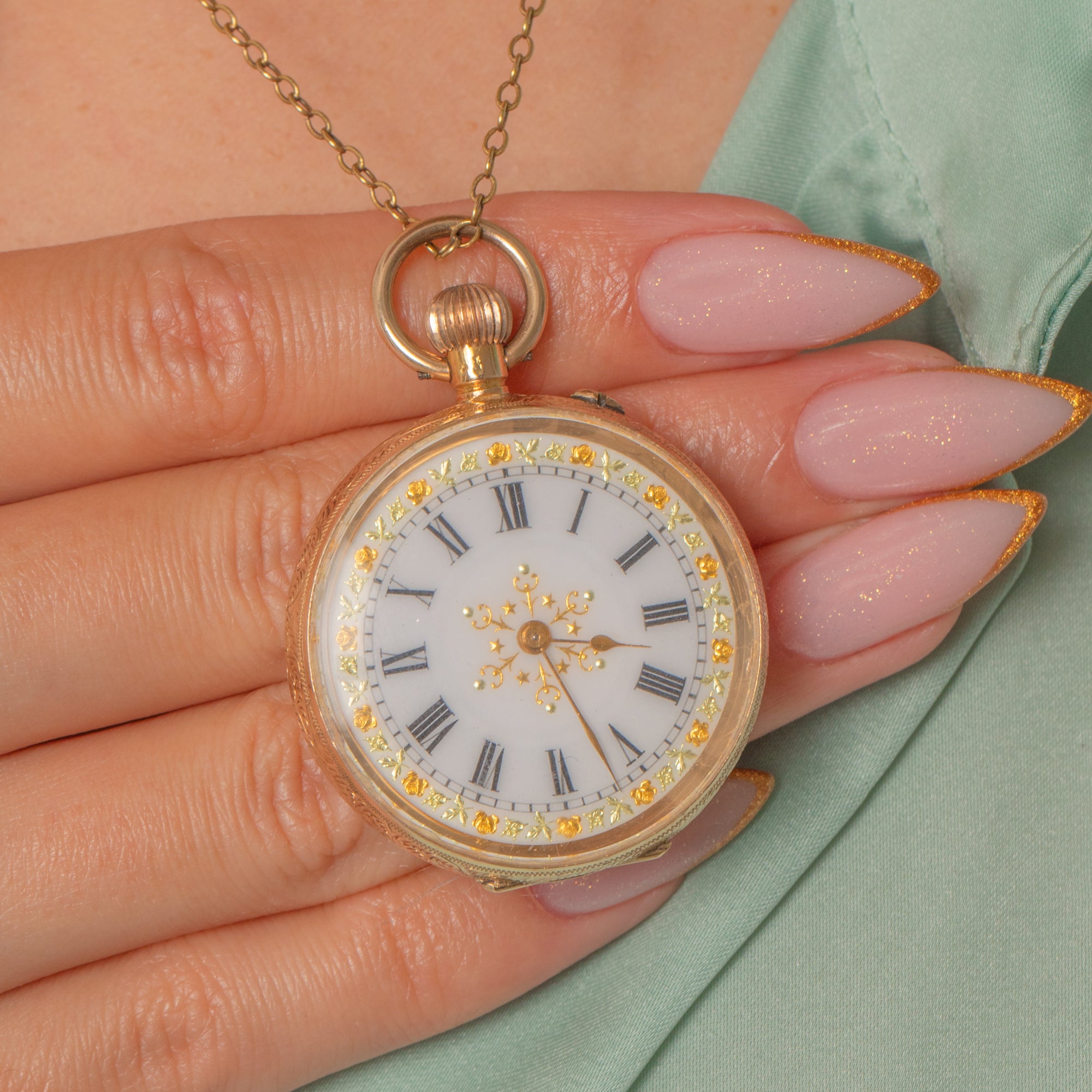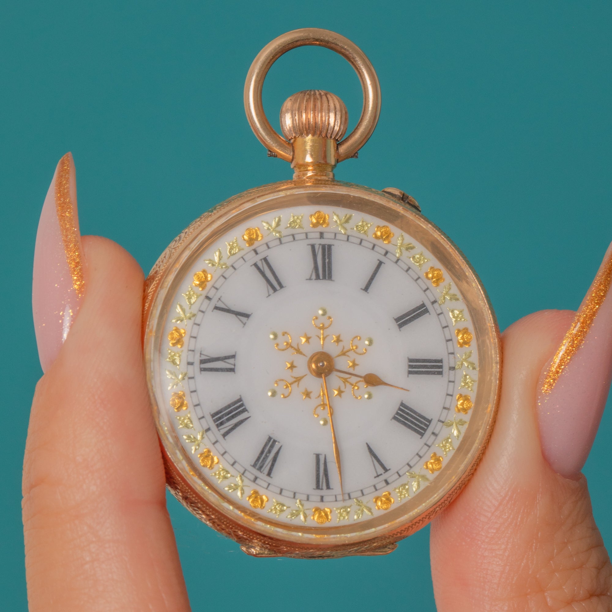 EXCELLENT: The watch casing is bright and free from dents or deep scratches. The enamel dial is pristine with crisp Roman numerals and decorative gold details intact. In full working order and keeping good time.