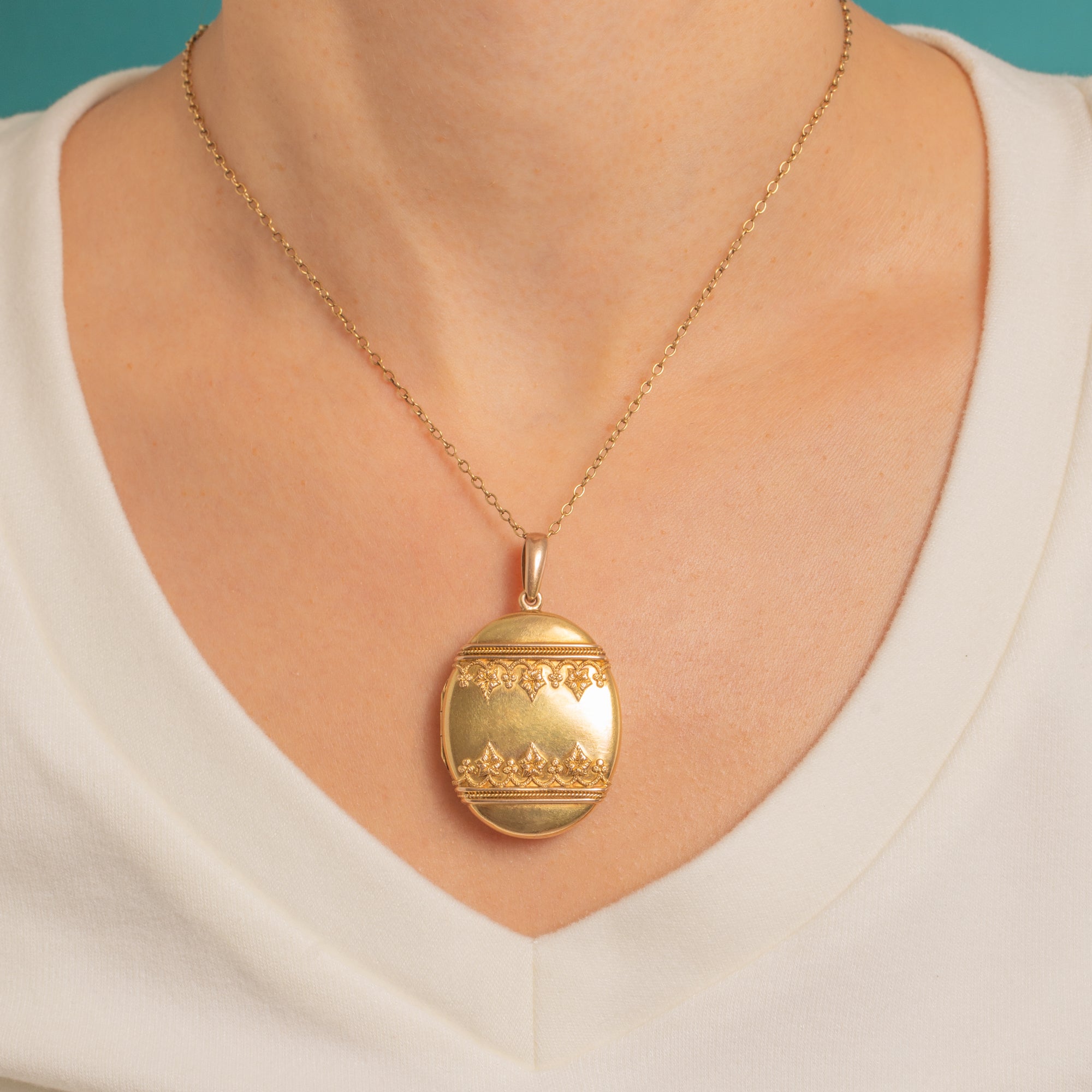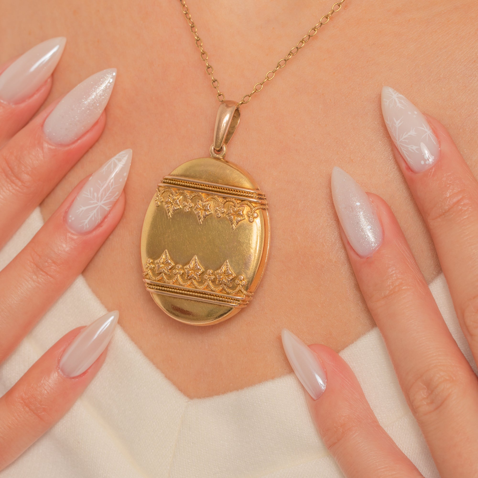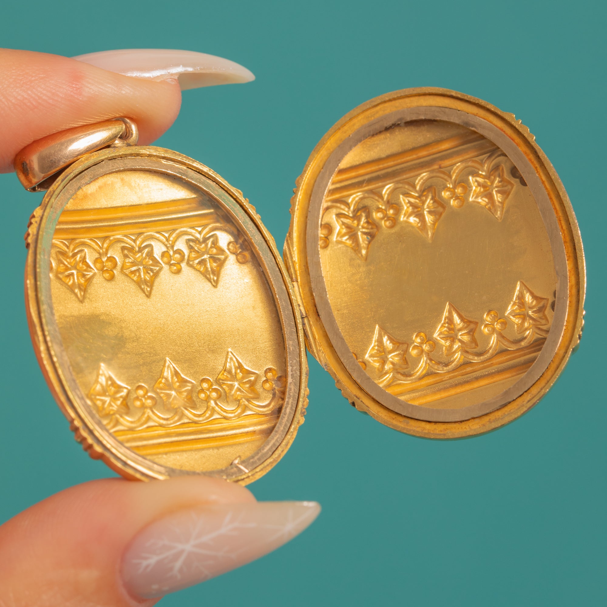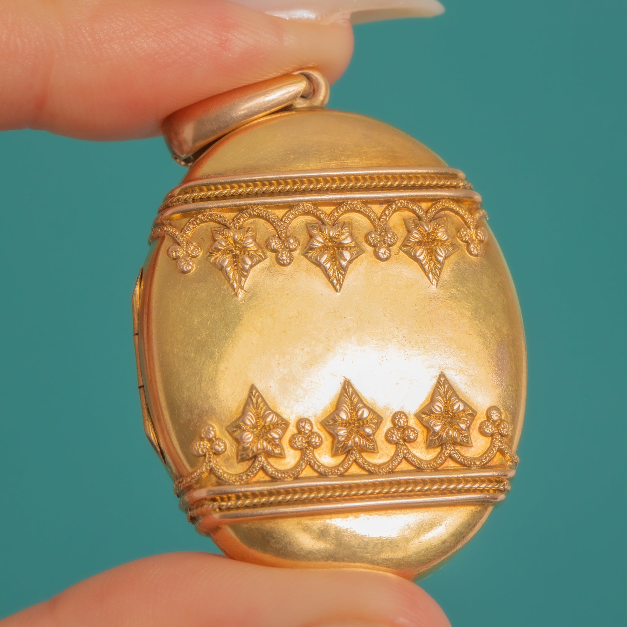 Rich with Victorian romance and Archaeological Revival flair, this antique oval locket is crafted in luminous 15ct Gold. The softly domed front is encircled by bands of rope-twist and tiny granulated beads, creating elegant trefoil and foliate friezes that feel both classical and refined. A tapered bale completes the silhouette, poised for effortless wear.
