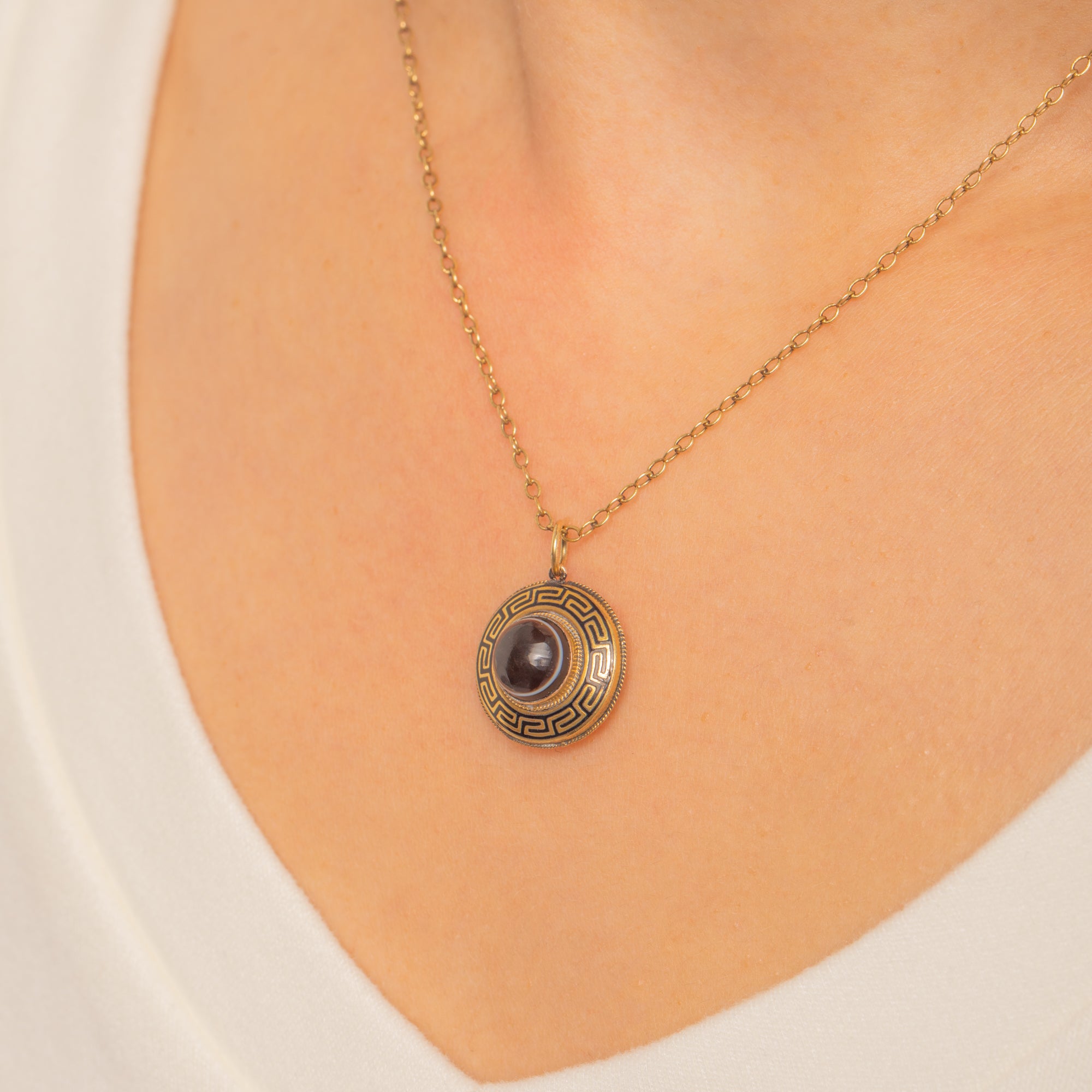 Bold and beautifully graphic, this Victorian charm pendant is crafted in rich 15ct Gold and framed by a crisp black Enamel Greek‑key meander. Fine rope‑twist borders add delicate texture, while the architectural motif brings a chic Neo‑Grec flair.