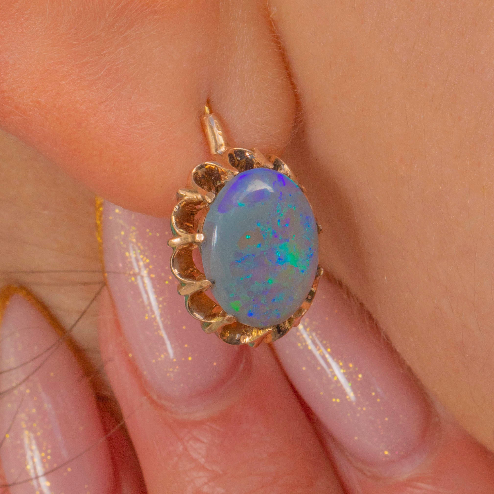 Each Opal is framed in a classic Gold buttercup setting that lets the gemstones take centre stage, creating a luxurious yet wearable pair of antique earrings with real presence on the ear. Substantial and glowing with colour, they are a fabulous choice for collectors and Opal lovers alike.